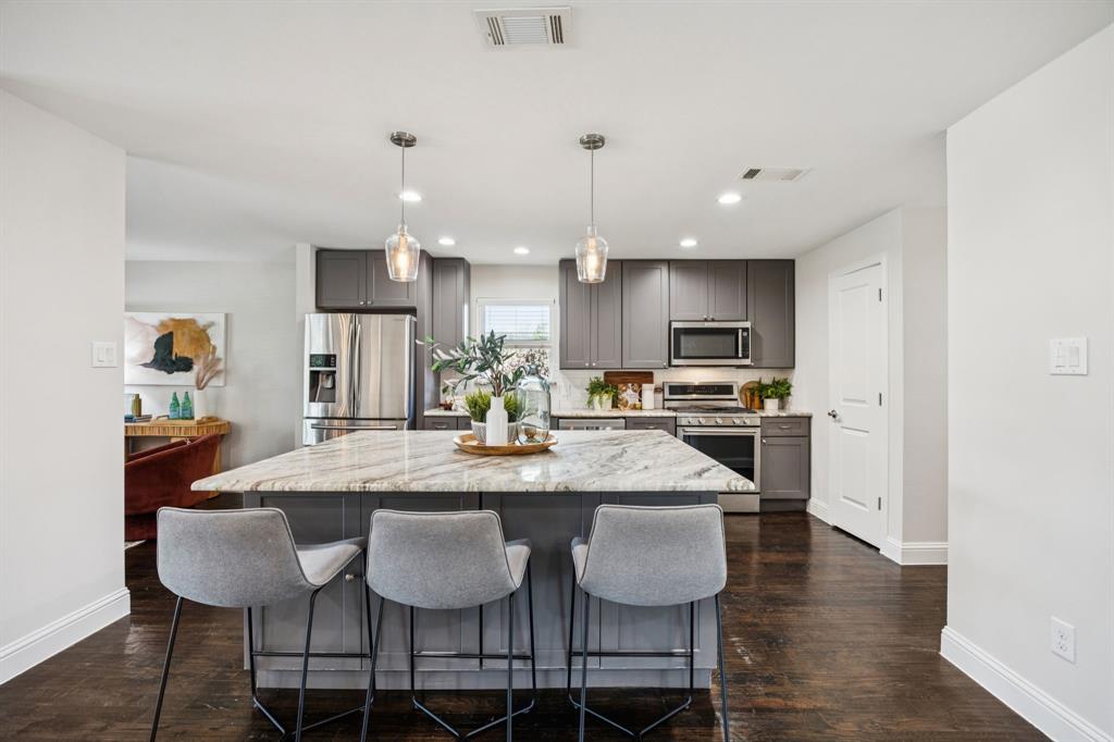 Lovingly maintained by the current owners for the past nine years, this home features a light-filled open-concept floor plan perfect for both everyday living & entertaining. The thoughtfully designed kitchen boasts shaker-style cabinets with soft-close drawers, stainless steel appliances, natural stone countertops, and abundant storage. Gorgeous hardwood floors flow throughout all living areas, kitchen & hallways, creating a cohesive feel.