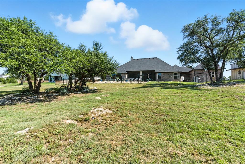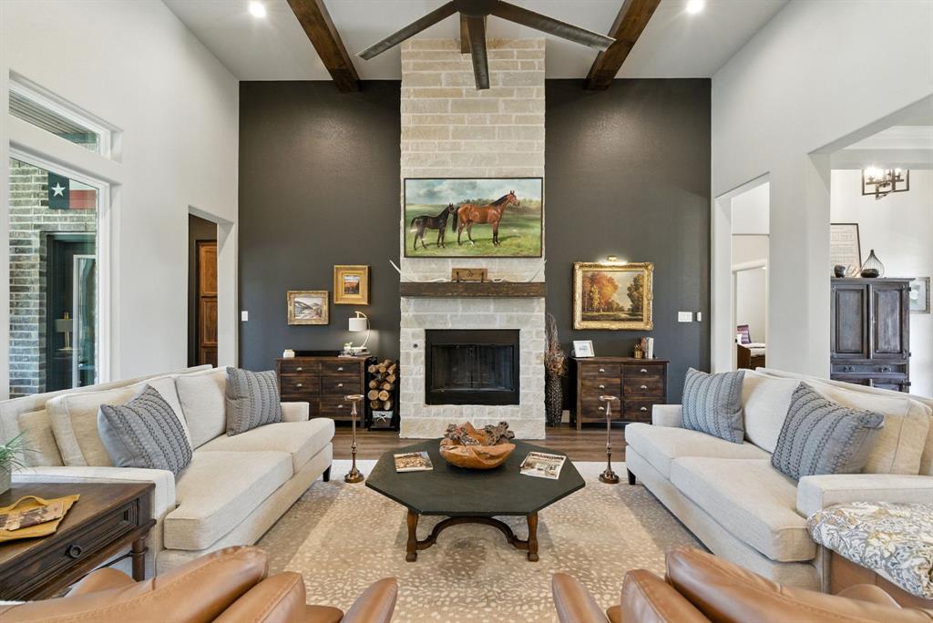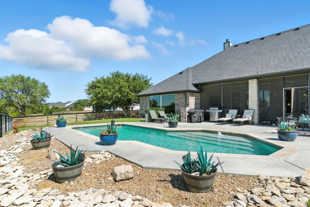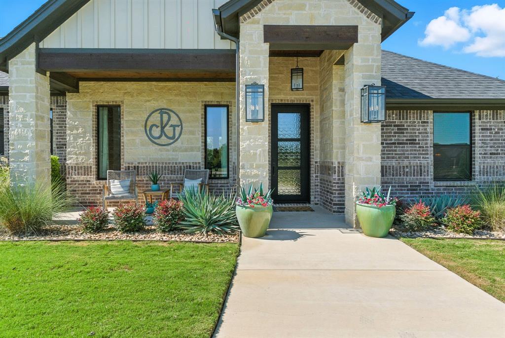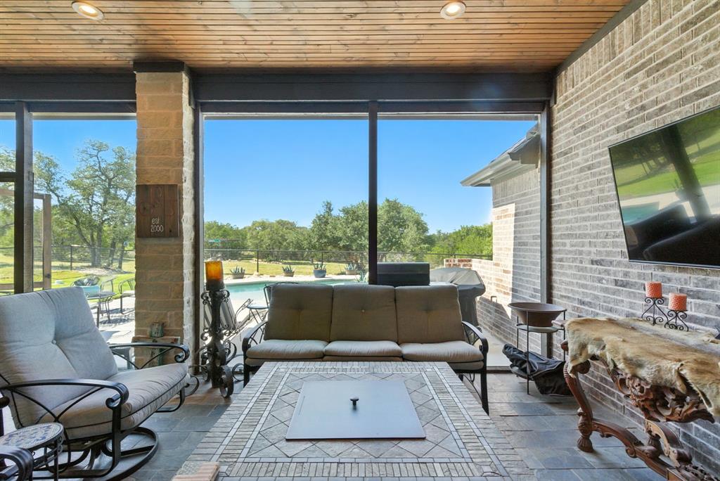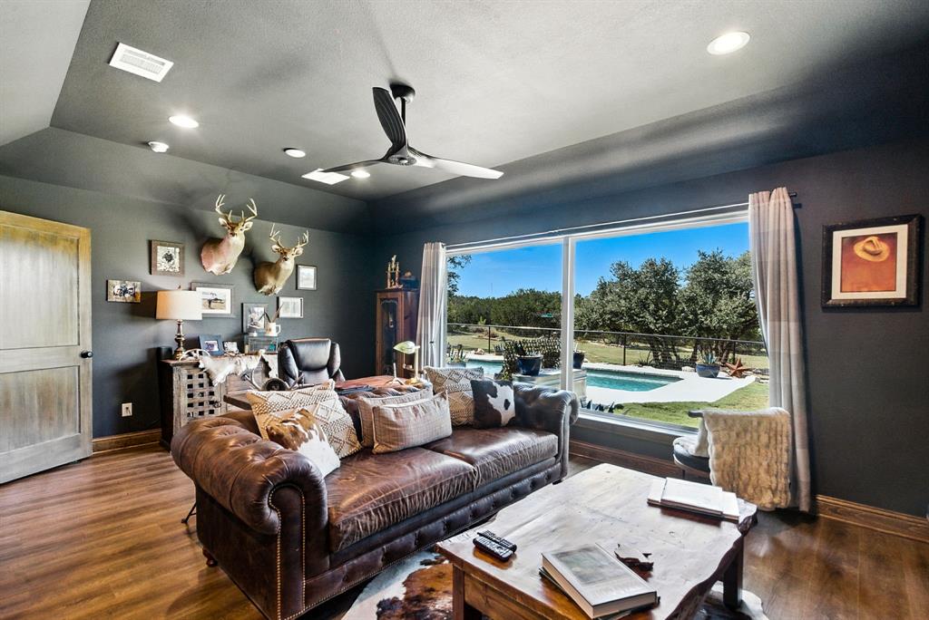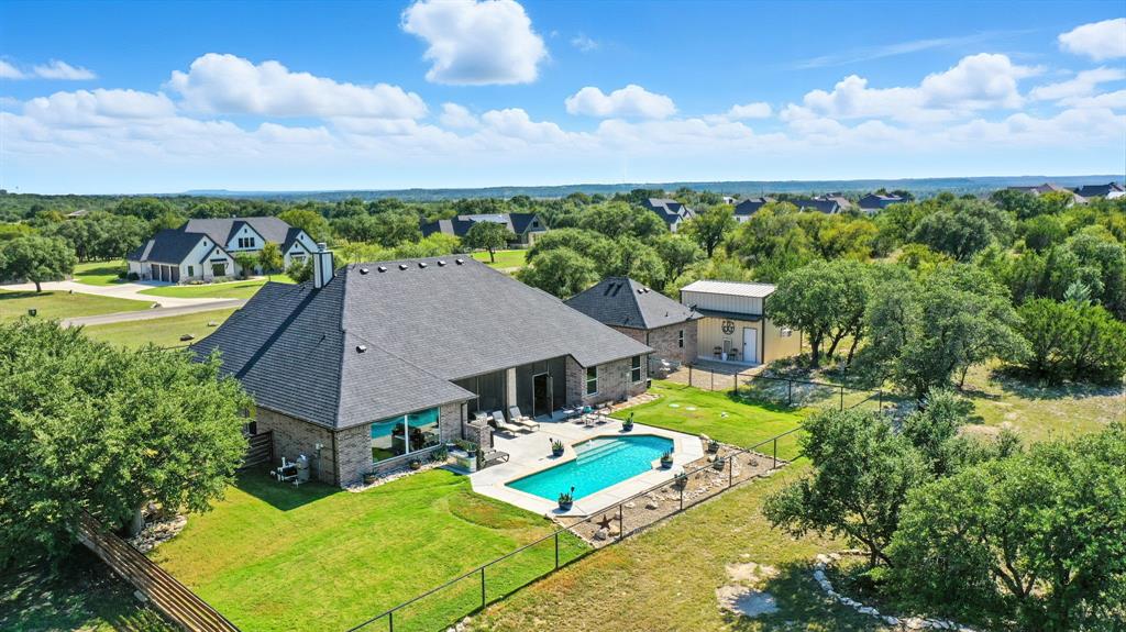 Gorgeous custom home tucked away on 2 private acres in the gated Timber View Ranch. Dramatic vaulted beamed ceilings and walls of windows set the tone for open living spaces that bring the outdoors in. The kitchen is as beautiful as it is functional, designed to inspire both everyday living and effortless entertaining. Gorgeous tile work, gas cooktop with custom wood range hood, a luxurious island and tons of cabinet space add to this wonderful kitchen. A true formal dining room to gather around the table. A striking den with a wet bar and expansive picture windows creates a perfect cozy escape. Spacious primary suite with lots of seating area and spa-like bath along with a large walk in closet and enjoy your private entry onto the back porch. Split secondary bedrooms. The beautiful screened-in porch is an inviting space for morning coffee or the perfect spot for game night. Sit out under the stars or beat the heat in the sparkling pool! Guests will love the charming 1-bedroom, 1-bath guest quarters with full kitchen, living, and laundry room with private entry. 16x20 workshop with extra storage in the loft. Hit the home gym or embrace your adventurous side with serene walking trails winding through the trees creating the the perfect place to unwind in nature. Impeccably maintained inside and out. Just minutes from both Weatherford and Granbury.