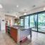 The open-concept interior features a highly functional central kitchen equipped with a wall of glass doors leading to a covered deck, offering a stunning view of the courtyard. The kitchen is a chef's dream, complete with professional-grade stainless steel appliances. The large center island boasts a marble countertop, a prep sink with a disposer, built-in display shelving, ample storage, and a sit-down serving bar.