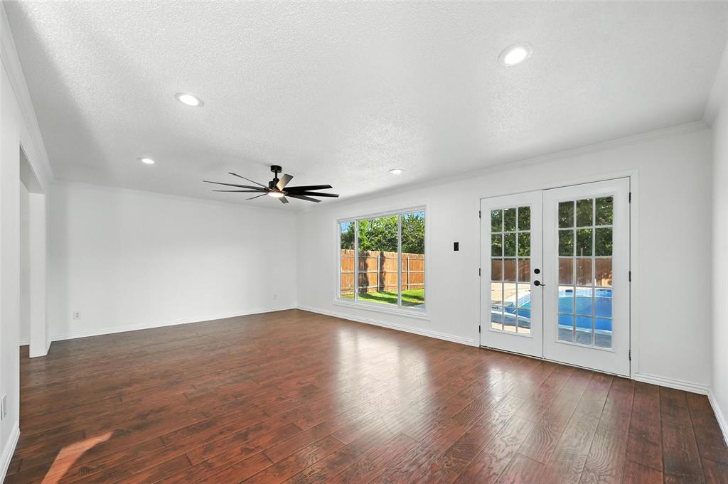 You must step inside to appreciate this home. 4 bedrooms, 2 full bathrooms and 2 spacious living areas, a large dining room, plus a swimming pool and a 2-car garage. This home features 1 of the largest lots in the neighborhood with enough space for a pool and green space in the back yard. Beautiful tile and wood laminate flooring with carpet in 1 room. Fireplace in the living room. Large window in the den to overlook the back yard. 2 sets of french doors. Plenty of parking with the addition of the driveway and garage. Updated. Flooring and fixures replaced in 2025. Ceiling fans in both living areas and all 4 bedrooms. Foundation work completed in 2025 with transferrable warranty from Lima Foundation. Garland address in Richardson ISD. Camera system remains with the home.