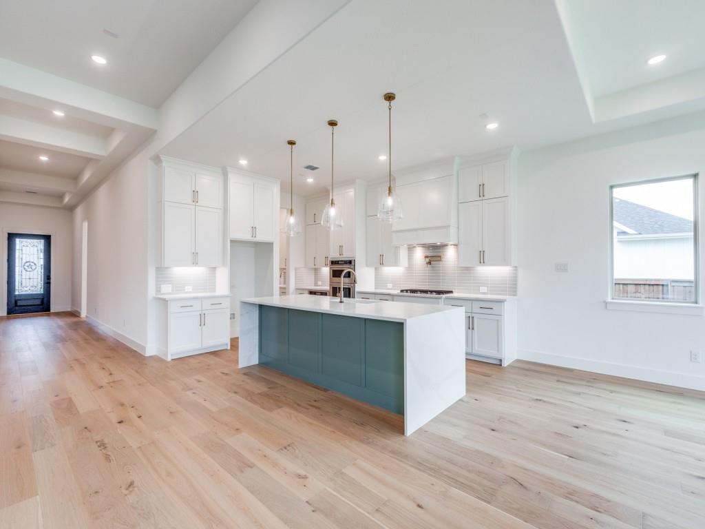 RISLAND HOMES ARIYA floor plan. Honey turn the car around! Rare 4-bdrm one-story! Head-turning elevation crafted beautifully with brick, stone and cedar accents for this jaw dropping home located on an oversized 90’ x 140’ interior lot! The remarkably wide foyer is embellished with tray ceilings and the perfect entry to decorate to greet your guests. Turn toward the kitchen and indulge in luxury finishes, with stainless steel KitchenAid appliances, pot filler, morning kitchen with second sink, oversized pantry, and an impressively sized waterfall island in the center of it all - simply chef's kiss! The kitchen is complimented being open to the casual dining space. Windows surround the common gathering spaces allowing an incredible amount of natural light to shine through. The family room features a telescoping sliding glass door which leads out to an ample sized patio and a larger-than-life backyard! Raise eyebrows with this primary suite! Enhanced with gorgeous windows and a bath fit for anyone who loves to treat themselves. Enjoy your own at home spa with the floor to ceiling tiled shower finished with rainfall shower head, traditional shower head, and built in seating. Or grab some bubbly and get the bubbles going - relax while you soak all your worries away in the free-standing tub! Hardwood floors are included throughout all common areas including foyer, owners' entry, hallways, kitchen, family room and casual dining. Nicely sized secondary bedrooms. Heading out for the day? Grab your coat at the mudroom on your way into the three-car garage where your electric vehicle has been on charge all night, thanks to the 220V 50amp power outlet that's included! New Prosper ISD Elementary school located within the community now OPEN! Enjoy amenities with clubhouse, infinity pool, work out room, yoga lawn, playground, pond and walking trails. See this home any time dawn to dusk with the NTER NOW system. READY NOW!