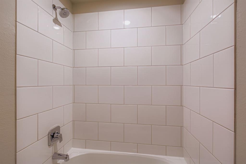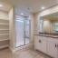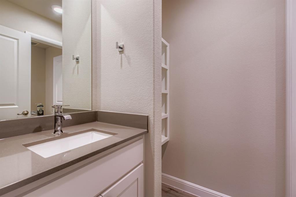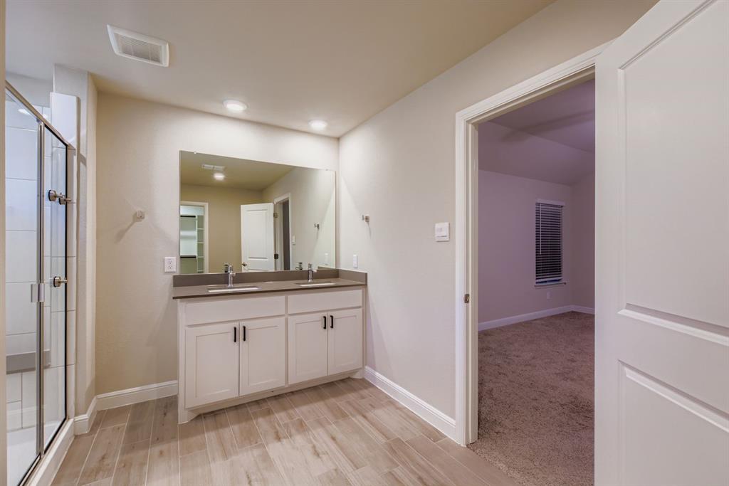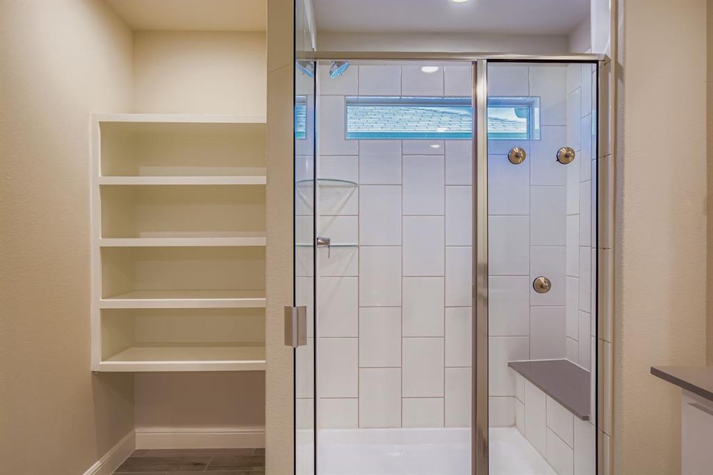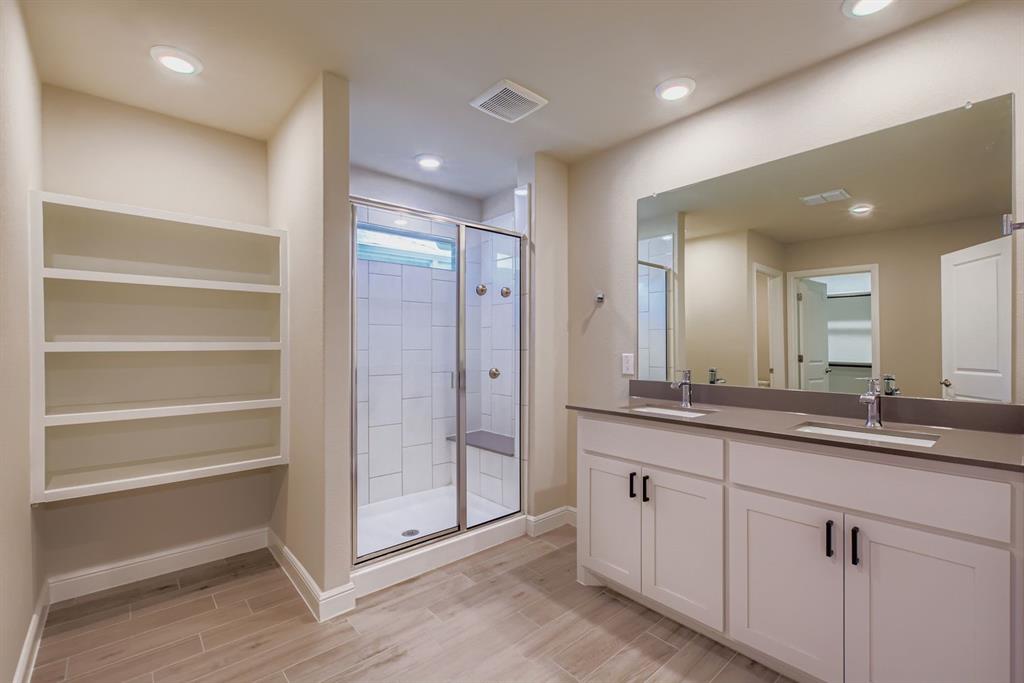 The primary suite offers a private retreat with dual sinks, a walk-in shower, and a generous walk-in closet. Both bathrooms include built-in shelving, perfect for baskets, linens, or additional storage. The secondary bathroom features a tub shower combo.