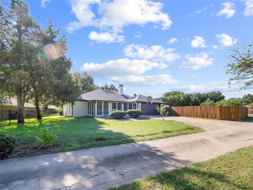 Move-in ready East Richardson home in University Estates North featuring a spacious living room with skylight and fireplace, plus an additional flexible living area. The gourmet kitchen offers double ovens, a microwave, under-counter lighting, ample counter space, pantry and built-in cabinets, with both formal and breakfast dining areas adjacent. A sliding door leads to the patio, large fenced yard and shed. The house includes a utility room, guest half bath, and private primary suite with walk-in closet. Two guest bedrooms share an updated bathroom. The screened porch, set up for a hot tub, overlooks the backyard and greenbelt.