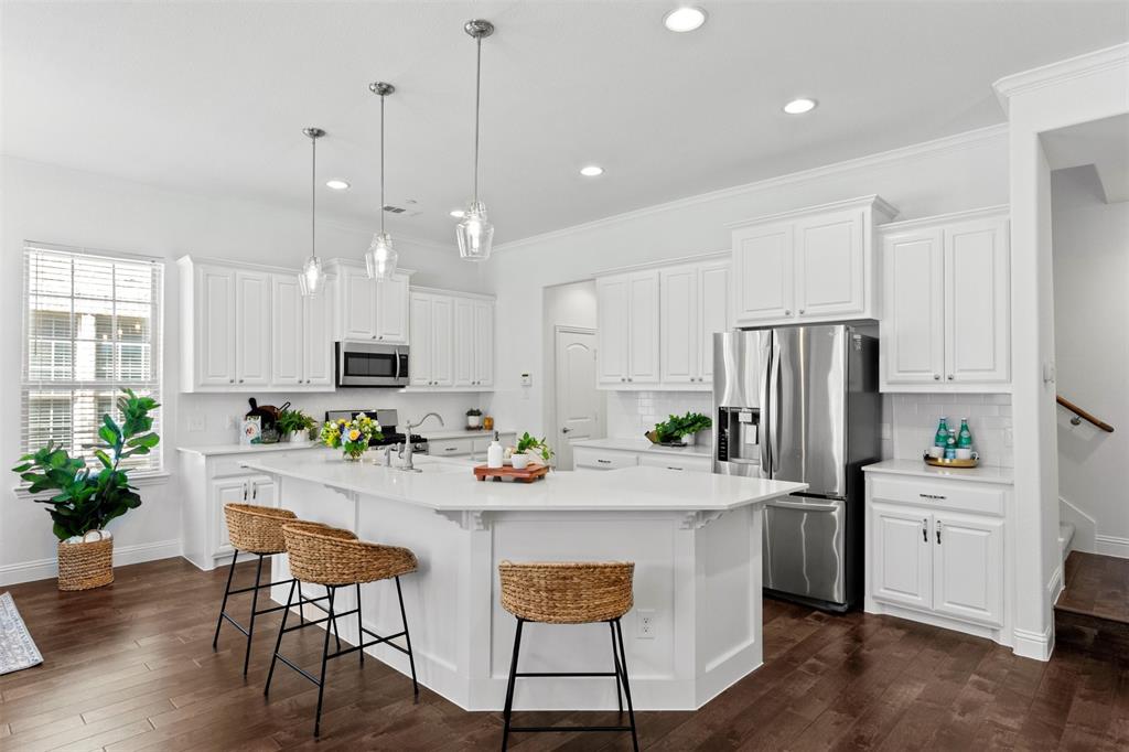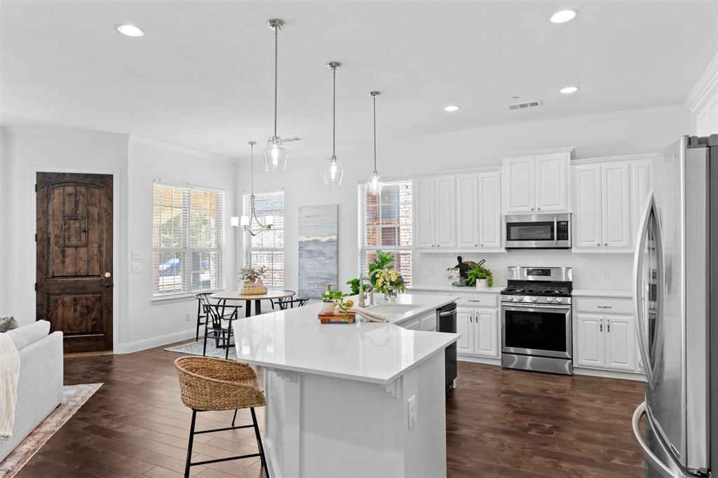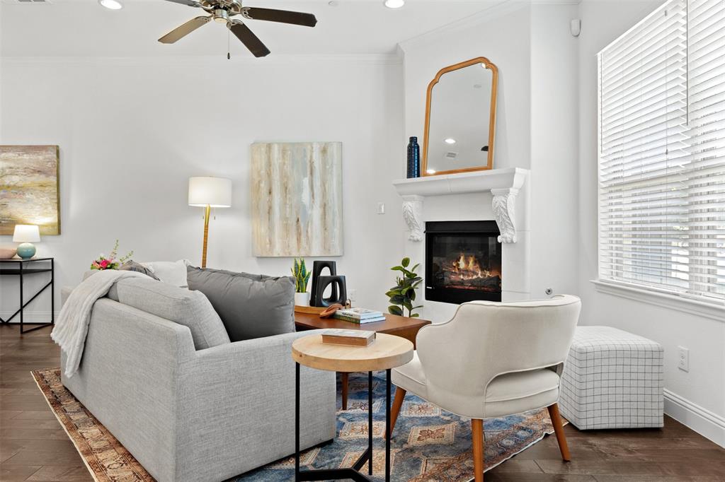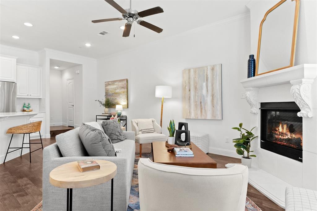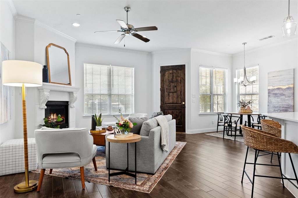 Welcome to this stunning light-filled and airy two-story townhome in the sought-after Dominion community of Irving. Ideally located just off George Bush and Belt Line, you’ll enjoy effortless access to major highways, shopping, dining, entertainment, and DFW Airport—making everyday living convenient and connected. Inside, the open floor plan is designed to maximize space and natural light, with large windows, hardwood floors, and a cozy fireplace that anchor the main living area. The kitchen combines style and function with white cabinetry, stainless steel appliances, and a spacious island that flows seamlessly into the dining and living spaces, creating the perfect setting for both entertaining and relaxed evenings at home.