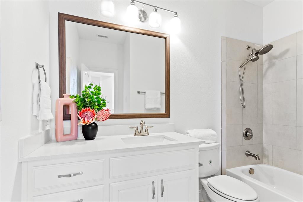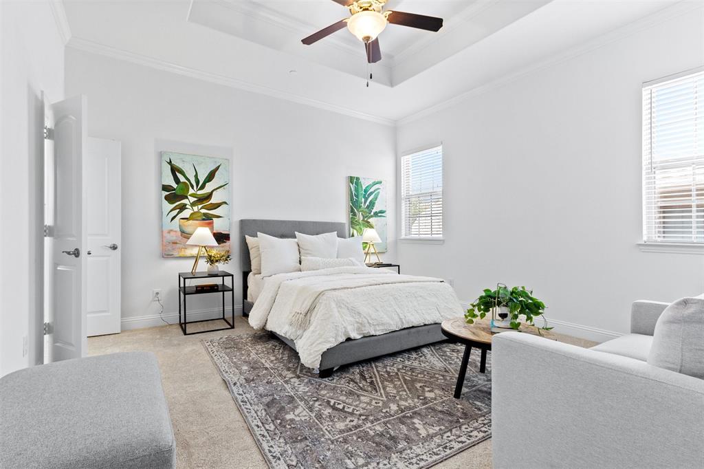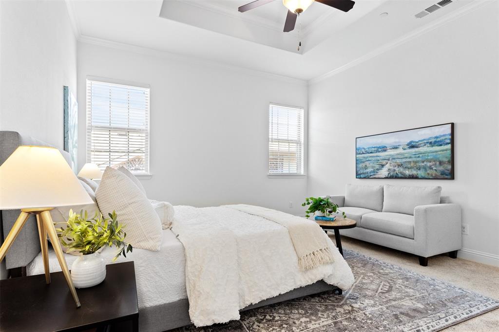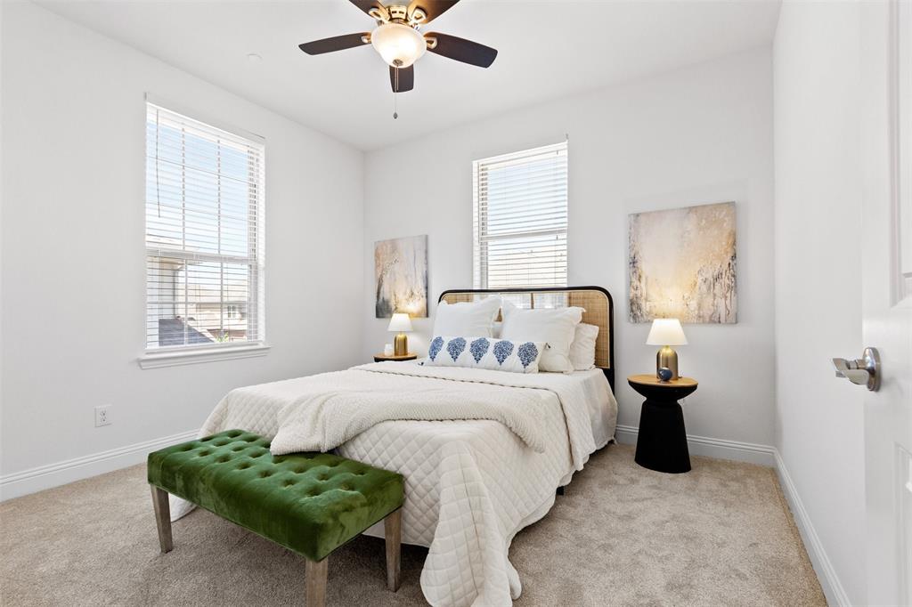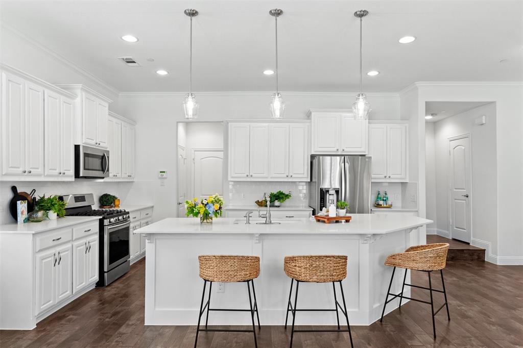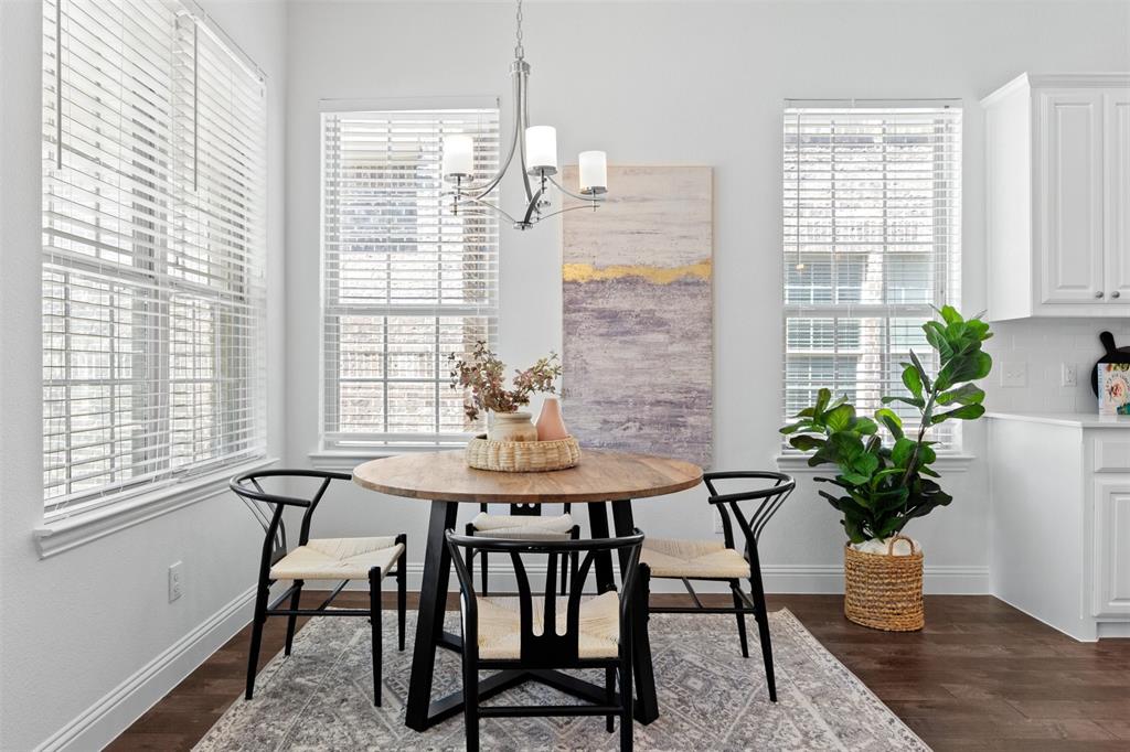 Welcome to this stunning light-filled and airy two-story townhome in the sought-after Dominion community of Irving. Ideally located just off George Bush and Belt Line, you’ll enjoy effortless access to major highways, shopping, dining, entertainment, and DFW Airport—making everyday living convenient and connected. Inside, the open floor plan is designed to maximize space and natural light, with large windows, hardwood floors, and a cozy fireplace that anchor the main living area. The kitchen combines style and function with white cabinetry, stainless steel appliances, and a spacious island that flows seamlessly into the dining and living spaces, creating the perfect setting for both entertaining and relaxed evenings at home.