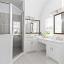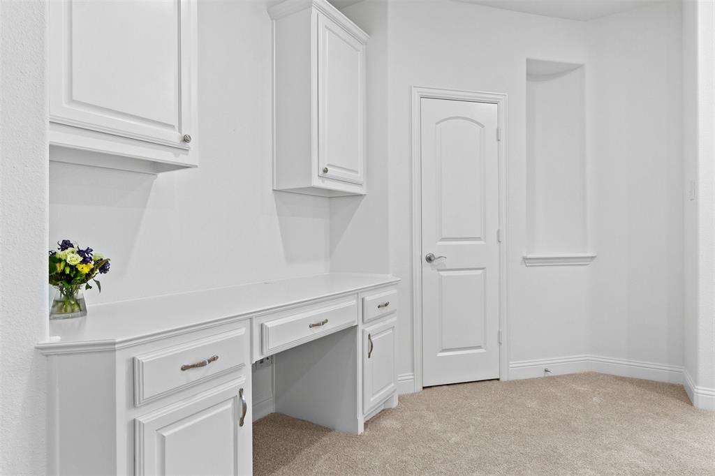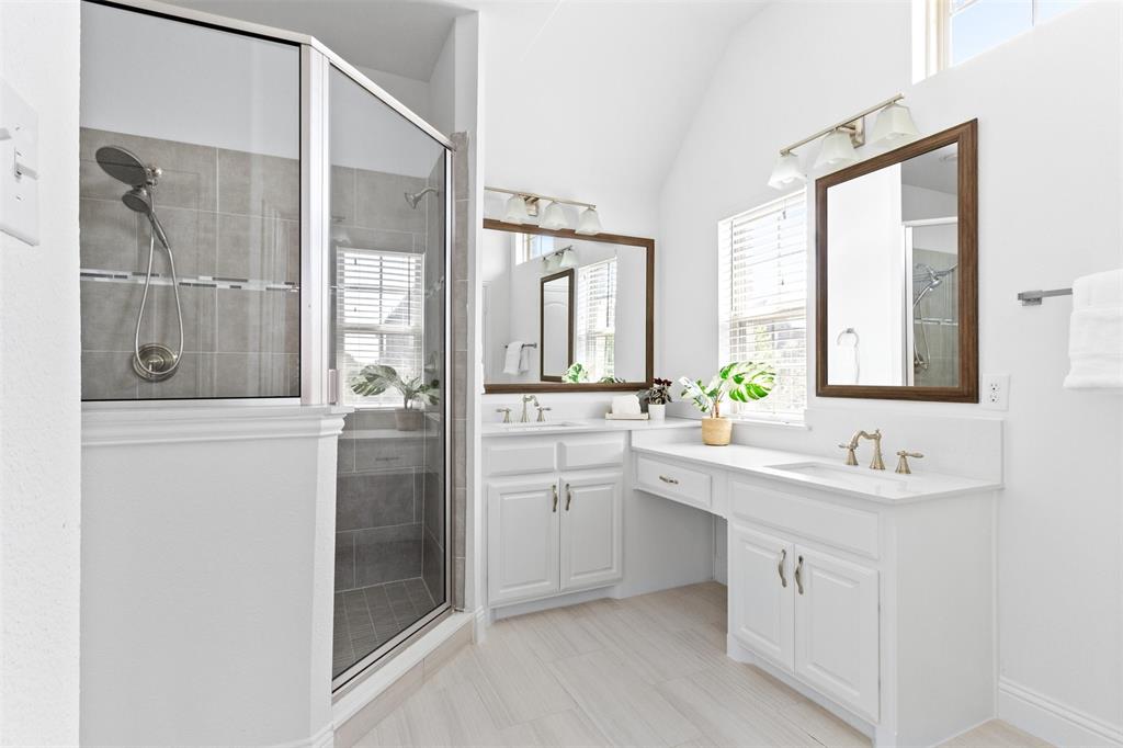 Upstairs, a built-in desk provides a dedicated home office or study nook, while the primary suite offers a private retreat with vaulted ceilings, a generous walk-in closet, and a spa-inspired bath featuring dual vanities and a walk-in shower. Two additional bedrooms and a full bath provide flexible living options for family or guests.