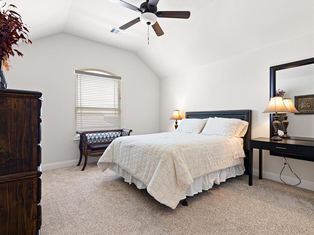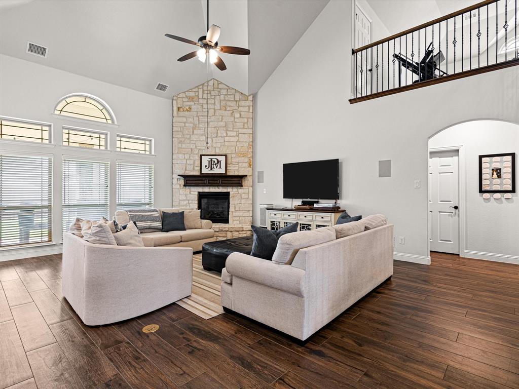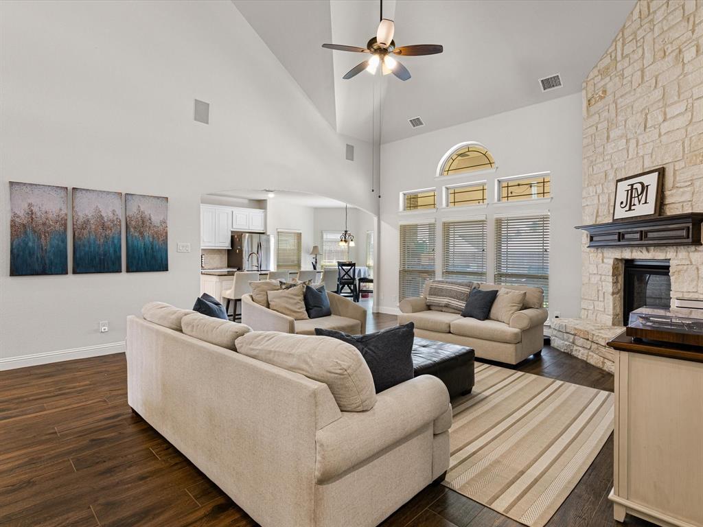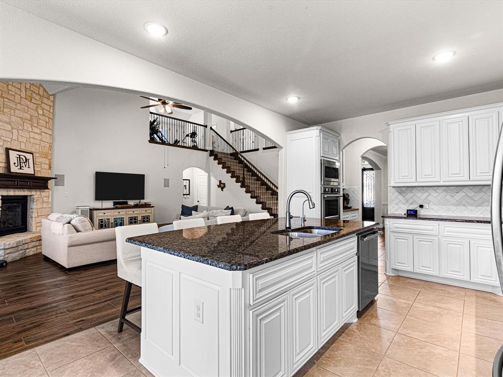 Welcome to this well maintained charming home located in the highly sought-after Marine Creek Ranch community. This spacious 5-bedroom, 3.5-bathroom home offers 3399 sq ft of thoughtfully designed living space. The open-concept floor plan effortlessly blends the kitchen, dining, and living areas, making it ideal for both everyday living and entertaining guests. With ample room for all your storage and organization needs, this home features a custom, extended-length garage, three attic accesses, an extra-large covered porch, and generous walk-in closets throughout. Inside, the living area is highlighted by a cozy gas fireplace and ceiling fans in every room to provide year-round comfort. High ceilings and expansive windows allow natural light to flood the space, creating a bright and welcoming atmosphere. The kitchen is a chef’s dream, complete with granite countertops, an oversized island, double ovens, and a walk-in pantry. The private primary bedroom, located on the first floor, offers a peaceful retreat. Upstairs, you’ll find a versatile flex space, perfect for a playroom, second living area, or home gym. This home also includes a dedicated office, which can be used for work or converted into additional flex space, depending on your needs. Whether you require a quiet space for productivity or a multi-purpose room, this area offers endless possibilities for customization. Situated within walking distance of the lake, community pool, and a brand-new park, this home enjoys a prime location with easy highway access. Just 10 minutes from downtown Fort Worth, you’ll have quick access to shopping, dining, and entertainment. Extended garage offers project workspace in addition to parking! Don’t miss your chance to own this stunning home in an unbeatable location.