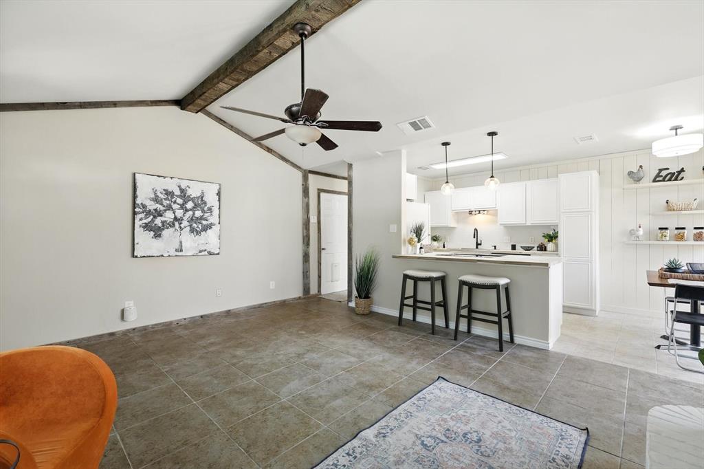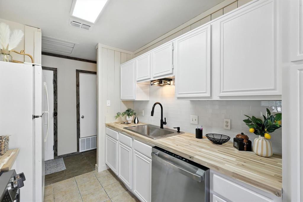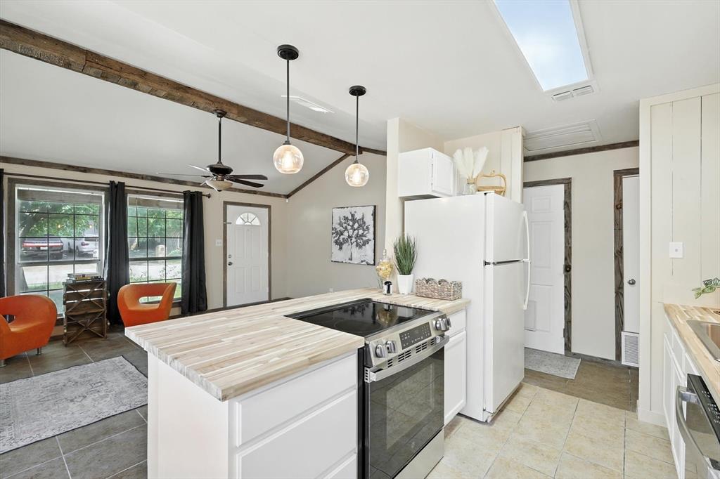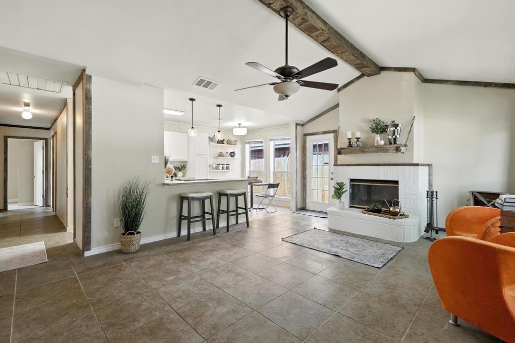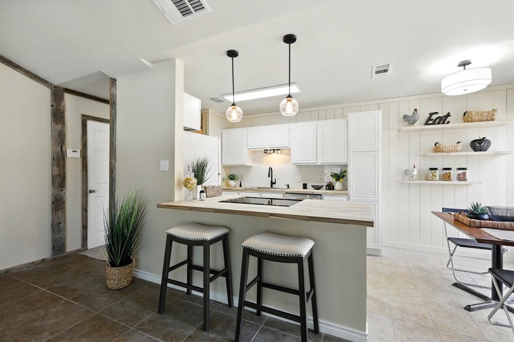Fully updated, vaulted ceilings in tiled living area open to kitchen with new stove, dishwasher and butcher block island and counters. New deep black sink, white cupboards, open shelves with painted wood paneling. New light fixtures in kitchen and bathrooms and back bedroom. Fresh paint through out, new manufactured light colored wood flooring in bedrooms. Both bathrooms updated, new shower door and brand new bathtub and vanities. Side yard has rock and stepping stones leading to a large tree in the backyard. Close to shopping and walking distance highly desirable Keller schools. HVAC new in 2023. Roof 2017.