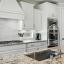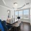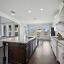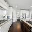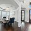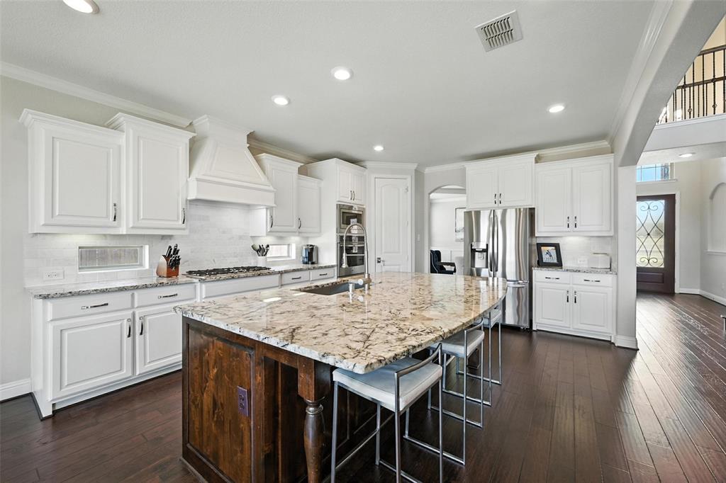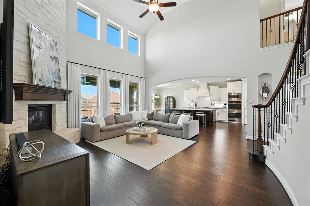 Inside, you’ll find engineered hardwood flooring throughout the first floor and a private office with built-in shelves for work or study. The heart of the home is the spacious kitchen, featuring a large granite-topped island, double ovens, gas cooktop, and an open flow into the living room with soaring 18-foot ceilings—perfect for gatherings and entertaining.