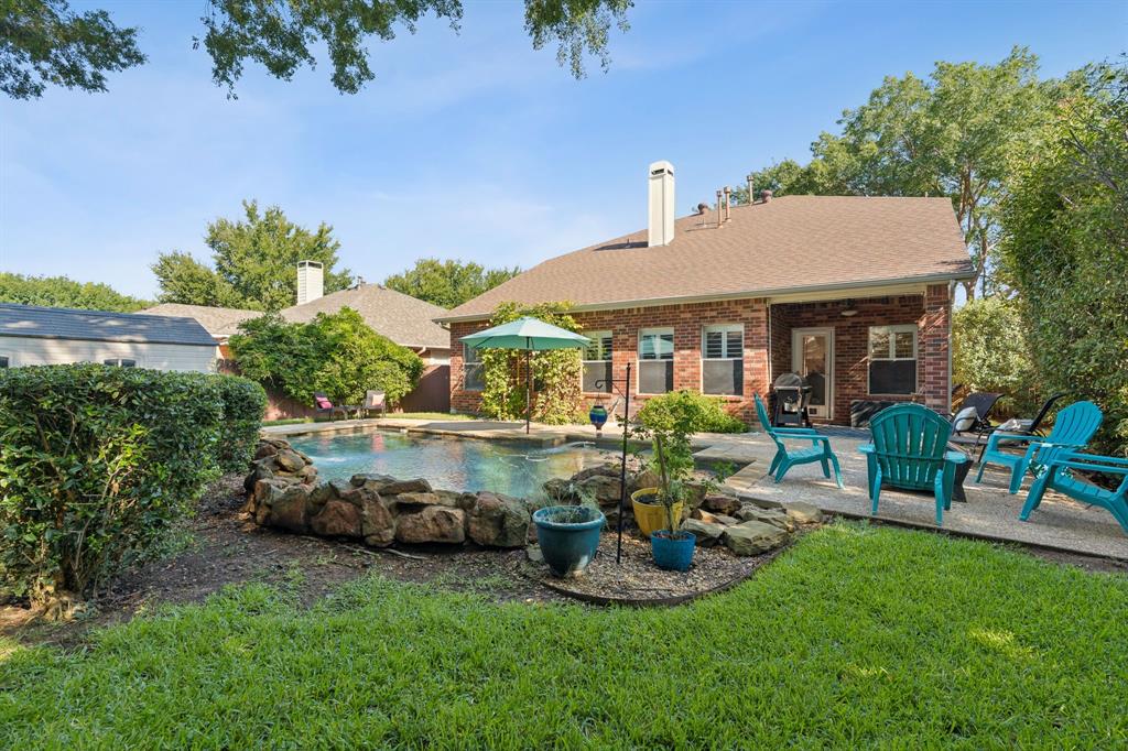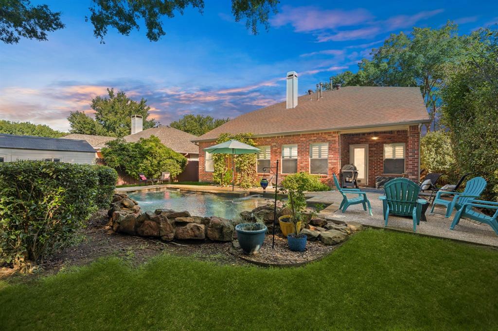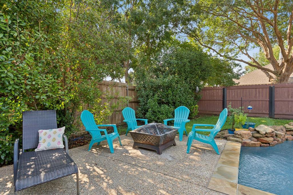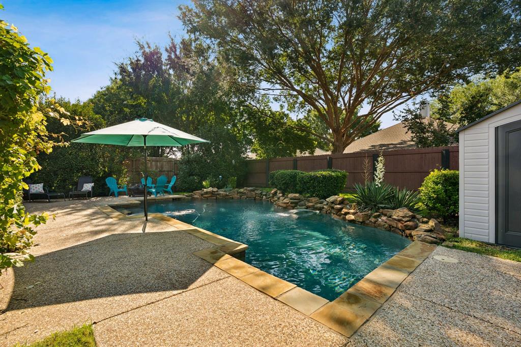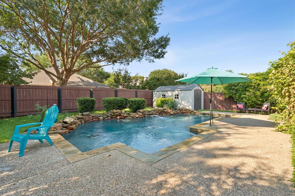 These don't show up often! This 4 bedroom, 2.5 bath with an amazing pool and patio right in the heart of Flower Mound has tons of upgrades that include Plantation Shutters, Wood Floors, Granite Counters, Freshly painted, Custom Wall Finishes and did I mention the amazing Pool and Patio area in the backyard that's has extended patio areas perfect for entertaining? Large open family room with a gas log fireplace and plantation shutters to enjoy the view of the pool and backyard. 2 story entry next to the dining room that could be used as an office and the kitchen has plenty of cabinets and breakfast bar next to the 2nd dining~bkfst area. Large Gameroom is upstairs with all secondary bedrooms for privacy and there's a large loft or office area at the top of the stairs for homework desks or home office. Primary has a great view of the pool and patio and features dbl vanity, large walkin and separate tub and shower. Storage shed in backyard is included. Don't miss out on the opportunity to be located walking distance to the schools and minutes from tons of dining at the Shops of Highland Village, Riverwalk Flower Mound and all along the 2499 corridor.