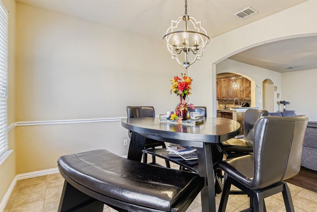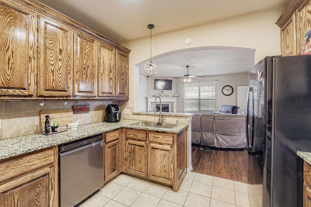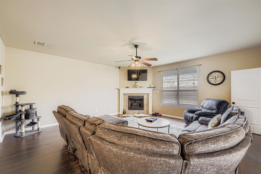 The living room includes a cozy fireplace and flows into a kitchen equipped with a breakfast bar and pantry. A formal dining room offers space for entertaining or everyday meals.