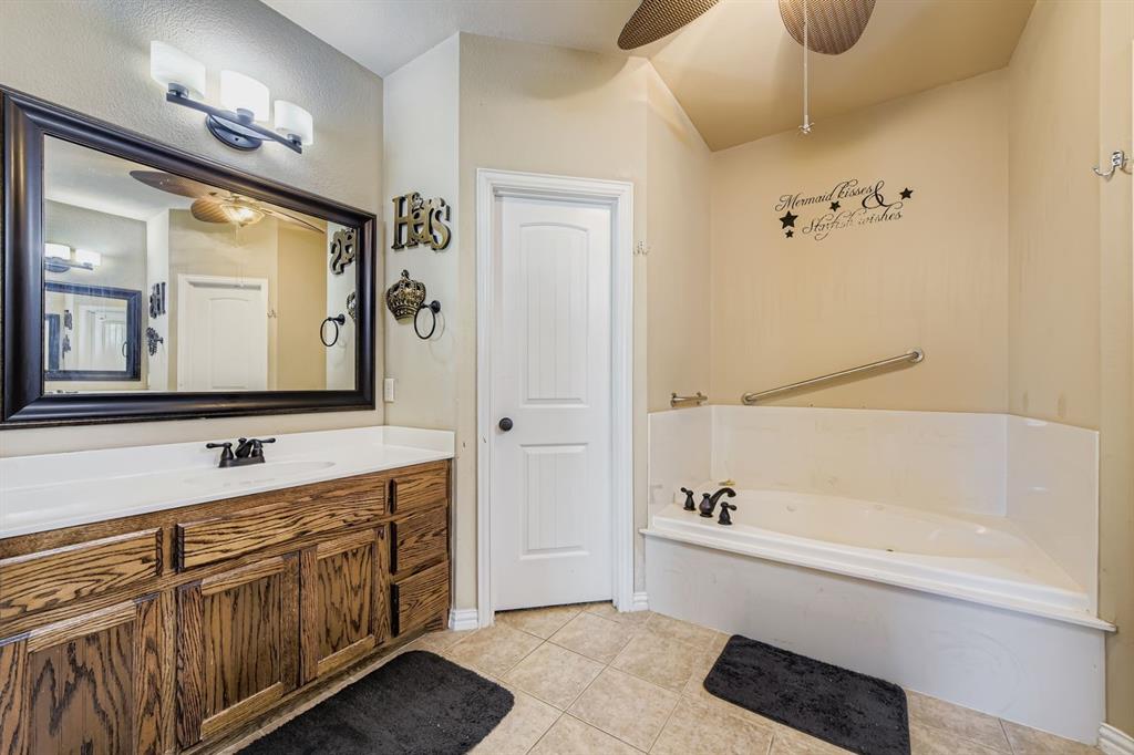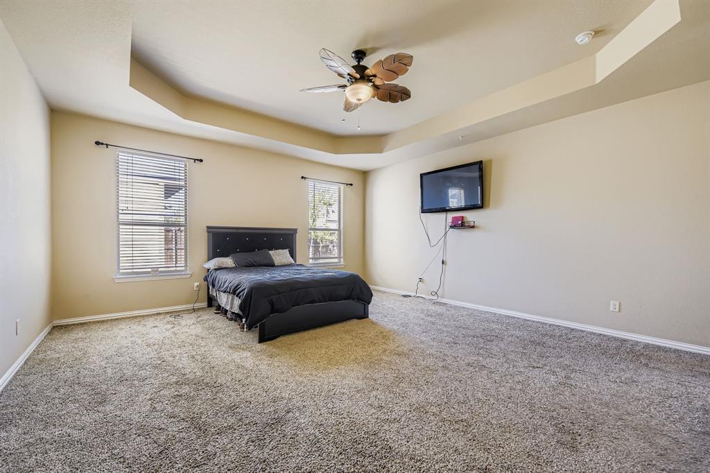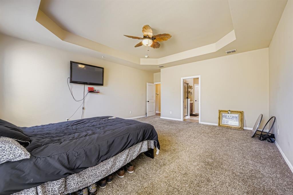 The primary suite features tray ceilings, a soaking tub, dual vanities, a walk-in closet, and a separate shower. Secondary bedrooms are generously sized and share a full bath.
