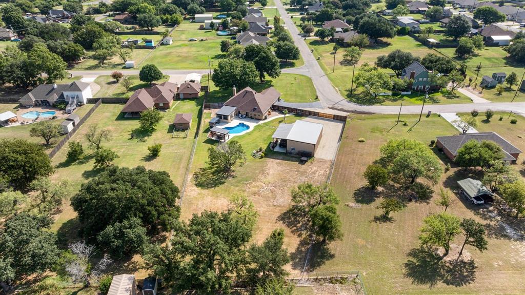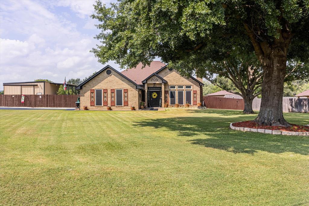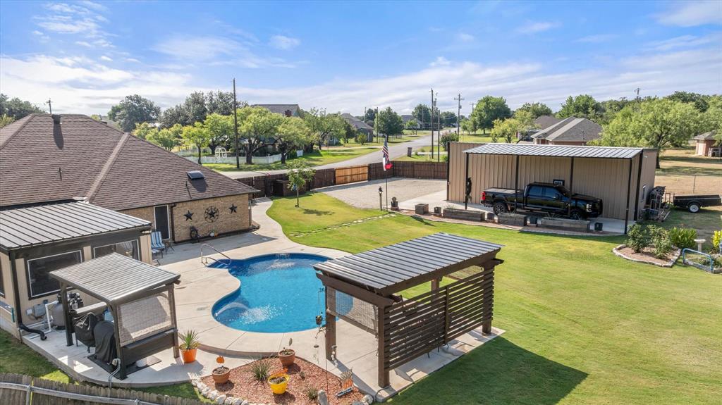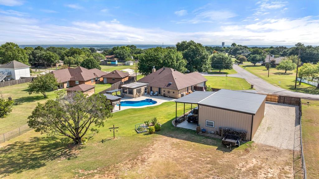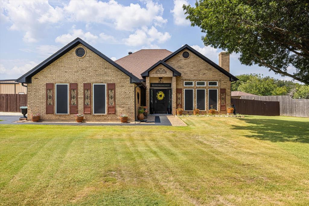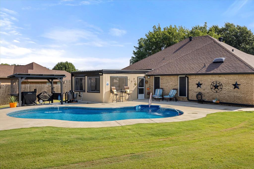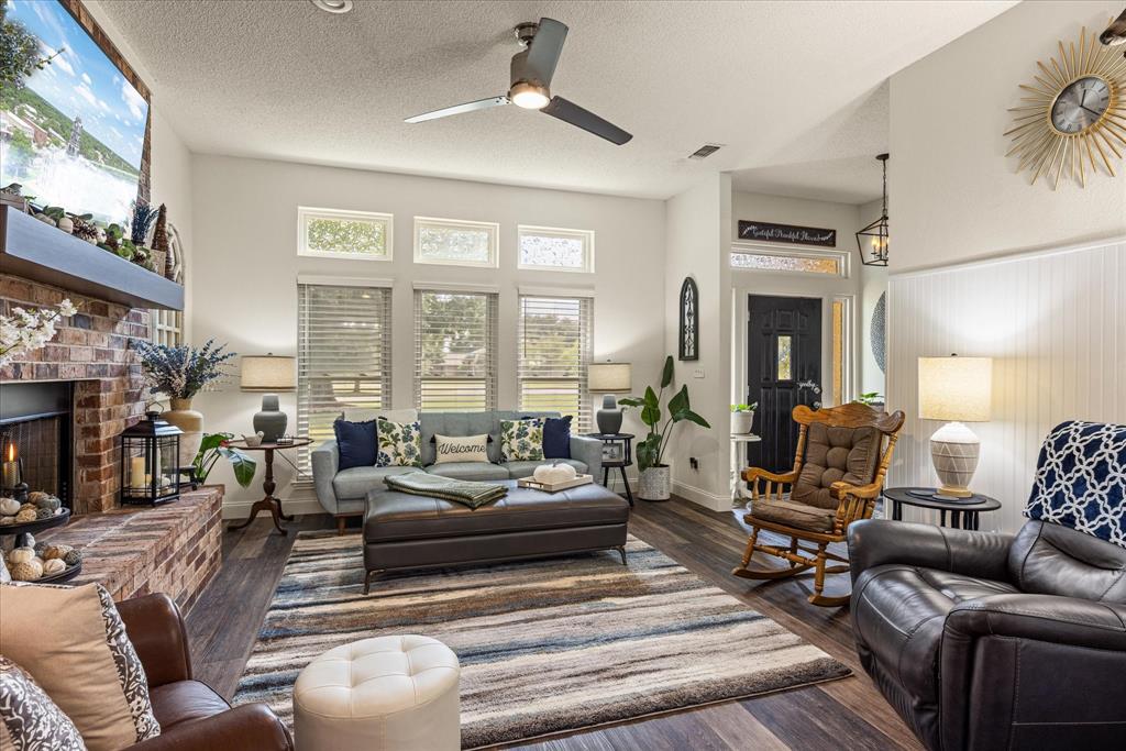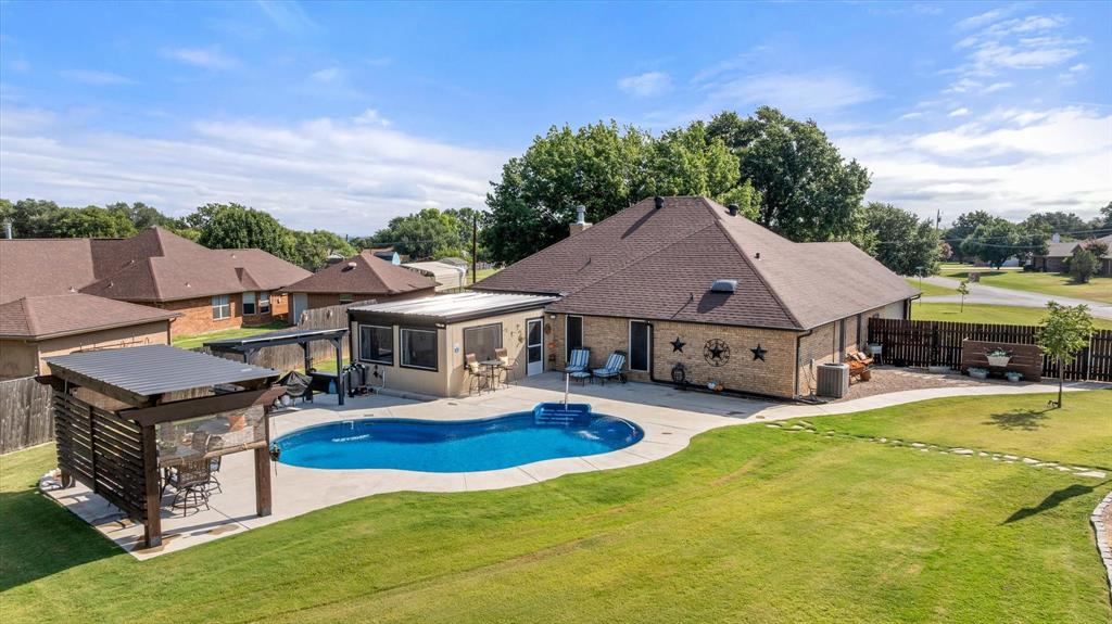 Beautifully remodeled 3-bedroom, 2-bath brick home on nearly one acre in the peaceful Hills of Granbury, just minutes from schools and the historic Granbury Square. This property offers the best of country living with modern upgrades. A complete remodel in 2021 brought a gorgeous kitchen with granite counters, farmhouse sink, and stainless steel appliances, fresh paint, luxury vinyl plank flooring, new light fixtures, and ceiling fans throughout, plus fully updated bathrooms, and a new utility vanity. The living room features a new brick fireplace surround with mantle, gas line, and a 250-gal propane tank to service both the cookstove and fireplace. Outdoor living shines with a sparkling pool and two pergolas for cooking and entertaining. One of the standout features is the almost 400 sq. ft. sunroom added in 2023, a peaceful retreat perfect for relaxing year-round. A 30x40 steel-frame shop with RV covered parking, 50 amp RV plug and insulated workshop offers endless possibilities. Additional improvements include a new 50-gallon water heater, front and back yard sod with sprinkler system, solar screens, added attic insulation, air purification system, and new garage door and opener. Schedule your showing today!