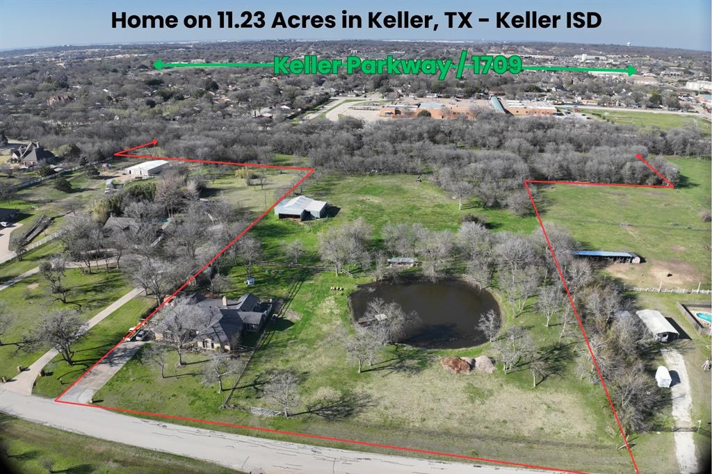 Zoned to TOP-RATED Keller ISD schools: Willis Lane Elementary, Indian Springs Middle, and Keller High School. Whether you’re seeking a private retreat, working farm, equestrian estate, or investment property, this RARE Keller acreage delivers endless possibilities. The city will allow one additional home to be built on the lot near the pond, additional development will require the installation of a cul-de-sac. Buyer to verify.
