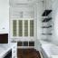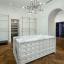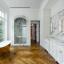 Jamb fireplace opens to a glass oval sitting room. The showpiece bath features a sculptural brass tub and a dry sauna, while a two-room dressing suite and private glam room are designed to showcase couture collections.