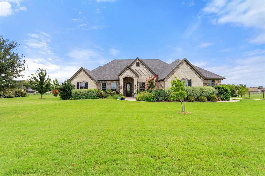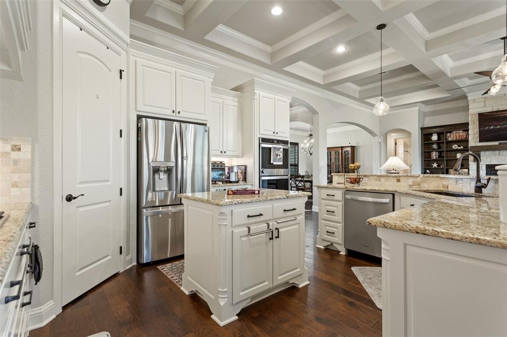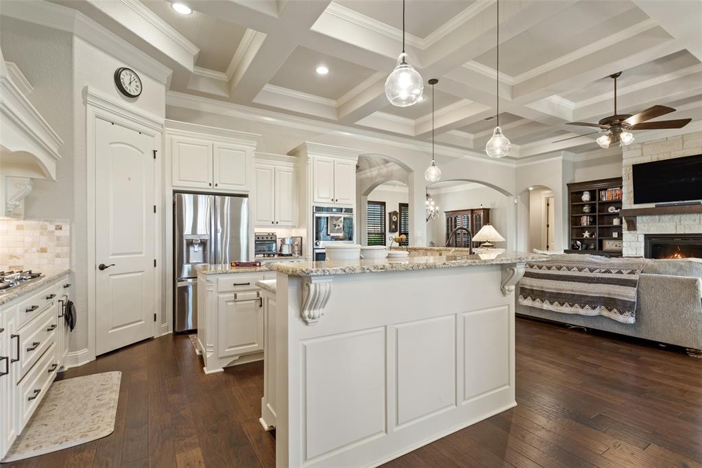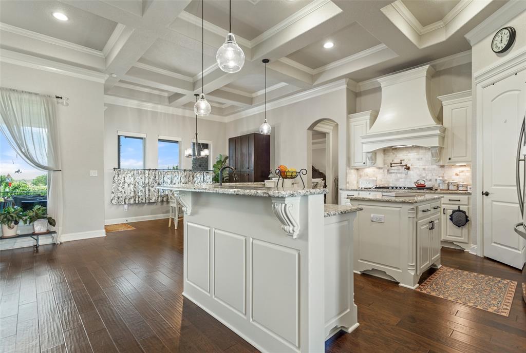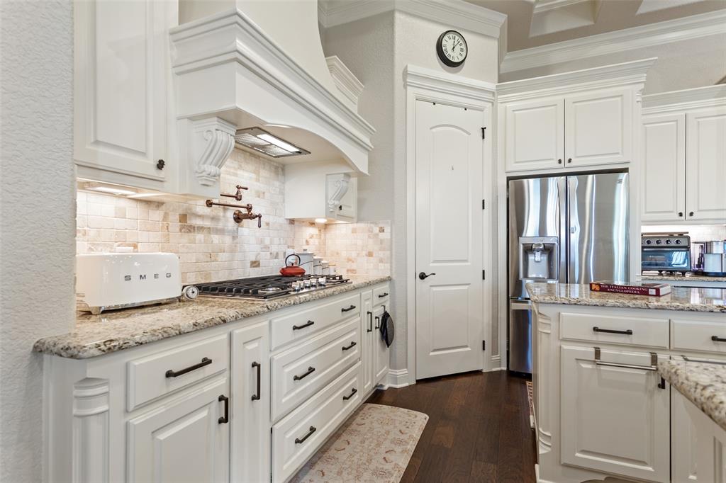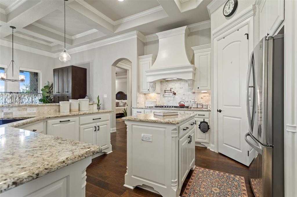 This exceptionally gorgeous 4-bedroom, 3-bath custom home is nestled in a gated community and sprawled out on a Texas-size (1 acre) lot, offering show-stopping curb appeal & custom upgrades - giving the home that WOW factor, while creating a livable showpiece! Upgrades include an iron front entry door, coffered ceilings, and exquisite trim work. The open airy family room & gourmet kitchen provides plenty of space for those large Holiday gatherings & was thoughtfully designed with great indoor-outdoor flow perfect for everyday living & entertaining! This magazine worthy kitchen comes equipped with stainless steel appliances, gas burner cooktop, pot-filler, custom range hood, granite countertops, a breakfast bar, a large island, and a walk-in pantry.