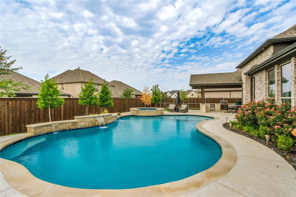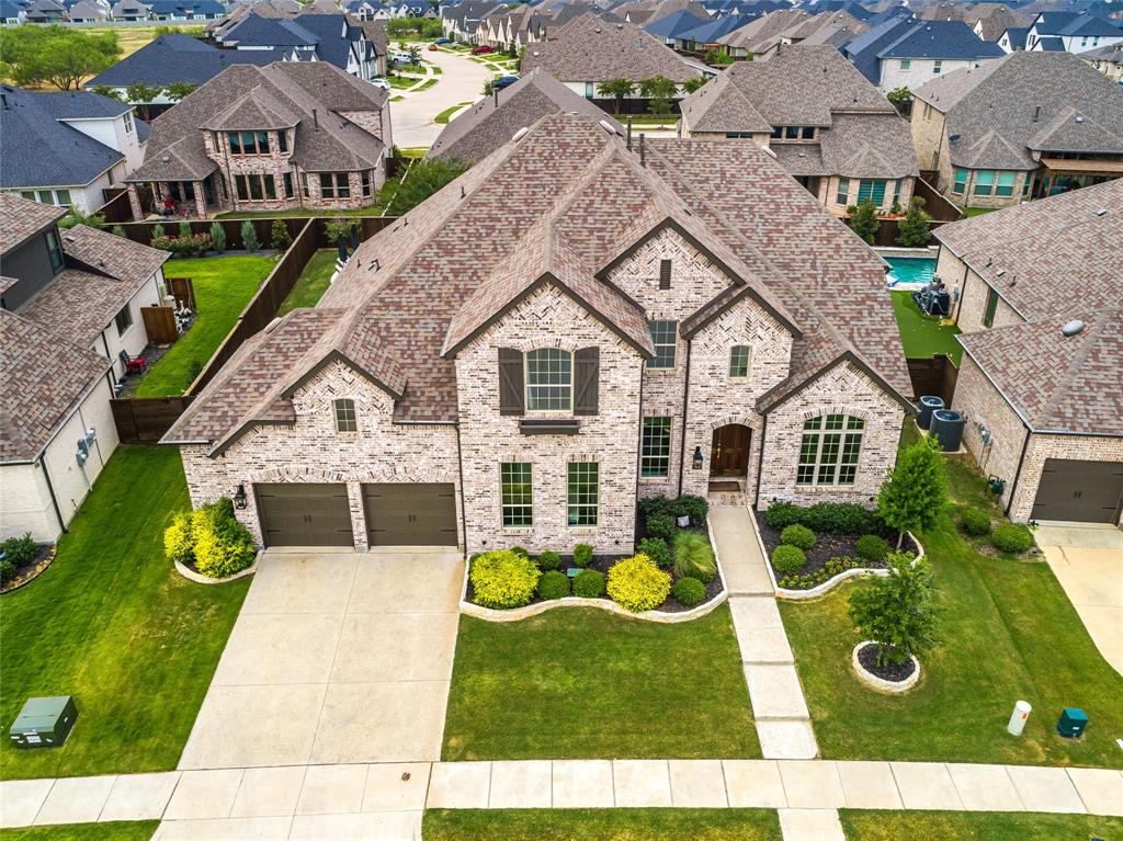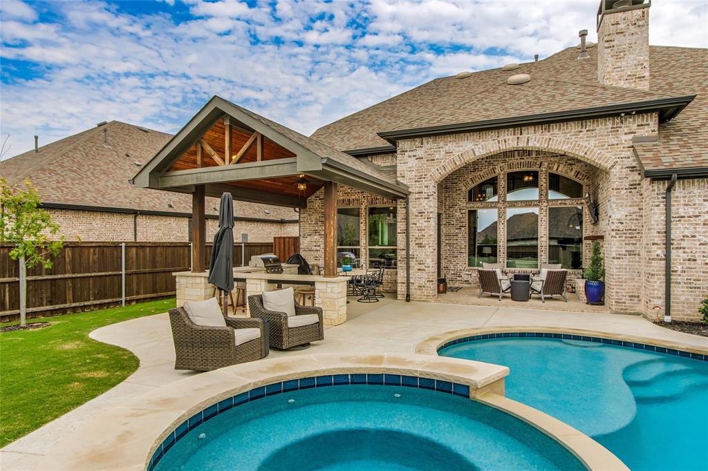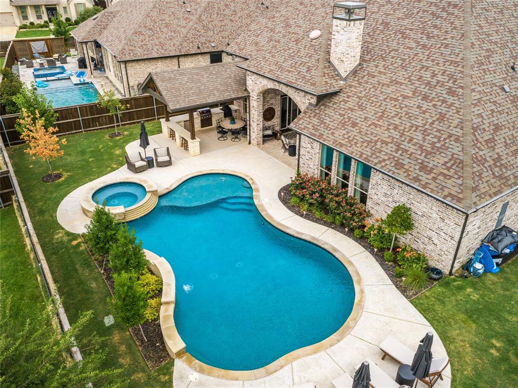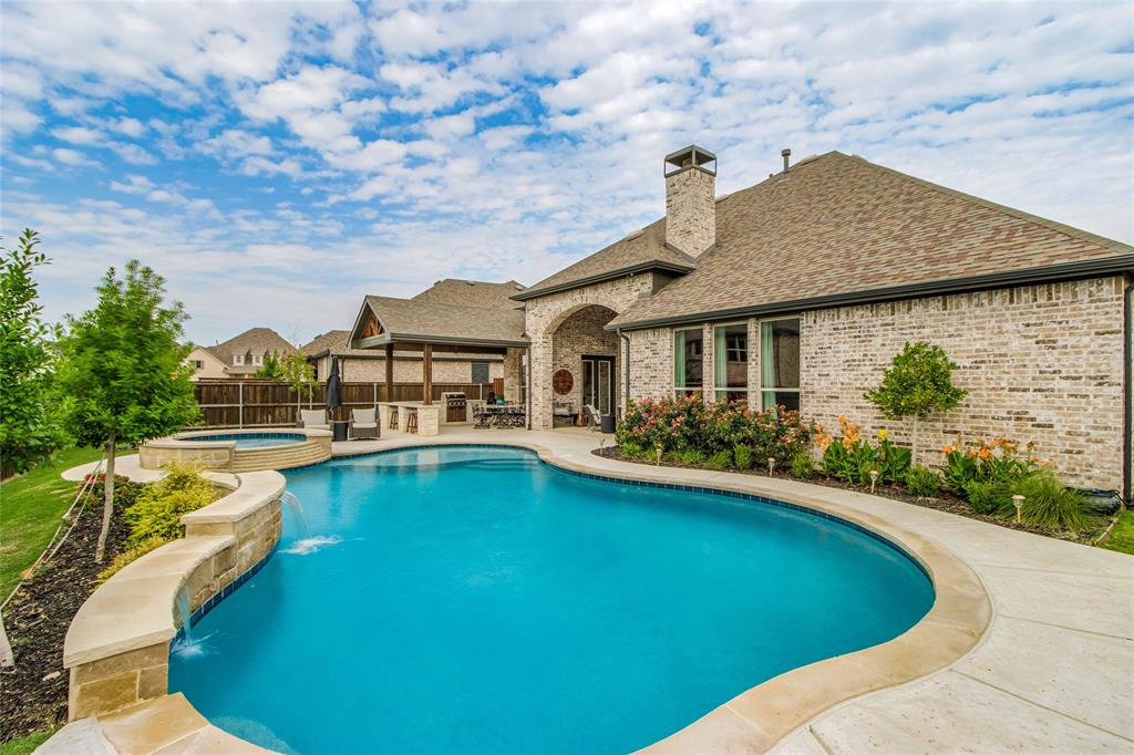 EXQUISITE! This beautiful Highland Home in Argyle ISD that has been so lovingly and gently cared for that it feels better than new. Designed for relaxing entertaining, this fabulous open floorplan will surely delight you as you step beyond the gorgeous front upgraded double doors. So many upgrades and customer customized features! The kitchen and family room will wow you, not only with size, but take look at the high level quartzite countertops, a 19 linear foot walk in pantry, walls of cabinets, all overlooking 20' ceiling Texas sized family room, and then the most spectacular backyard, from the cobblestone covered patio, gas woodburning fireplace, Austin stone spaceious outdoor kitchen, and a huge pebbletec pool, complete with extended tanning ledge, water features, spa, abundant decking for patio furniture, and large grassy areas on this oversized lot-just fabulous! Back inside, enter the private primary suite and walk into a spa like bath, which has been custom designed, take a look at all the built ins, tile accents, free standing tub & more. Also down, you will find a guest bedroom suite, bath, and a another living area, flexible for your guest, perhaps the family media room. Office with solid french doors & window seat make a charming work space. Upstairs are two more spacious bedrooms accented with shiplap, a bath, and gameroom that is tucked away so that all the toys can come out and no one will know! Wonderful Commmunity Amenities including pool, fitness area and club house. This home is a 10++, come see it today, its special!