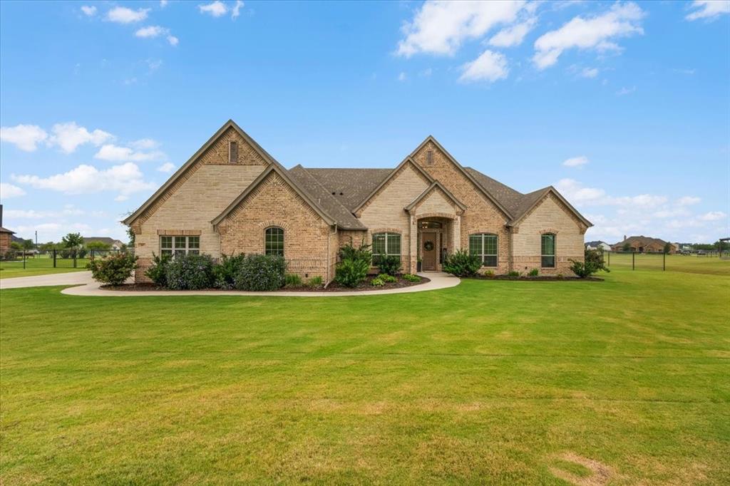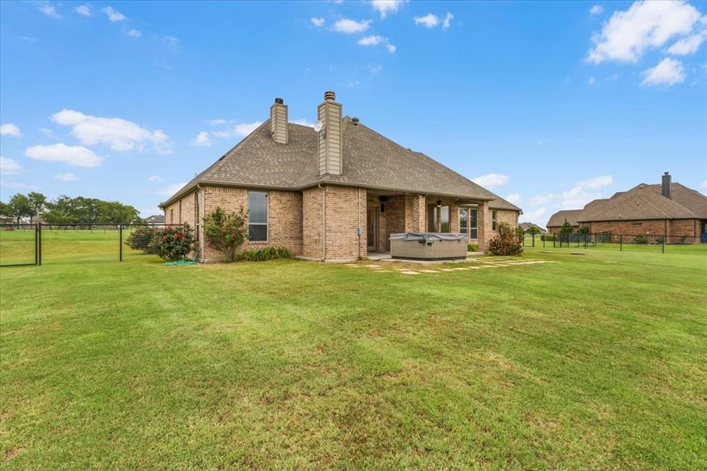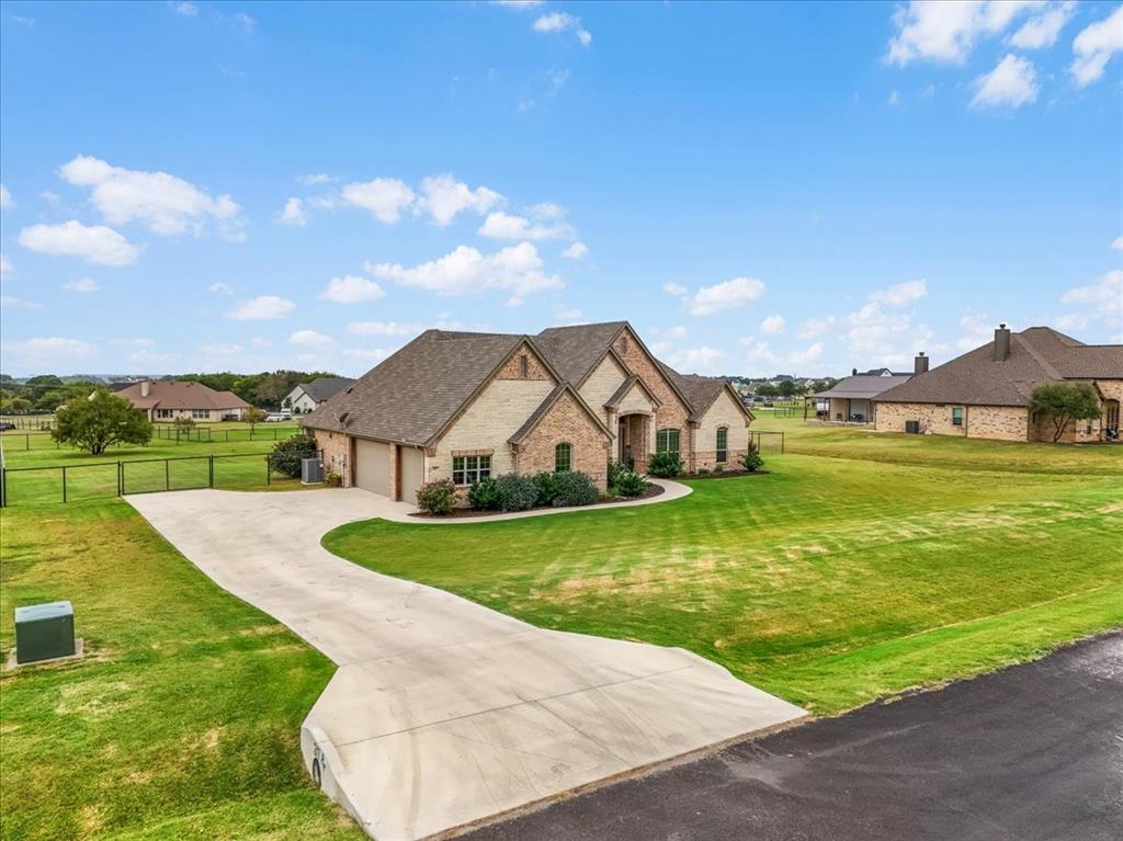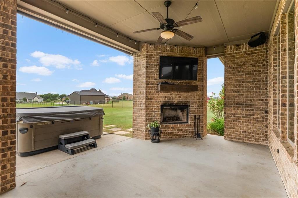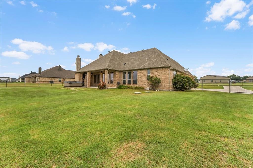 Welcome home to this beautifully designed 4-bedroom, 2-bath property with a dedicated office, set on a beautifully maintained 1-acre lot. Step inside to an open concept layout that seamlessly connects the living room and kitchen. The spacious living room features stained beamed ceilings, custom built-ins, surround sound, a curved TV that conveys and a cozy brick and stone wood-burning fireplace, creating the perfect spot to unwind. The kitchen is a true centerpiece with stainless steel appliances, double ovens, granite countertops, and a large island ideal for casual meals or entertaining guests. A large utility room is already furnished with a washer and dryer and provides ample storage with built in cabinets and room for an additional freezer. The primary suite includes a trayed ceiling, TV that conveys, expansive walk-through shower, and an oversized closet. Step outside to enjoy the outdoor fireplace or relax in the Bullfrog Spa while watching the sunset in your fully fenced backyard, featuring surround sound and a patio TV already installed. The 3-car garage, also equipped with surround sound, features insulated doors and epoxy flooring for added convenience and style. With recent updates including fresh paint throughout, a new 7.5-ton HVAC, gutters, and a front sprinkler system, this home is ready for you to move right in and start making memories.