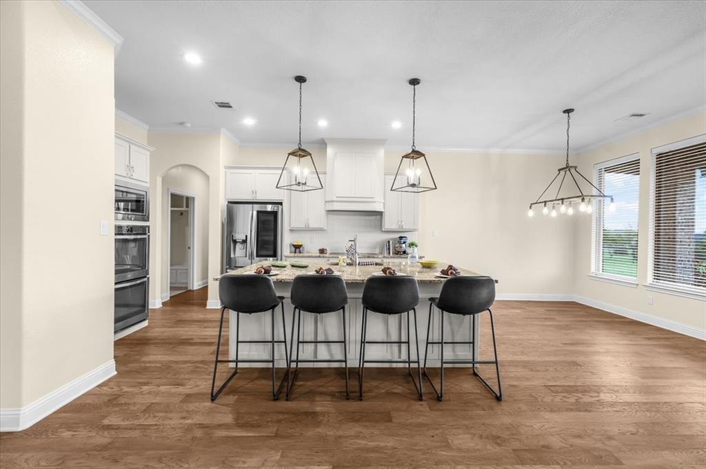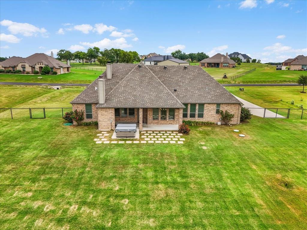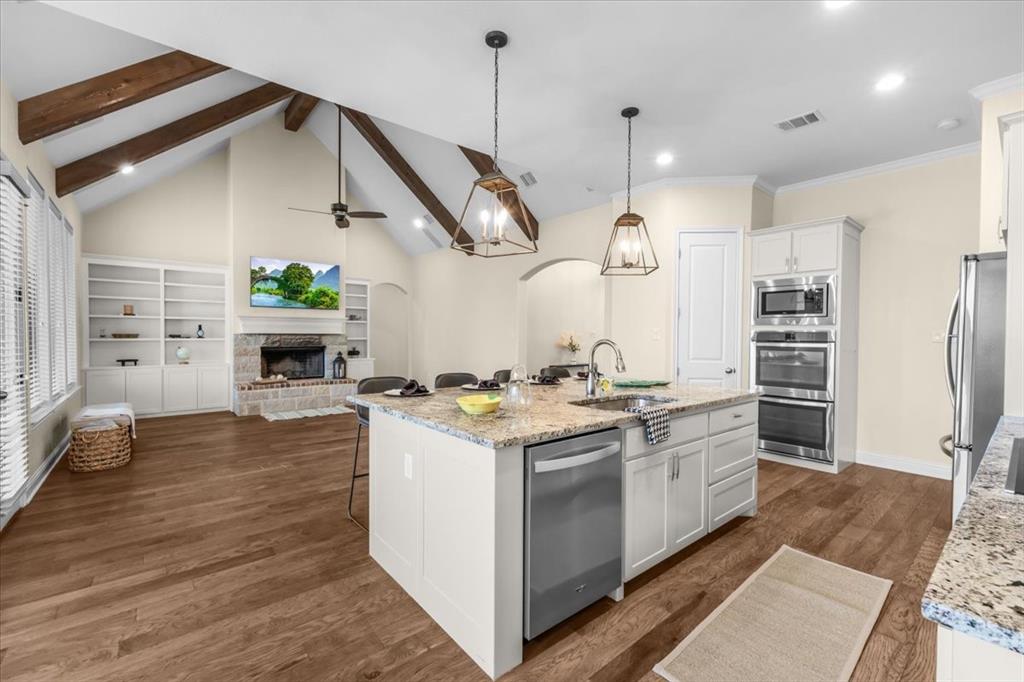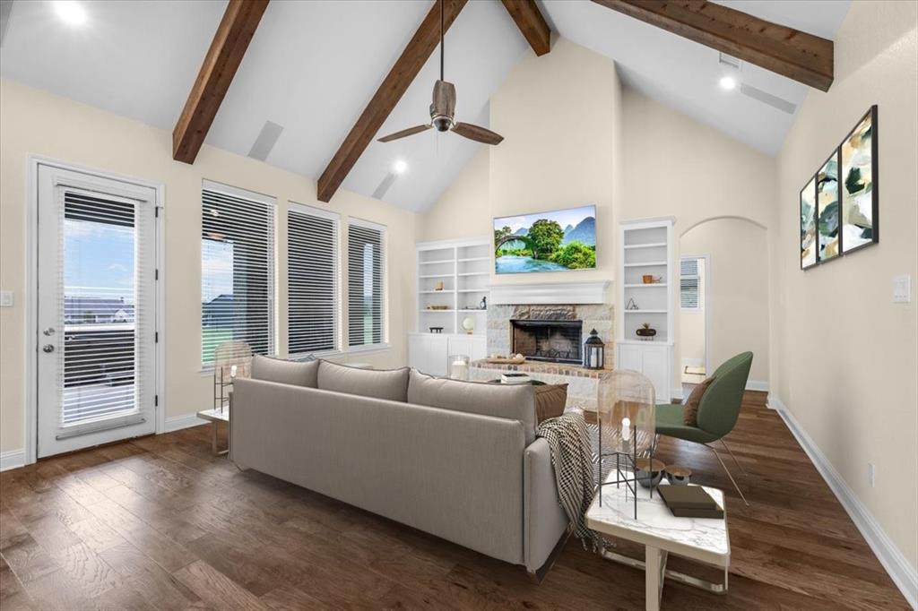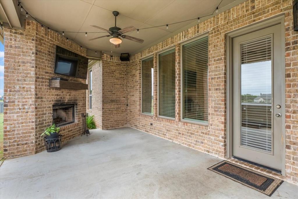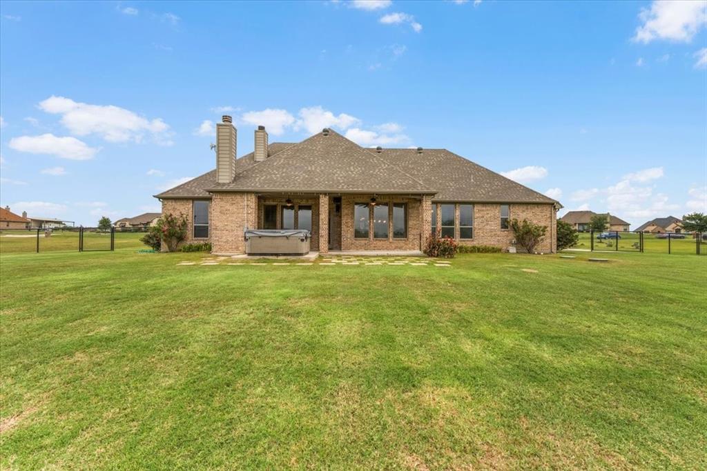 Welcome home to this beautifully designed 4-bedroom, 2-bath property with a dedicated office, set on a beautifully maintained 1-acre lot. Step inside to an open concept layout that seamlessly connects the living room and kitchen. The spacious living room features stained beamed ceilings, custom built-ins, surround sound, a curved TV that conveys and a cozy brick and stone wood-burning fireplace, creating the perfect spot to unwind. The kitchen is a true centerpiece with stainless steel appliances, double ovens, granite countertops, and a large island ideal for casual meals or entertaining guests. A large utility room is already furnished with a washer and dryer and provides ample storage with built in cabinets and room for an additional freezer. The primary suite includes a trayed ceiling, TV that conveys, expansive walk-through shower, and an oversized closet. Step outside to enjoy the outdoor fireplace or relax in the Bullfrog Spa while watching the sunset in your fully fenced backyard, featuring surround sound and a patio TV already installed. The 3-car garage, also equipped with surround sound, features insulated doors and epoxy flooring for added convenience and style. With recent updates including fresh paint throughout, a new 7.5-ton HVAC, gutters, and a front sprinkler system, this home is ready for you to move right in and start making memories.