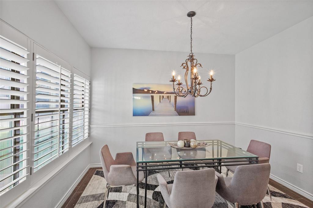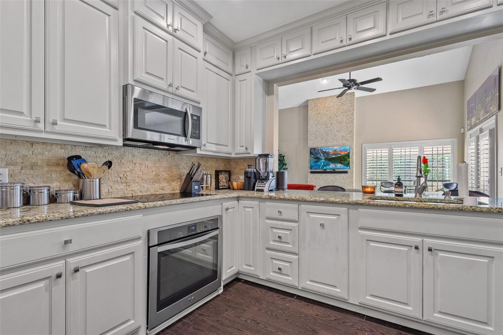 The home features a bright and airy open floor plan, ideal for relaxing or entertaining. The kitchen was previously remodeled to offer ample counter space and drawer storage. The adjacent living and dining rooms are perfect for entertaining. A wood-burning fireplace and special brick wall, along with shutters throughout are all added extras. Granite countertops are featured in the kitchens and the three bathrooms. The floors downstairs are all wood-look tile, with a great look and making them easy to clean.