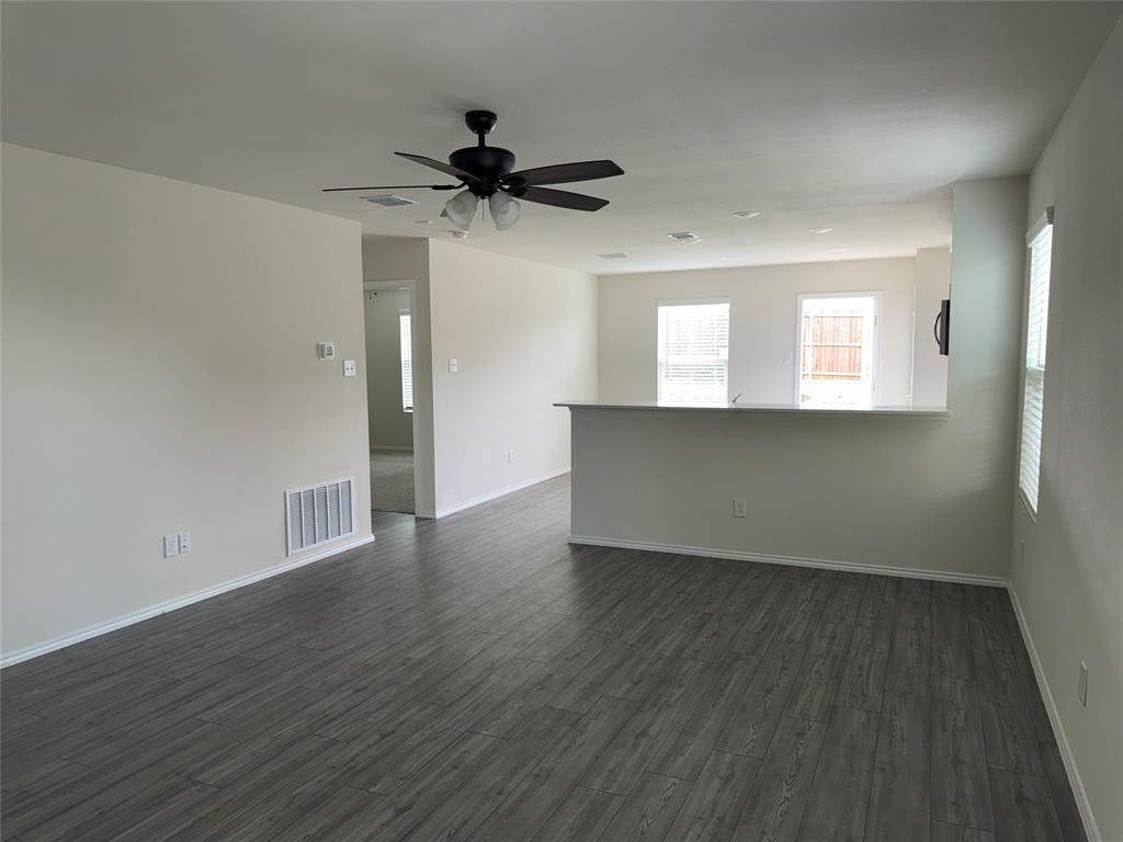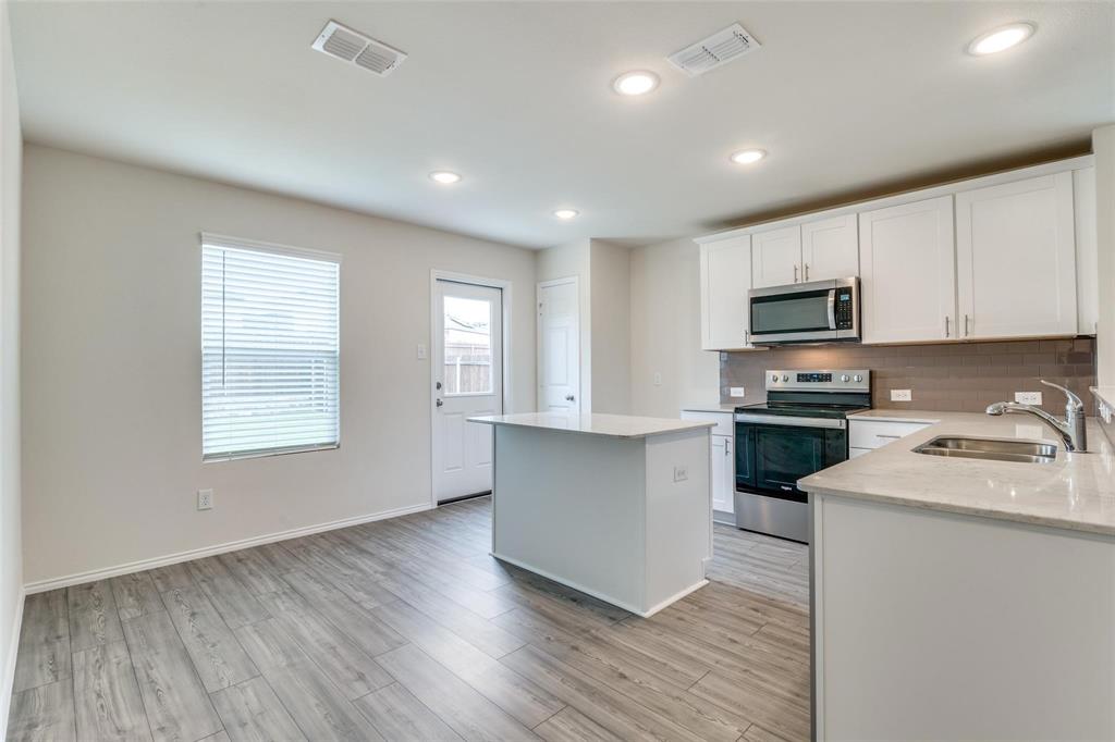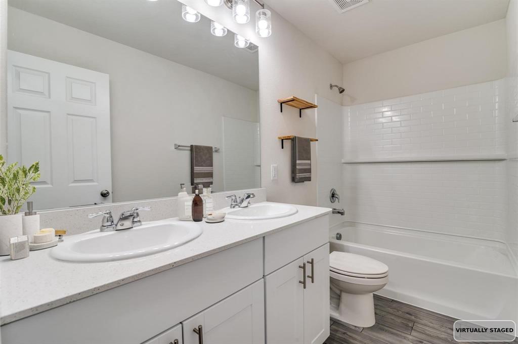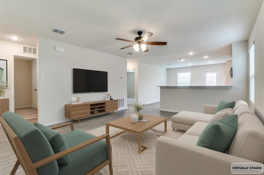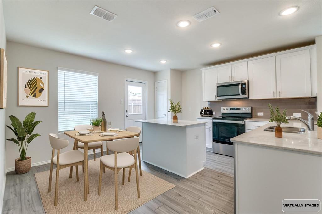 Beautifully maintained home with a stylish, on-trend color palette. The open-concept layout is filled with natural light and features gray wood-look plank flooring that enhances the bright and airy feel. The modern kitchen showcases a subway tile backsplash, stainless steel appliances, granite countertops, and an oversized island with seating—perfect for casual dining or entertaining. Additional counter space with a second seating option opens to the living area, creating a seamless flow for gatherings. The split-bedroom design offers privacy, with secondary rooms that can easily serve as a home office. A convenient hallway laundry room with storage adds functionality, while the secondary bathroom includes dual sinks. This home offers both comfort and versatility—ideal for everyday living and entertaining alike.