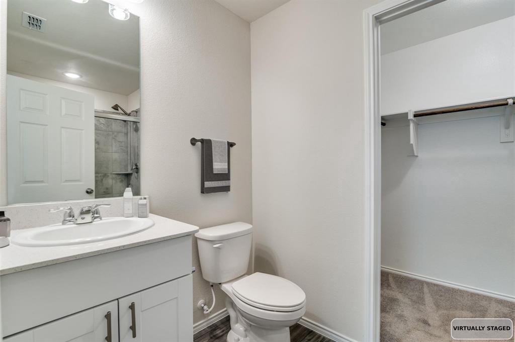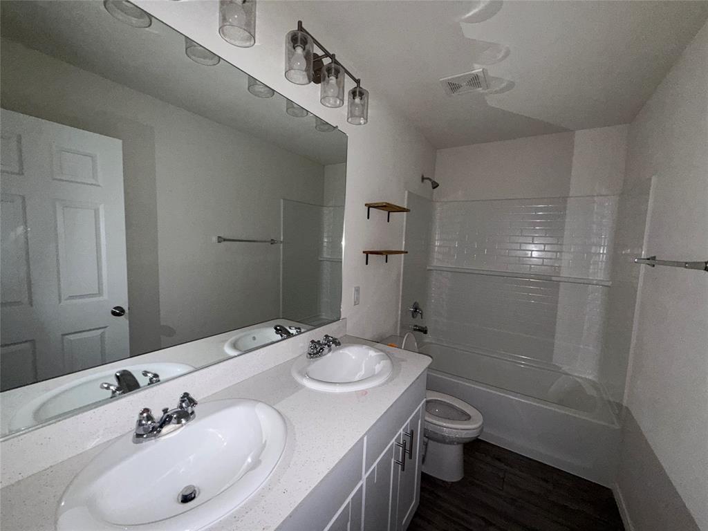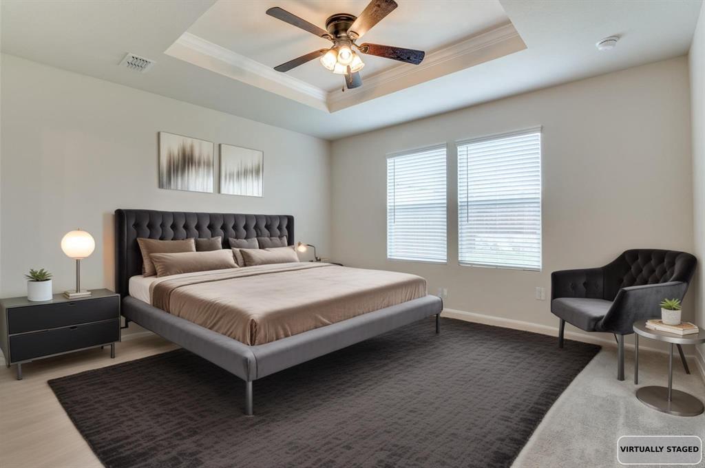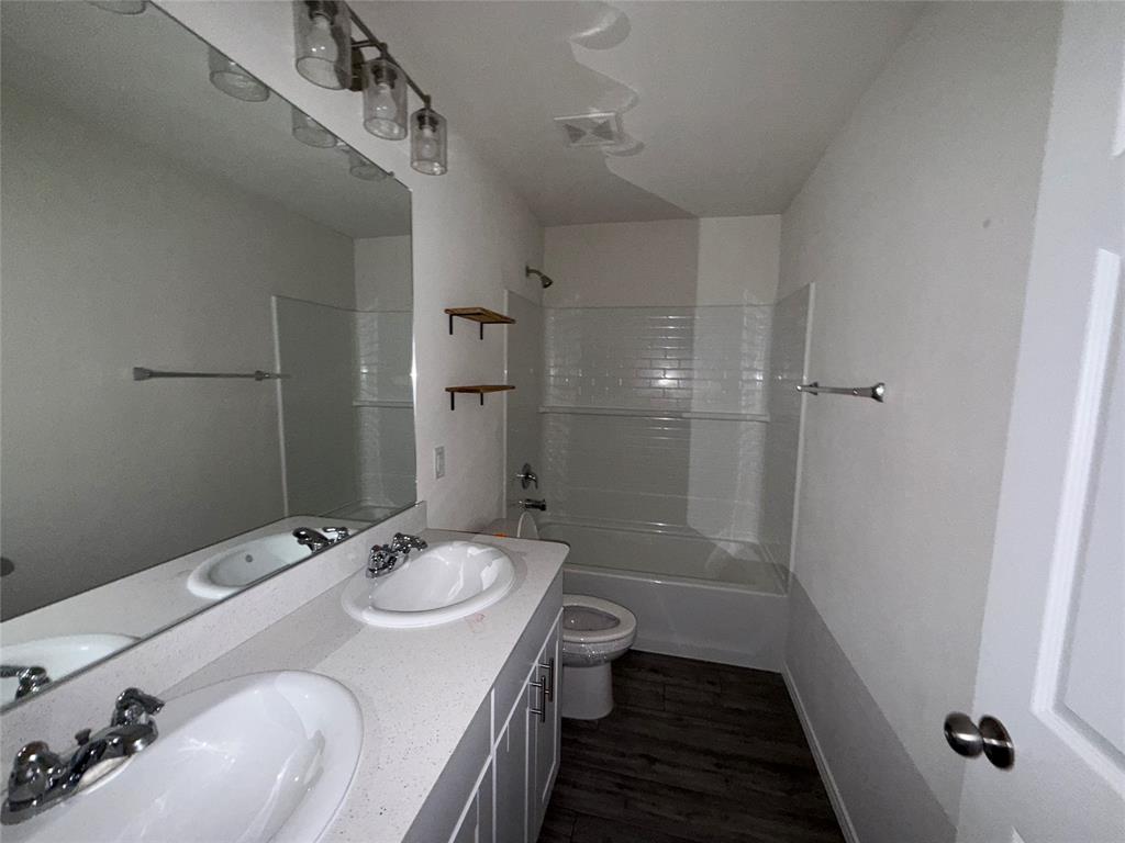 Beautifully maintained home with a stylish, on-trend color palette. The open-concept layout is filled with natural light and features gray wood-look plank flooring that enhances the bright and airy feel. The modern kitchen showcases a subway tile backsplash, stainless steel appliances, granite countertops, and an oversized island with seating—perfect for casual dining or entertaining. Additional counter space with a second seating option opens to the living area, creating a seamless flow for gatherings. The split-bedroom design offers privacy, with secondary rooms that can easily serve as a home office. A convenient hallway laundry room with storage adds functionality, while the secondary bathroom includes dual sinks. This home offers both comfort and versatility—ideal for everyday living and entertaining alike.