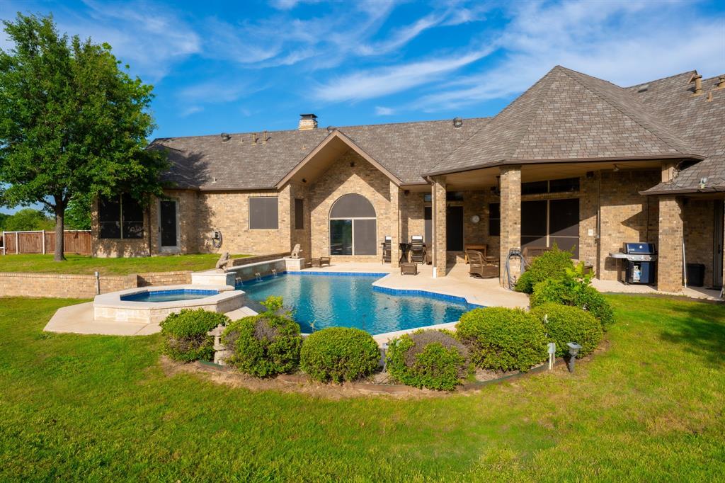 Located in the heart of North Texas' horse country, this 4487 sf residence blends classic design with modern updates. The split-bedroom floor plan offers both privacy and functionality, with the primary suite and private office on one wing and additional bedrooms and living spaces on the other. Recent upgrades include engineered hardwood flooring, exterior privacy screens for energy efficiency, and updated pool and equipment.