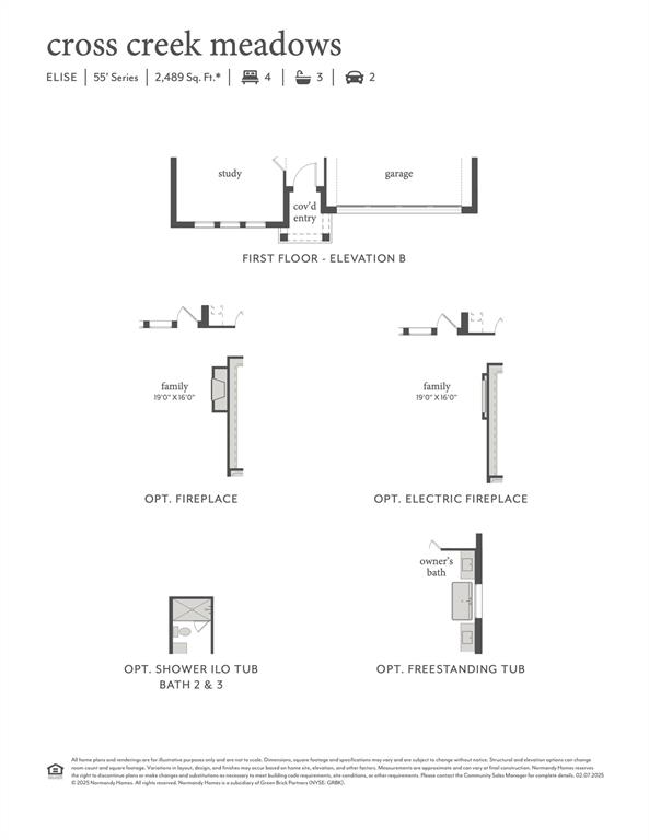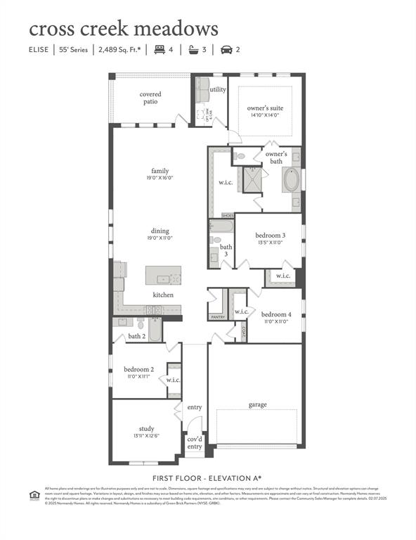 NORMANDY HOMES ELISE floor plan. Discover the elegance of the Elise, a stunning 4-bedroom, 3-bathroom home designed for modern living. This spacious floor plan includes a dedicated study at the front, perfect for a home office. Each bedroom boasts a walk-in closet, providing ample storage space. The gourmet kitchen features a large island, ideal for entertaining, while the family and dining rooms are adorned with a wall of windows, flooding the space with natural light. The private owner's suite offers a spa-like retreat with an oversized shower, freestanding tub, and a large walk-in closet. Experience comfort and style in every corner of the Elise.