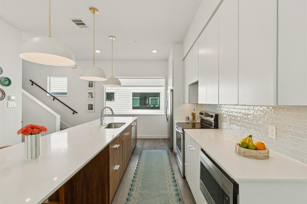 Modern urban living at it’s finest in this stunning 3-story townhome, completed in 2019, conveniently located minutes from Lower Greenville, Knox Henderson, and Downtown. Boasting an open, spacious floor plan with wall to wall windows filling the home with natural light. The second floor features a striking kitchen with an oversized Quartz waterfall island, perfect for entertaining, alongside expansive living and dining areas, a half-bath, and pantry. The third floor includes a well-sized laundry room, the secondary bedroom with en-suite bath and a spacious primary suite. The primary bath boasts dual sinks, a glass-enclosed shower, and walk-in closet. An oversized 2-car garage, gated pedestrian entry, and a fenced front yard space, offer privacy and security in the heart of the city.