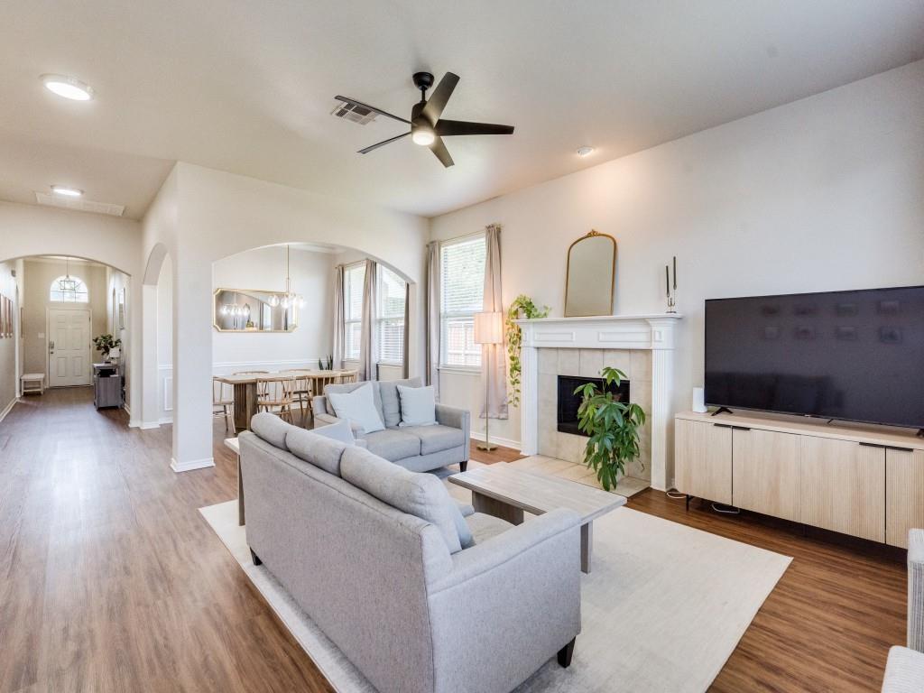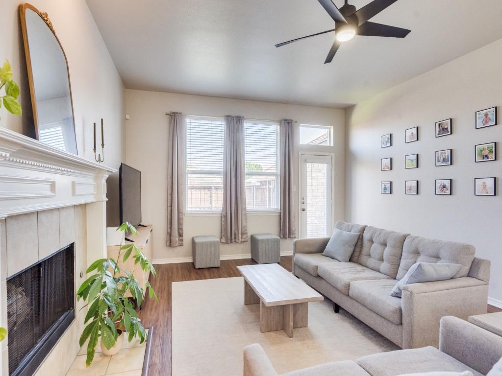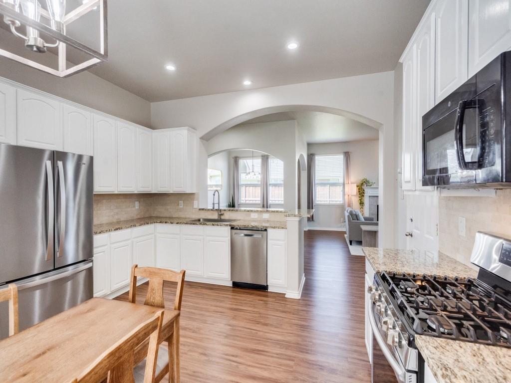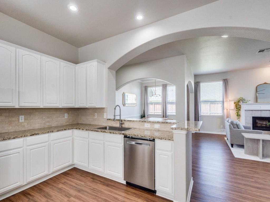 Enjoy wood-look flooring throughout the main living areas and a spacious living room anchored by a cozy fireplace. The gourmet kitchen boasts stainless steel appliances, a gas range, granite countertops, a stylish farm sink, abundant cabinetry, and a convenient bar seating area — perfect for both casual dining and entertaining.