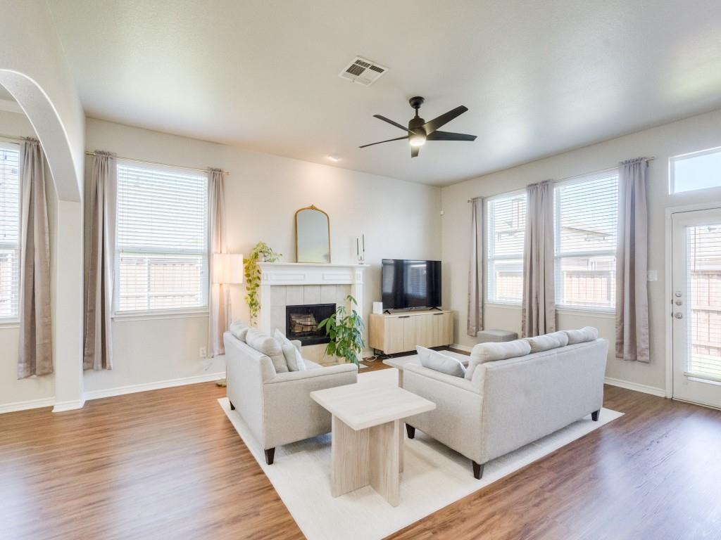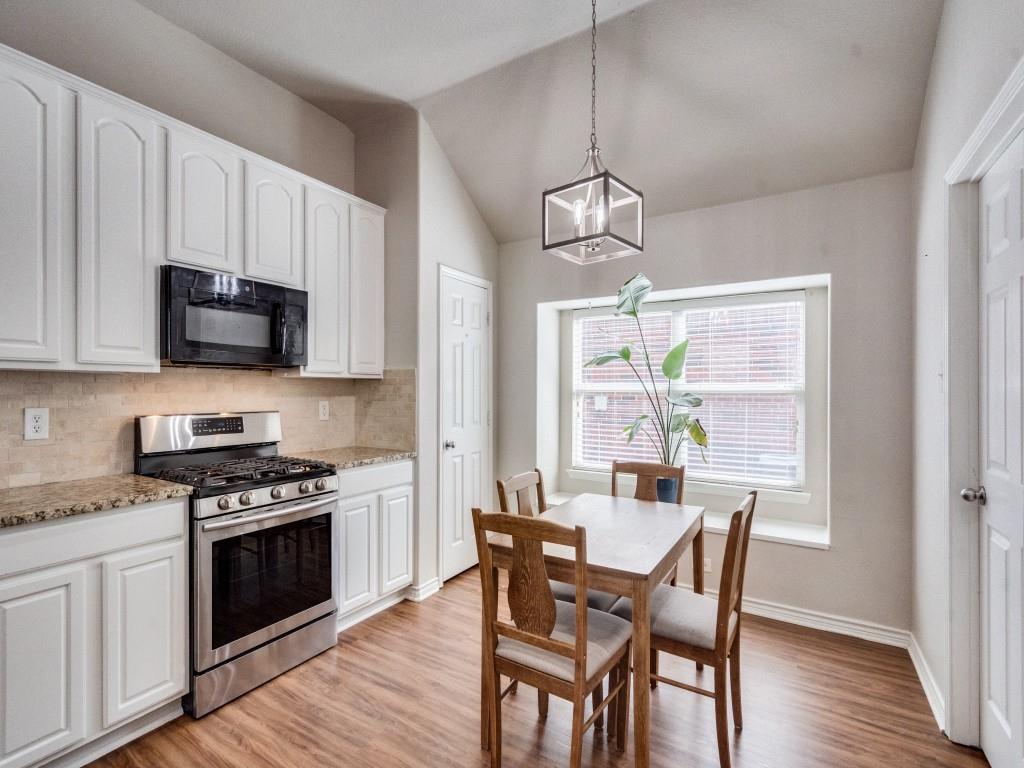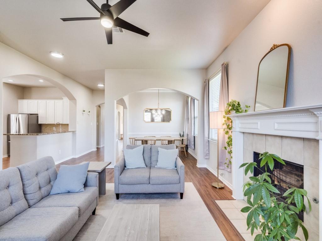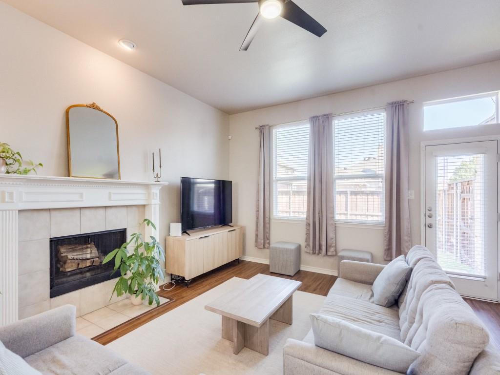 Enjoy wood-look flooring throughout the main living areas and a spacious living room anchored by a cozy fireplace. The gourmet kitchen boasts stainless steel appliances, a gas range, granite countertops, a stylish farm sink, abundant cabinetry, and a convenient bar seating area — perfect for both casual dining and entertaining.