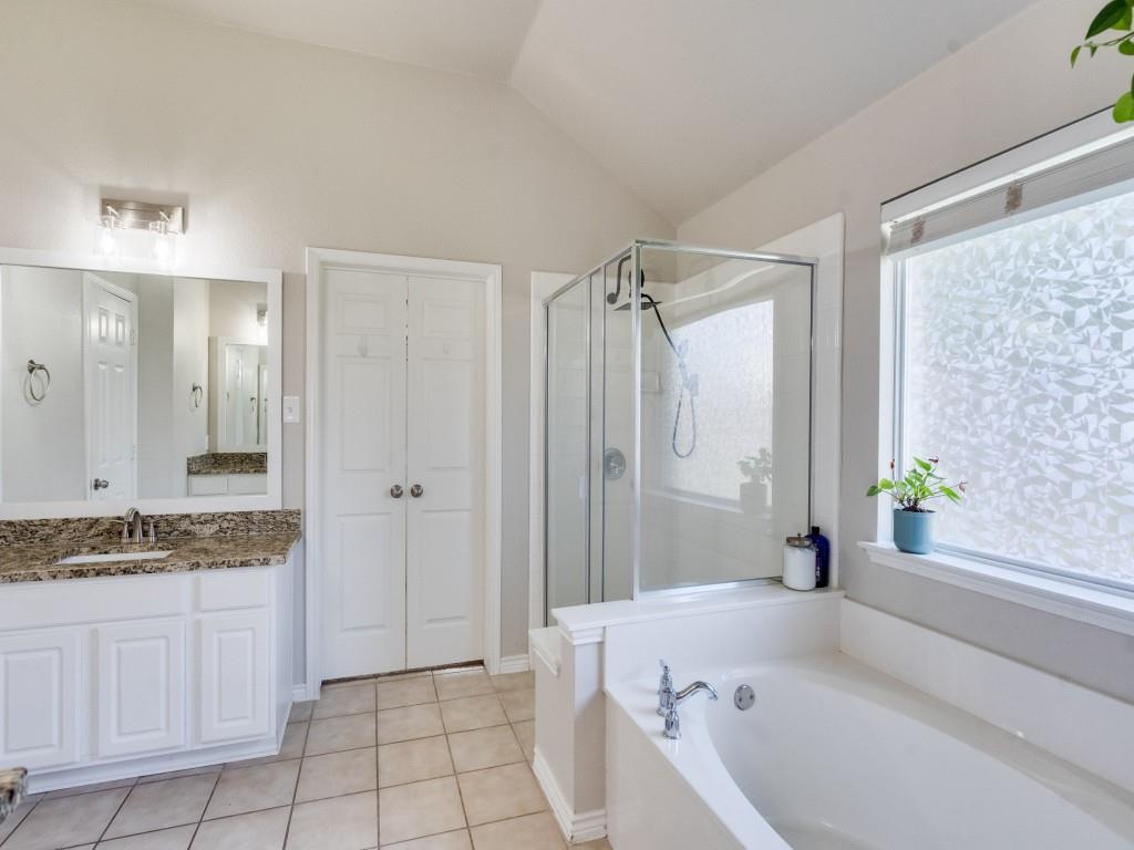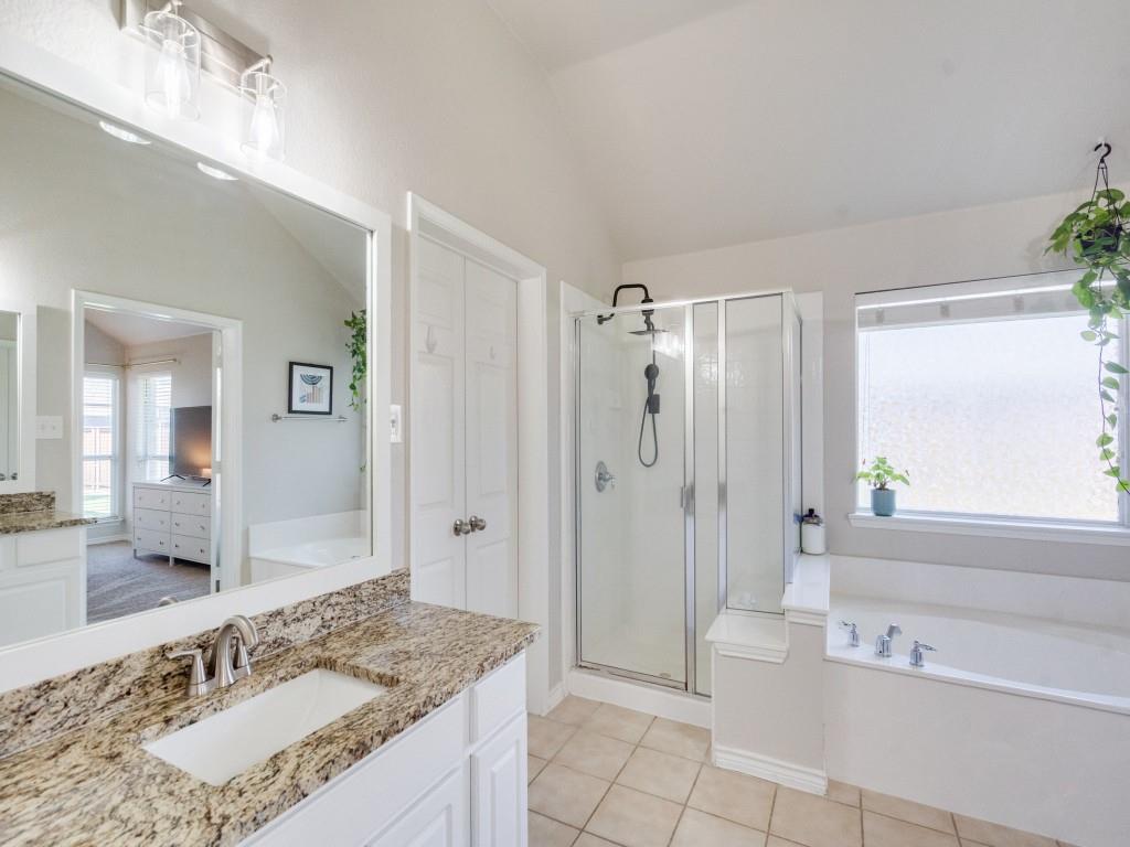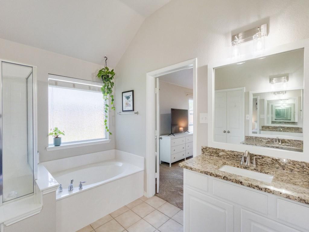 Retreat to the large private primary suite complete with a sitting area, and a luxurious en-suite bath featuring ceramic tile, granite countertops, a separate tub and shower, and a generously sized walk-in closet.