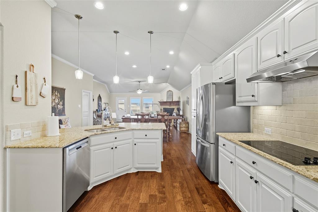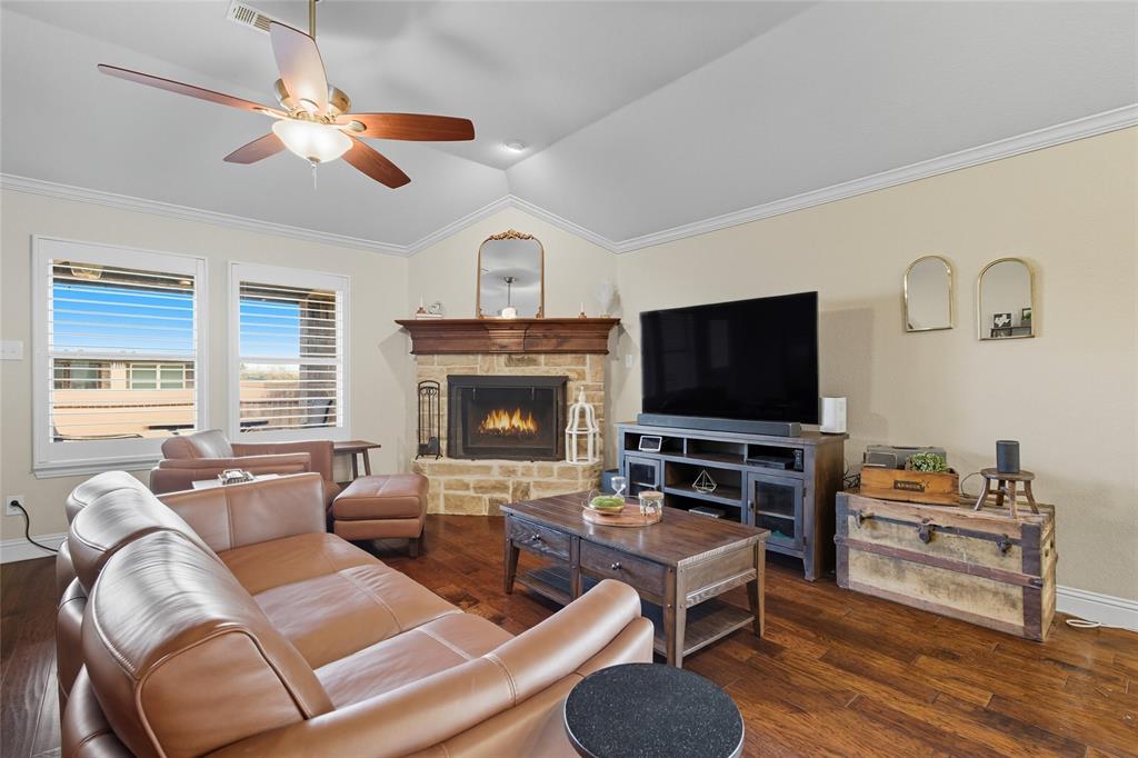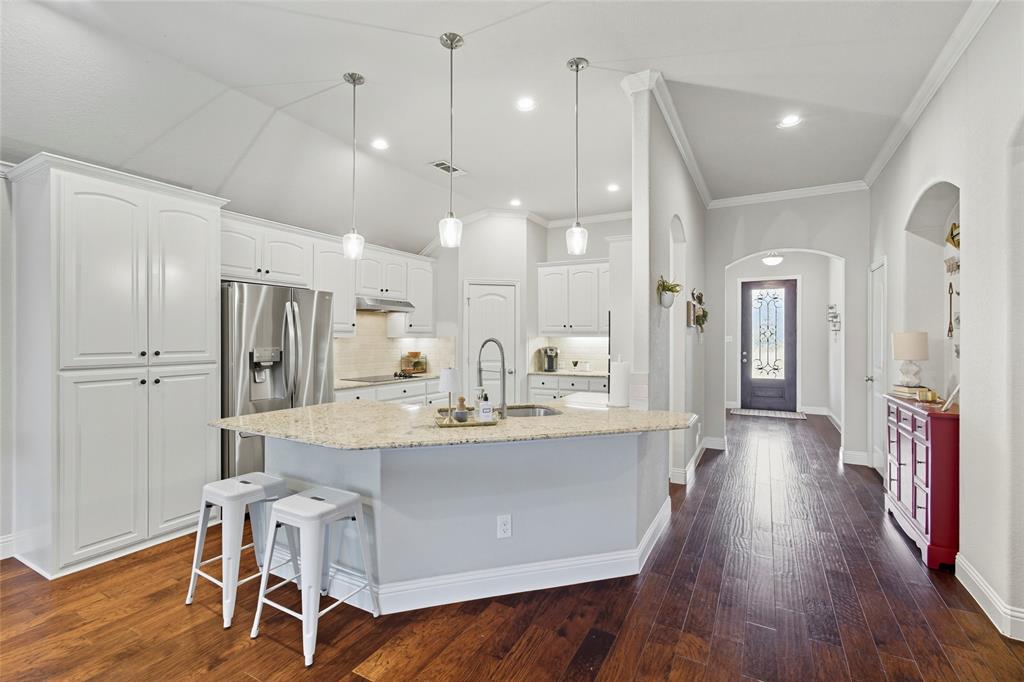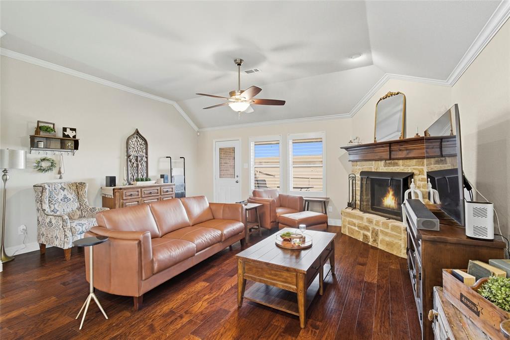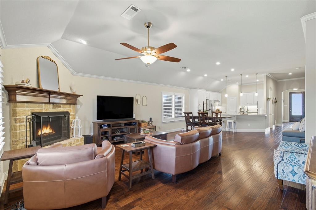 Inside, warm hardwood floors flow through the main living areas, complemented by crown molding and abundant natural light from plantation shutters. The open-concept design connects the living room—with a stone fireplace centerpiece—to the dining space and chef-inspired kitchen. Here, granite counters, stainless steel appliances, custom cabinetry, and a large island create the ideal setting for both everyday meals and entertaining.