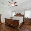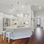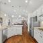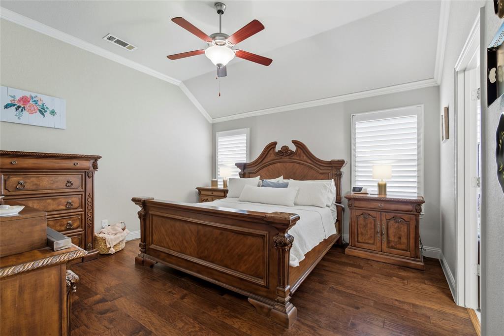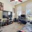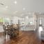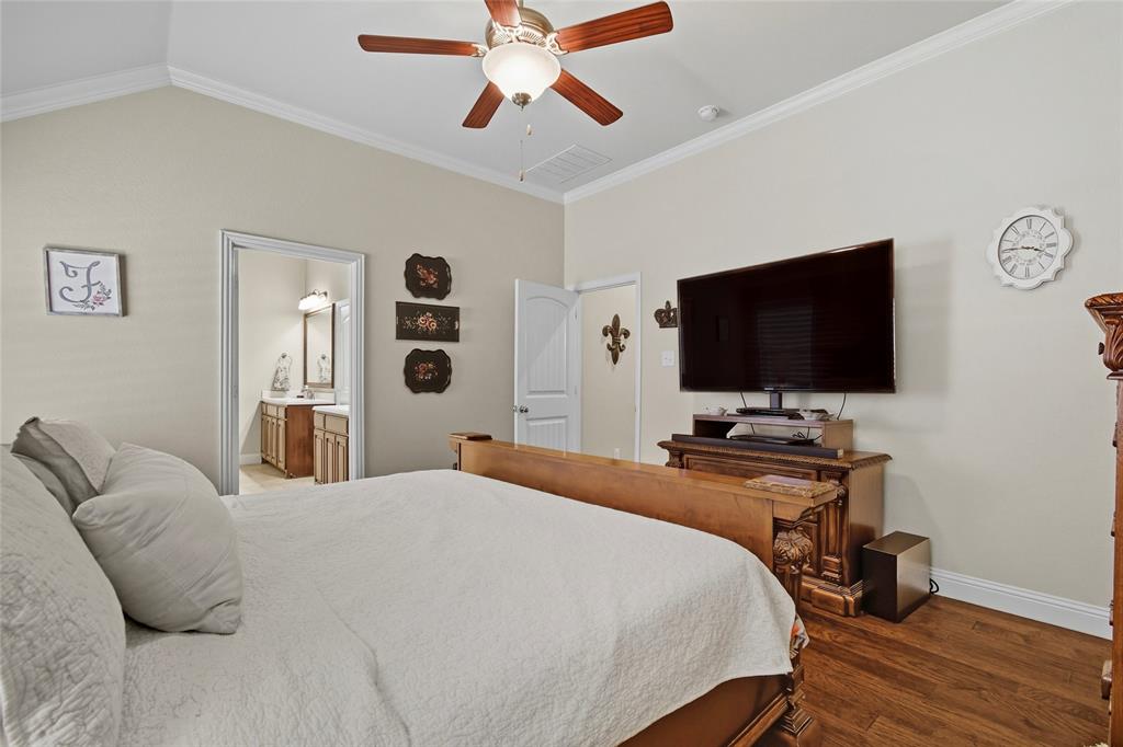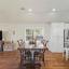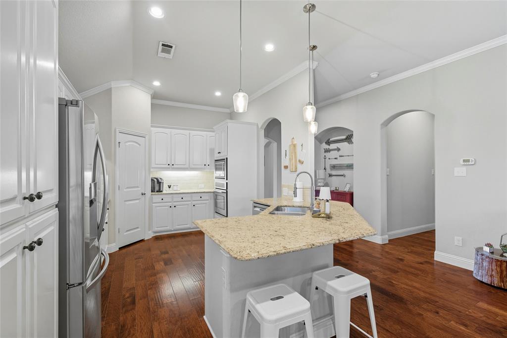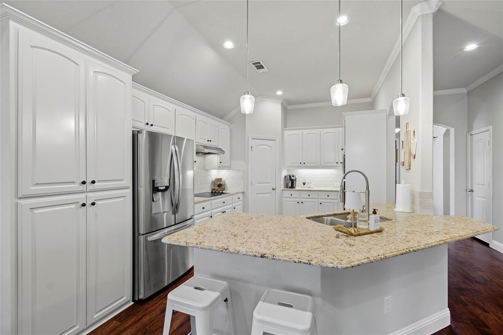 Inside, warm hardwood floors flow through the main living areas, complemented by crown molding and abundant natural light from plantation shutters. The open-concept design connects the living room—with a stone fireplace centerpiece—to the dining space and chef-inspired kitchen. Here, granite counters, stainless steel appliances, custom cabinetry, and a large island create the ideal setting for both everyday meals and entertaining.