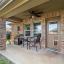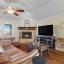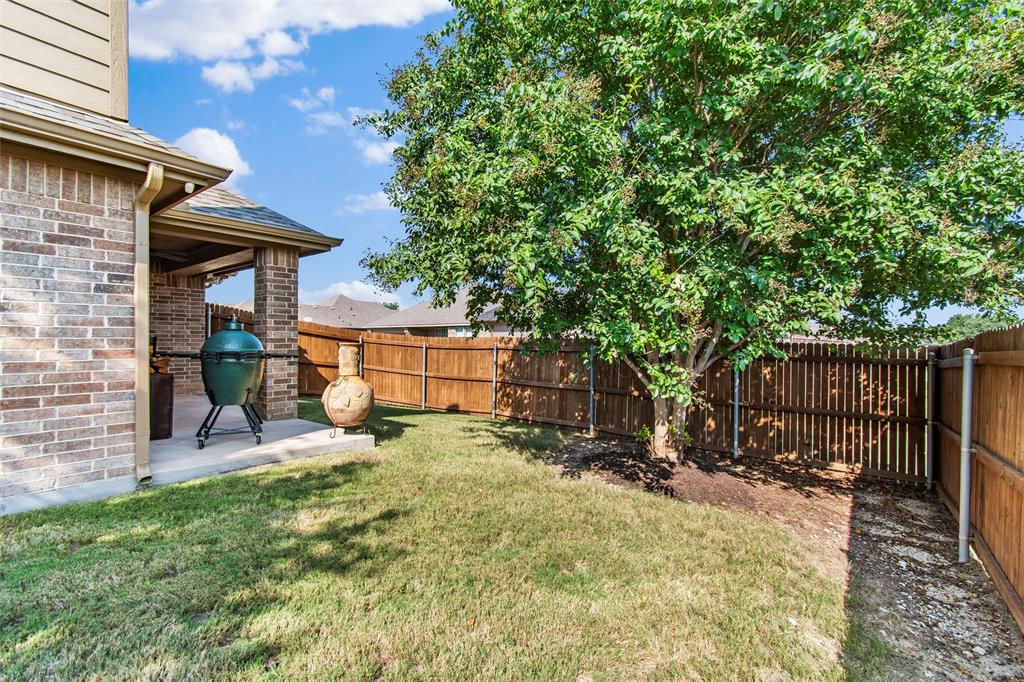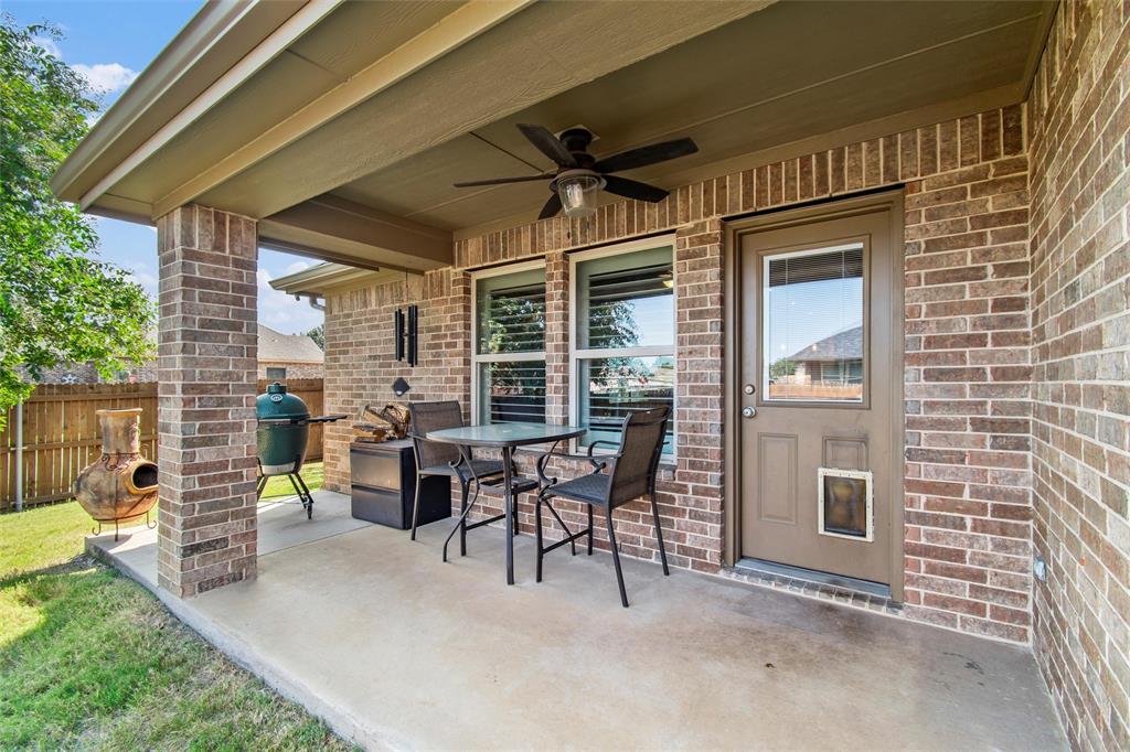Outdoors, the covered patio overlooks a private fenced yard shaded by mature trees—perfect for grilling, relaxing, or hosting friends.