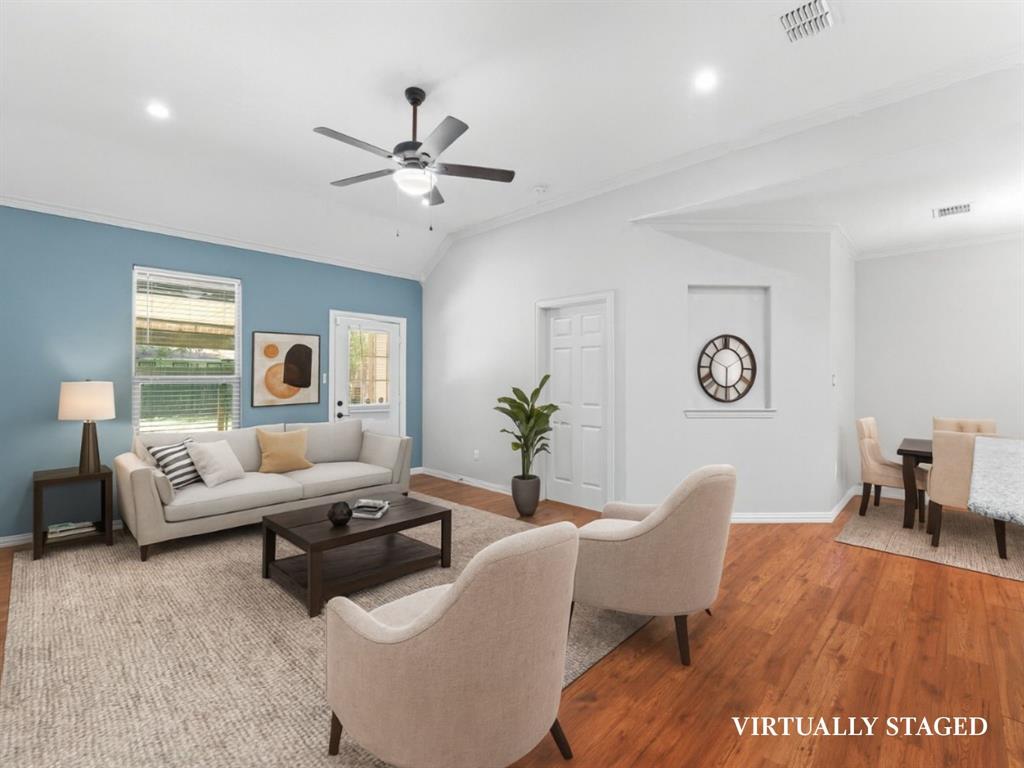 This traditional ranch-style residence showcases an open floorplan with wood-look flooring, crown molding, and abundant natural light. The kitchen stands out with white shaker cabinets, granite counters, stainless steel appliances, and a walk-in pantry—perfect for daily meals or entertaining. The spacious primary suite provides a quiet retreat, while additional bedrooms offer flexibility for guests, kids, or a home office.
