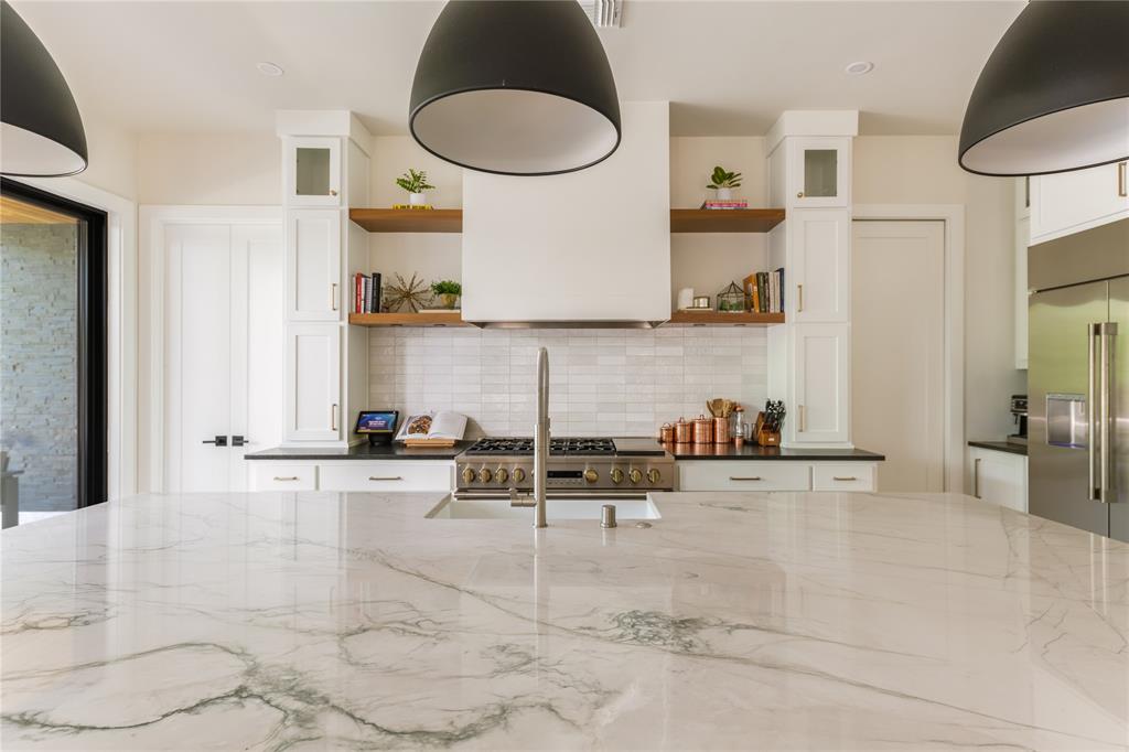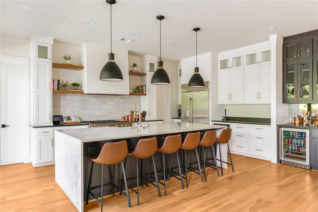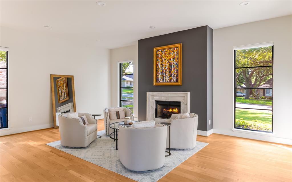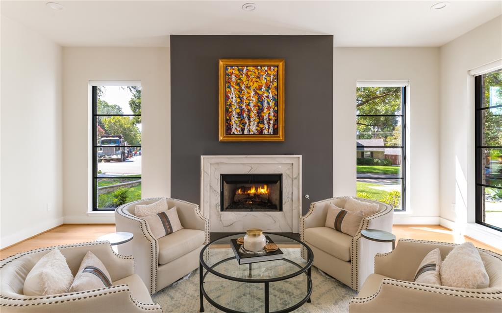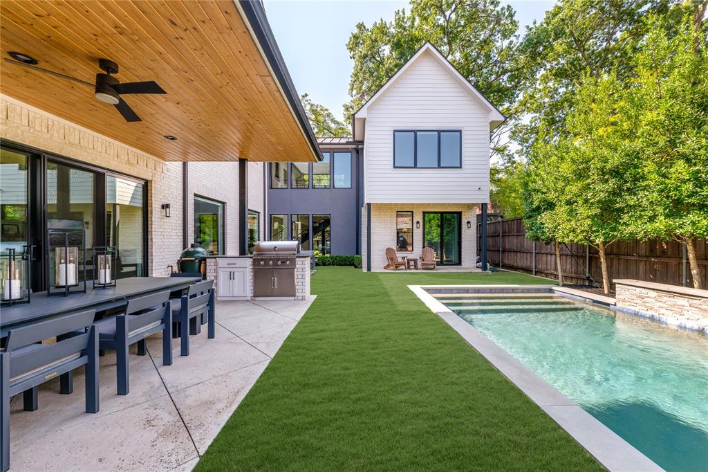Designed by 5 West and completed in 2021, the home showcases elegant living and dining spaces, a private office, and a full mother-in-law suite with sliding doors that open to the sparkling pool, outdoor fireplace, and covered living area. Upstairs, discover three secondary bedrooms, a spacious playroom, and an expansive primary retreat designed for comfort and privacy. Throughout, designer finishes, a striking floating metal staircase, museum-finish walls, and steel-framed windows highlight where sophistication meets exceptional design in a rare offering unlike any other.