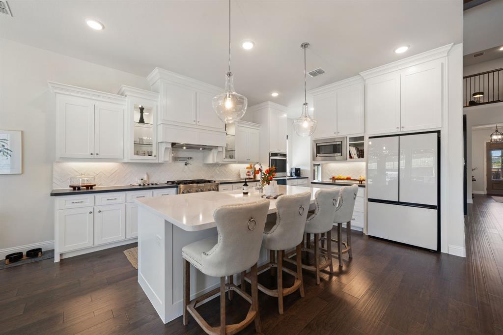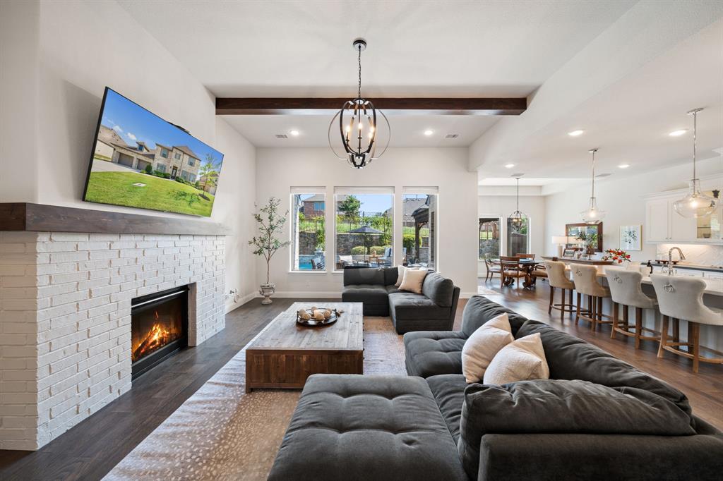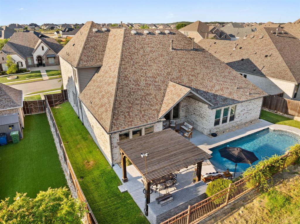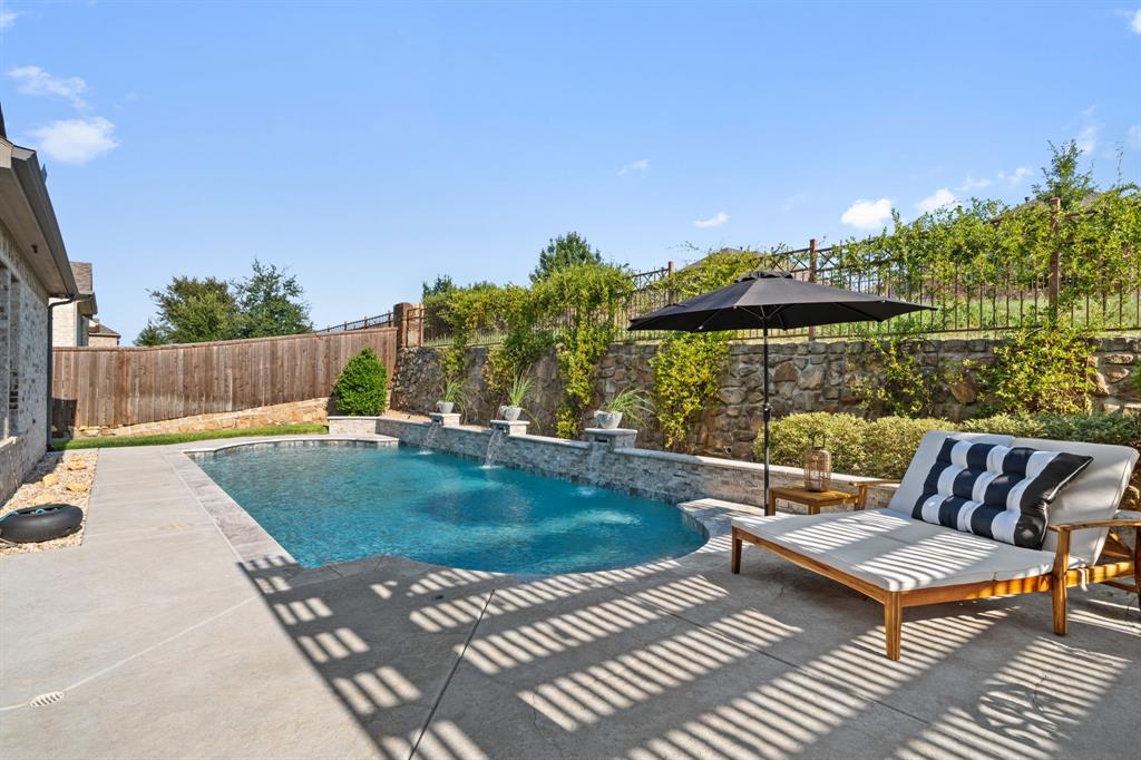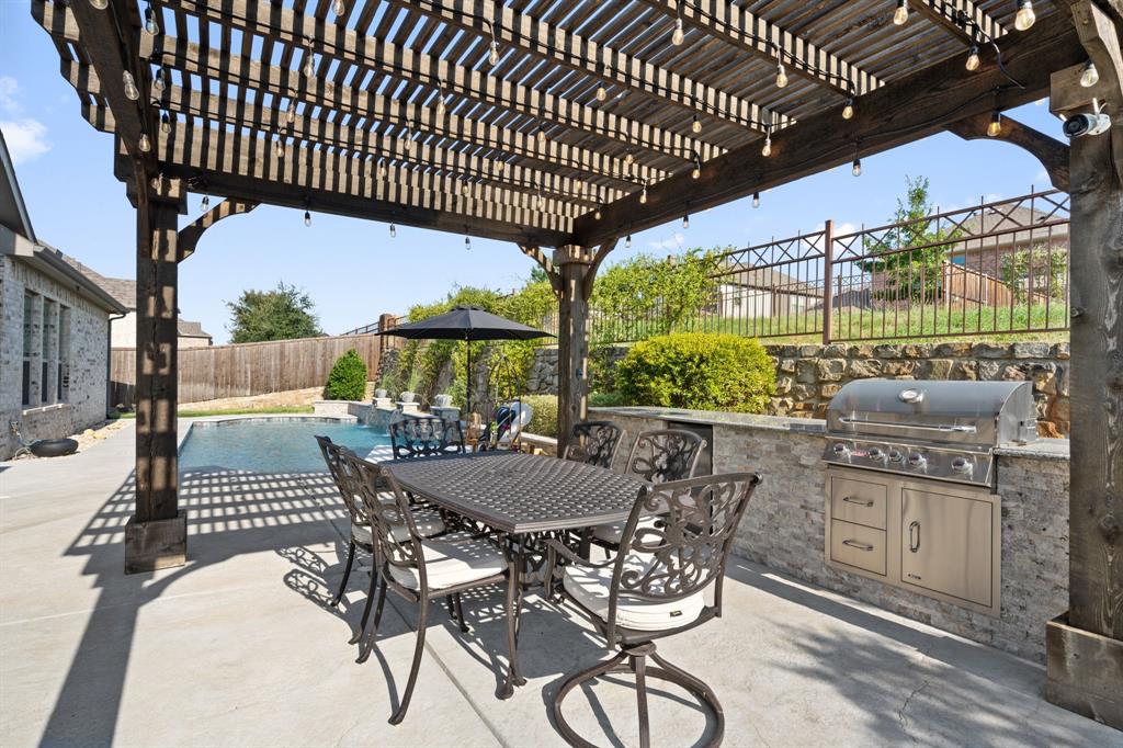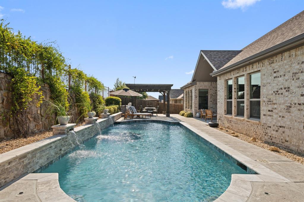 Gorgeous and immaculately maintained! Situated on a culdesac street with direct access to one of many paved trails of the master planned community Canyon Falls. This home exudes warmth and luxury from the moment you walk in. Warm wood flooring and neutral paint tones greet you as you enter. The main floor is perfectly laid out offering a dedicated office that could be utilized as a fifth bedroom, generous sized guest suite with full bath, half bath, massive utility room and a grand living room with wood beams, upgraded lighting and gas fireplace. Your dream kitchen awaits with tons of cabinetry, plenty of counter space, seated island, 6 burner gas stove, pot filler, double oven, pull out spice rack, polished nickel finishes and tons of natural light. The primary suite is tucked away with a spa like bath featuring separate vanities, soaking tub and frameless glass shower. You'll have sparkling pool views from almost every room on the main floor! The second story offers an additional living space, two bedrooms and two full bathrooms, one being ensuite and a bonus room, currently being utilized as a gym, but could be the perfect media room as it is wired for surround sound. The back yard is perfect for entertaining with covered patio overlooking the pool with waterfall features and LED lighting with phone app control. The pergola is wired for surround sound and provides the perfect spot for outdoor cooking. There is extensive counter space for meal prep and serving, built in beverage fridge and direct plumbed Bull gas grill. Your new home comes with smart features for your sprinkler system, thermostats, pool and security. Canyon Falls is where nature meets community and offers tons of fabulous amenities for residents including pool, fitness center, pooch park, fishing, hiking, biking and tons of activities and events. HOA dues cover front yard maintenance, cable and internet. Zones to highly rated Argyle ISD and within walking distance to schools.