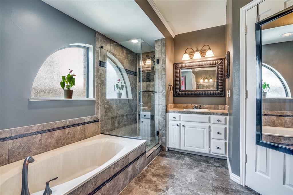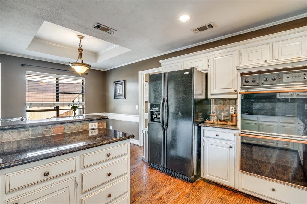 The kitchen is thoughtfully designed with granite countertops, a smooth cooktop, and double ovens—ideal for hosting or everyday meals. The secluded owner's suite features double doors leading to a luxurious en suite bath with dual walk-in closets, a garden tub, and a sleek, updated seamless glass shower.