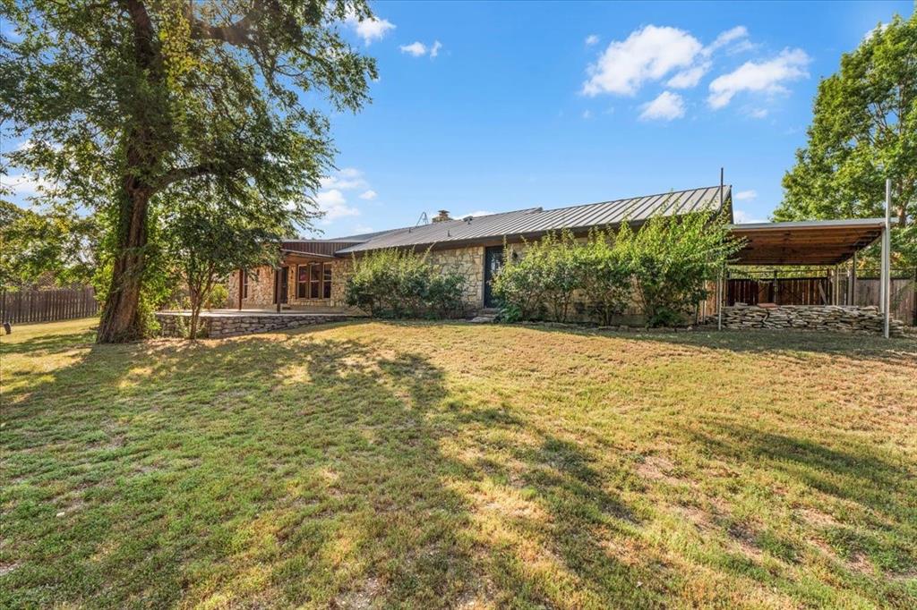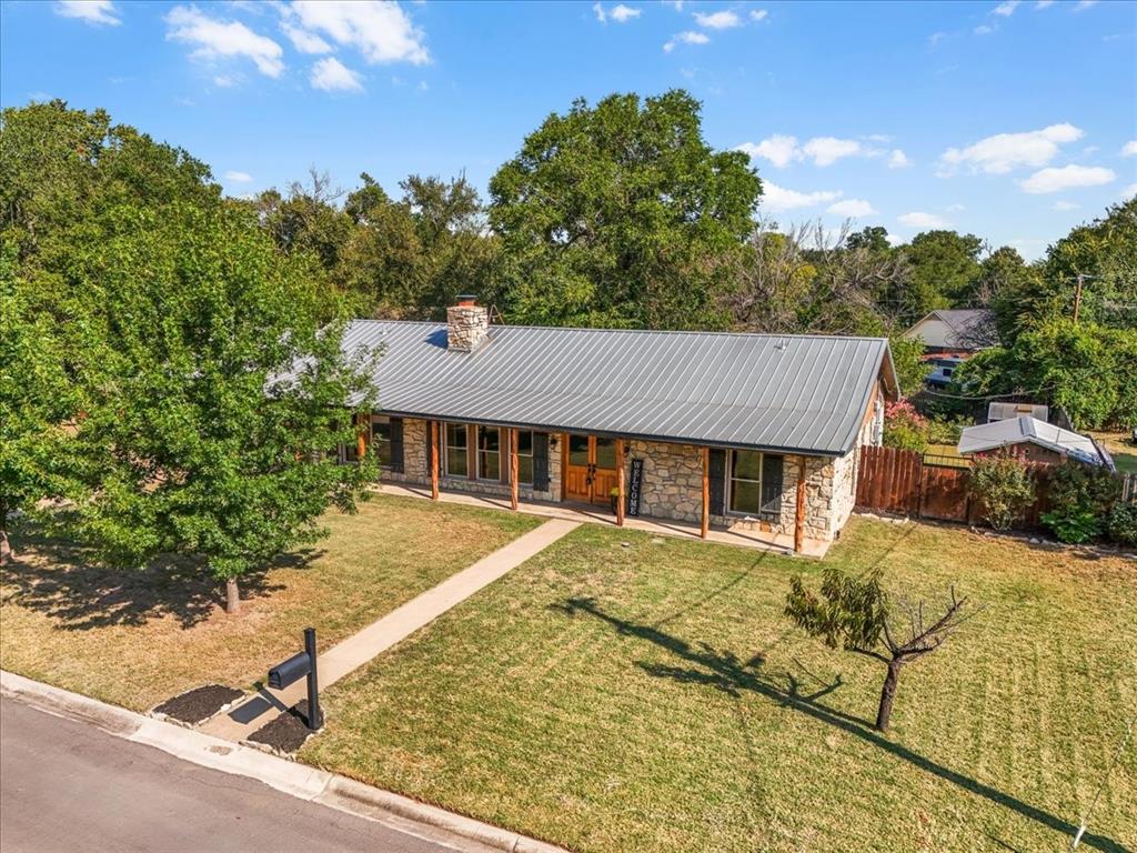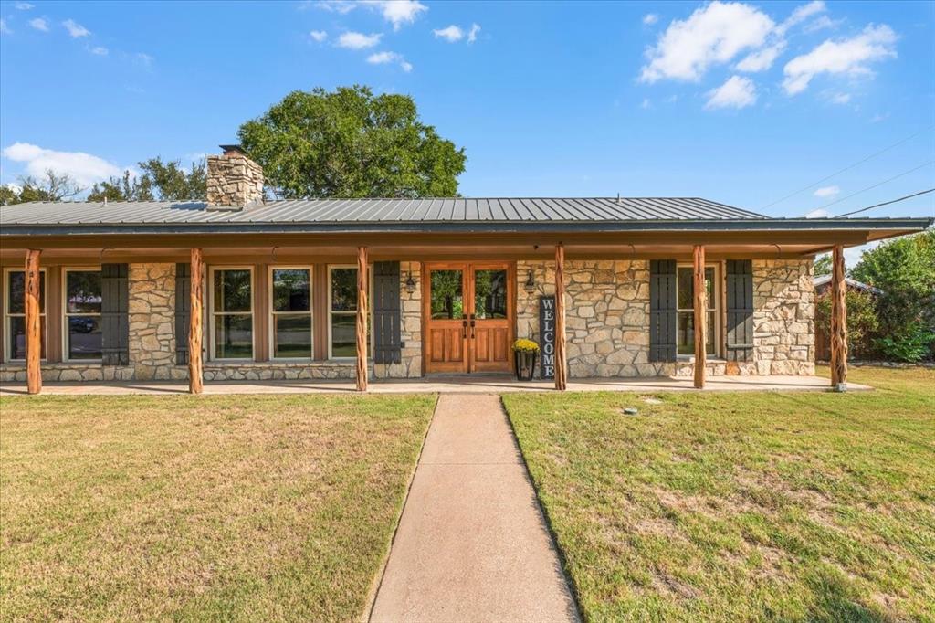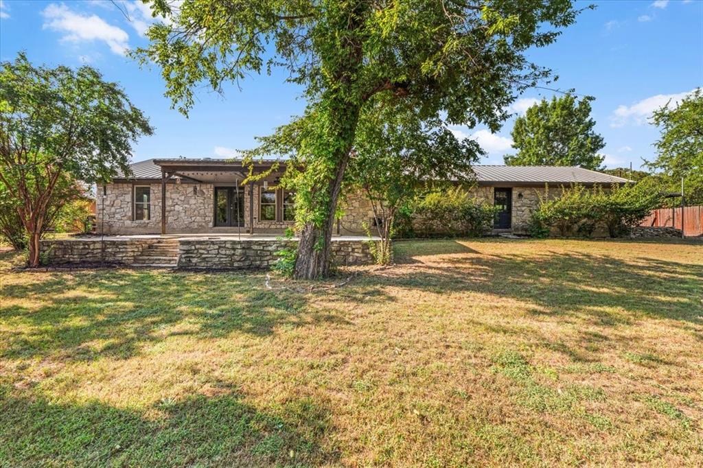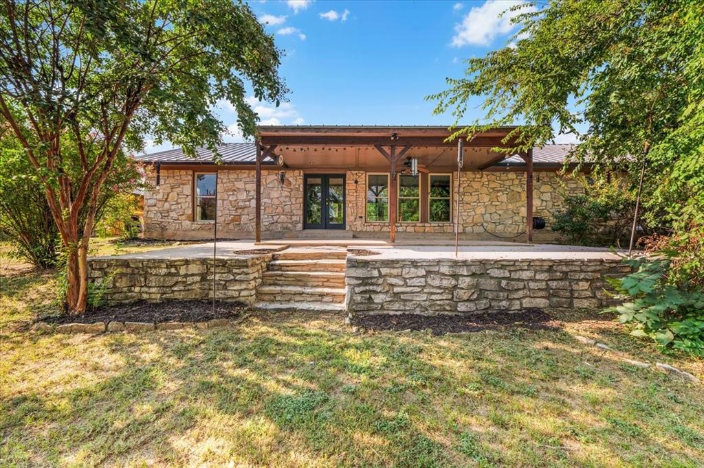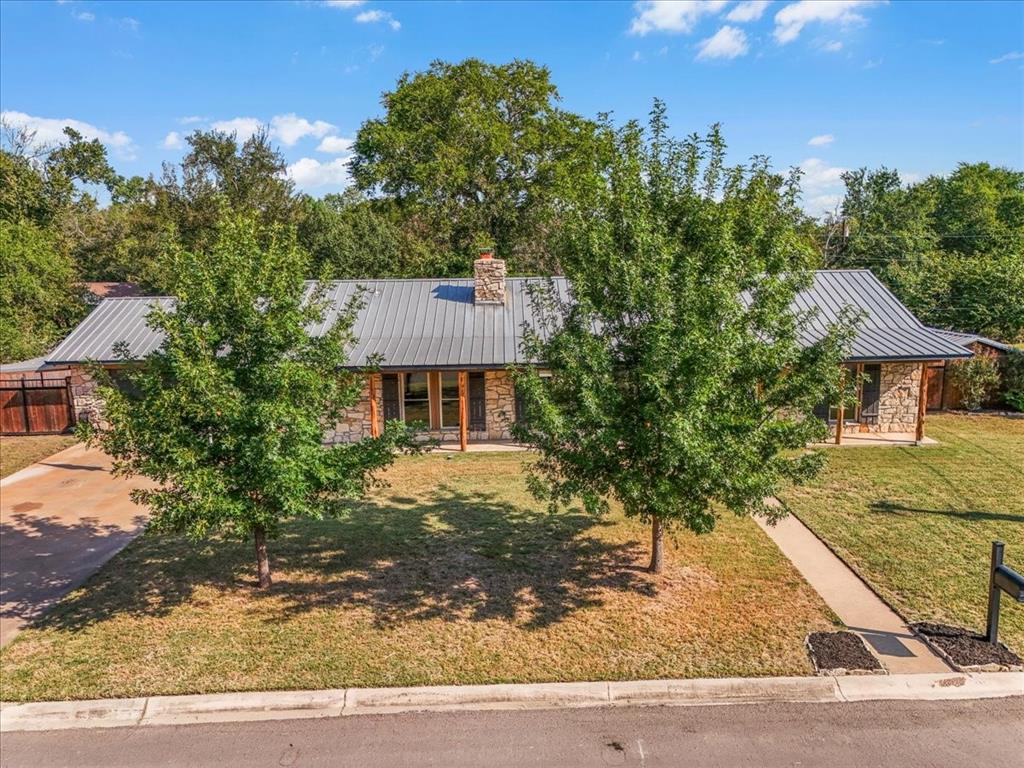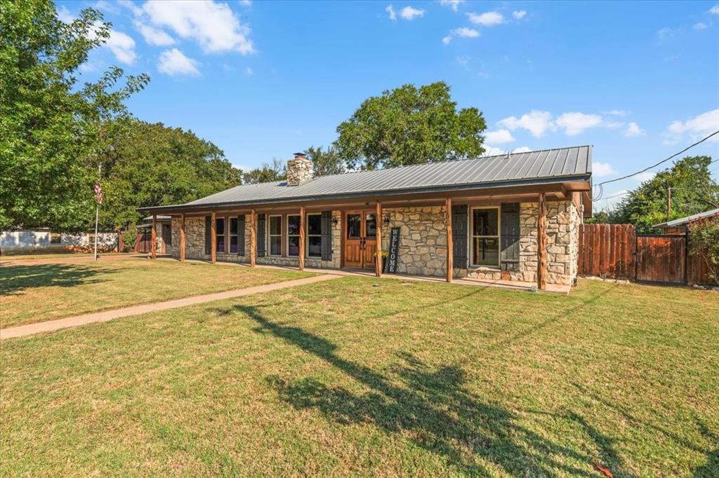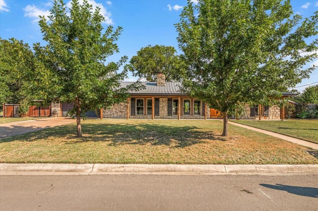 Welcome to this charming stone ranch-style home offering 3 bedrooms, 2 bathrooms, and 1,829 sq. ft. of living space. Nestled on a beautifully landscaped .43-acre lot, this property boasts mature trees, lush greenery, and a sprinkler system in the front and back yard. From the moment you arrive, the timeless stone exterior, metal roof, and inviting front porch set the tone for the warmth inside. Step into the spacious living room featuring rustic wood beams, a cozy floor-to-ceiling stone fireplace, and expansive windows that fill the space with natural light. The open layout flows into a raised dining area with French doors leading to the backyard, making it ideal for entertaining. The backyard is a true retreat, offering a stone patio perfect for outdoor gatherings, a covered structure with storage, and plenty of space shaded by mature trees. Whether you are hosting guests or enjoying a quiet evening, this outdoor space is designed for comfort and relaxation. With its blend of character, modern conveniences, and a generous lot, this home provides the perfect setting for both everyday living and memorable occasions.