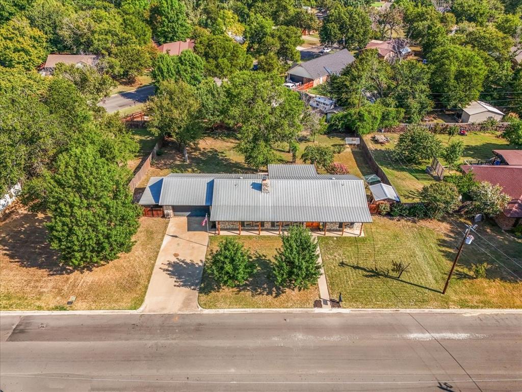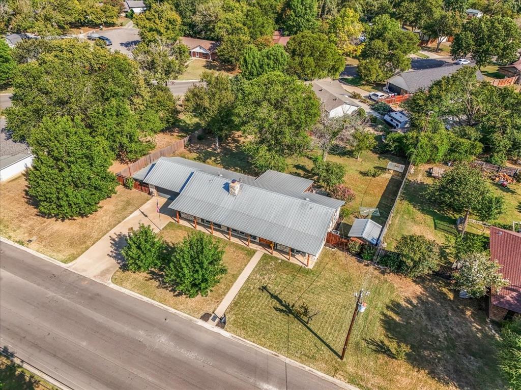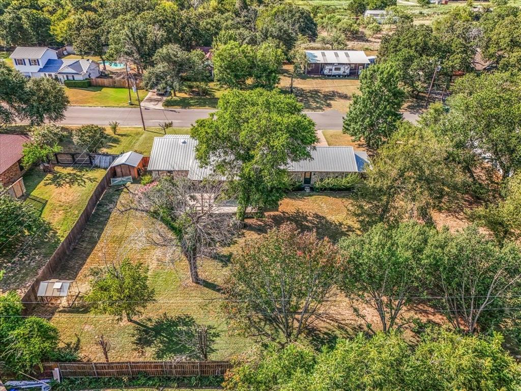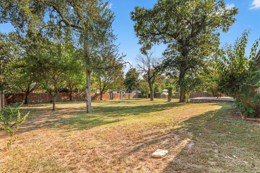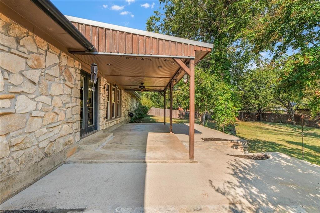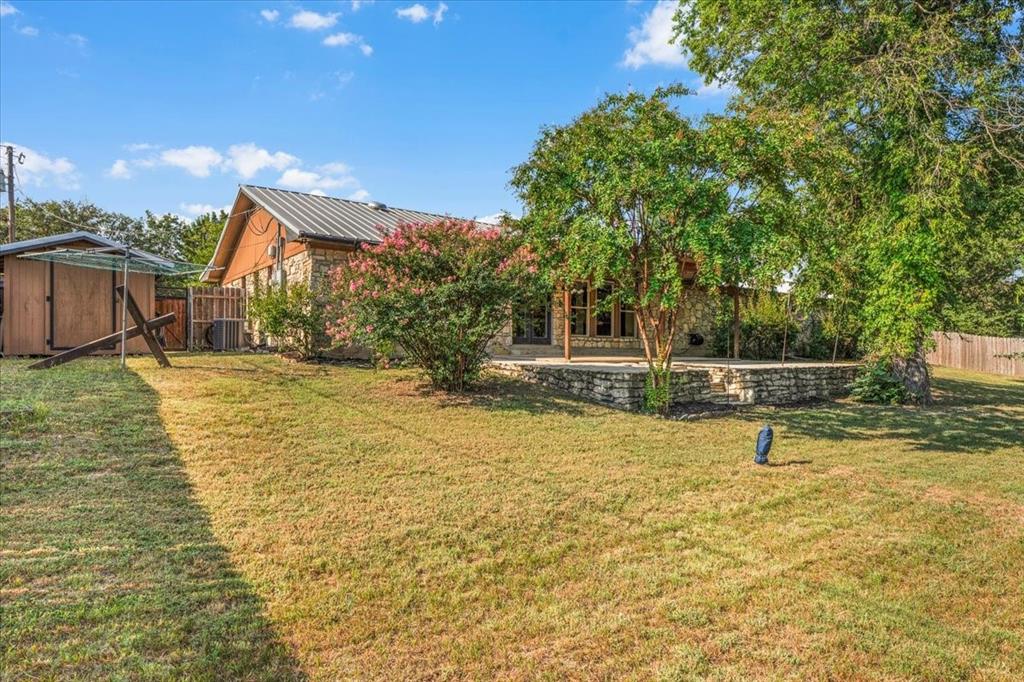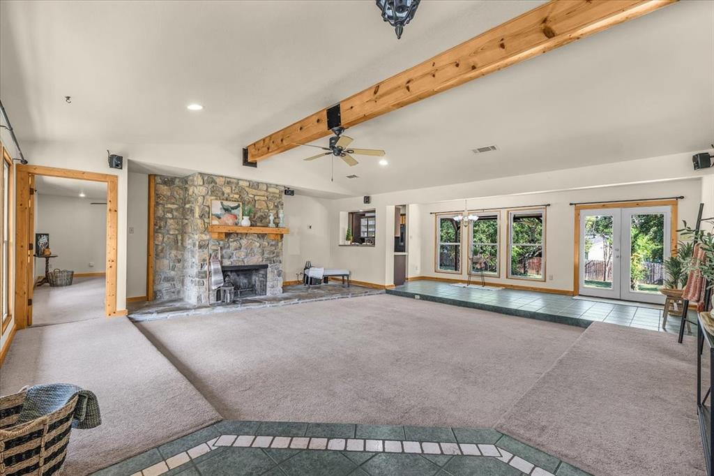 Welcome to this charming stone ranch-style home offering 3 bedrooms, 2 bathrooms, and 1,829 sq. ft. of living space. Nestled on a beautifully landscaped .43-acre lot, this property boasts mature trees, lush greenery, and a sprinkler system in the front and back yard. From the moment you arrive, the timeless stone exterior, metal roof, and inviting front porch set the tone for the warmth inside. Step into the spacious living room featuring rustic wood beams, a cozy floor-to-ceiling stone fireplace, and expansive windows that fill the space with natural light. The open layout flows into a raised dining area with French doors leading to the backyard, making it ideal for entertaining. The backyard is a true retreat, offering a stone patio perfect for outdoor gatherings, a covered structure with storage, and plenty of space shaded by mature trees. Whether you are hosting guests or enjoying a quiet evening, this outdoor space is designed for comfort and relaxation. With its blend of character, modern conveniences, and a generous lot, this home provides the perfect setting for both everyday living and memorable occasions.