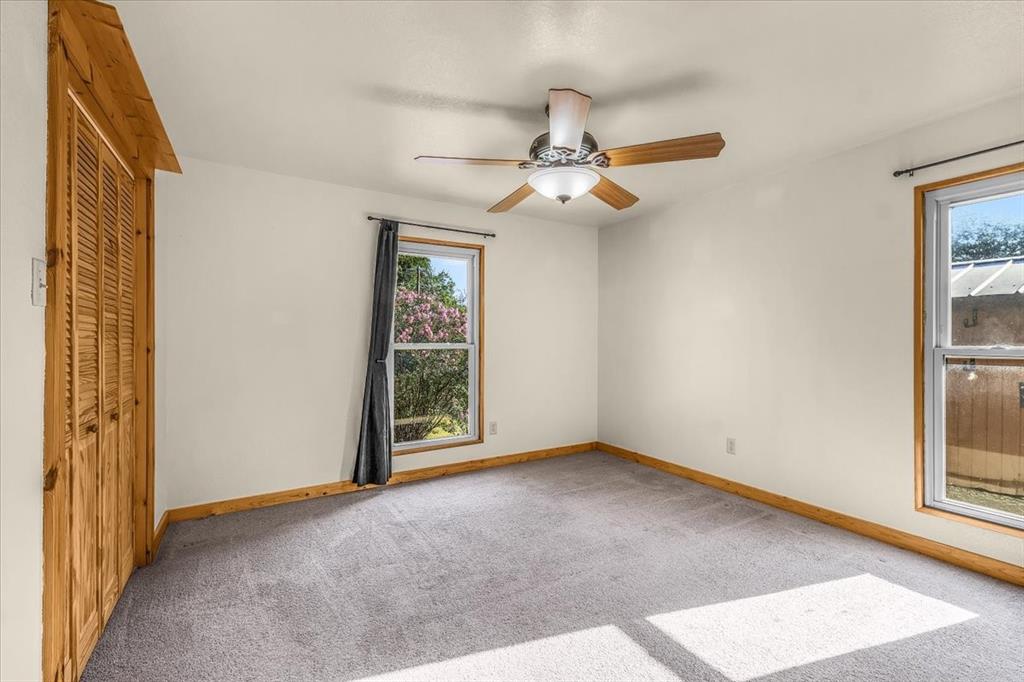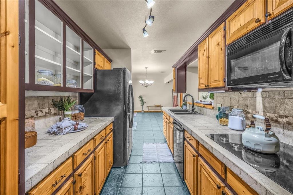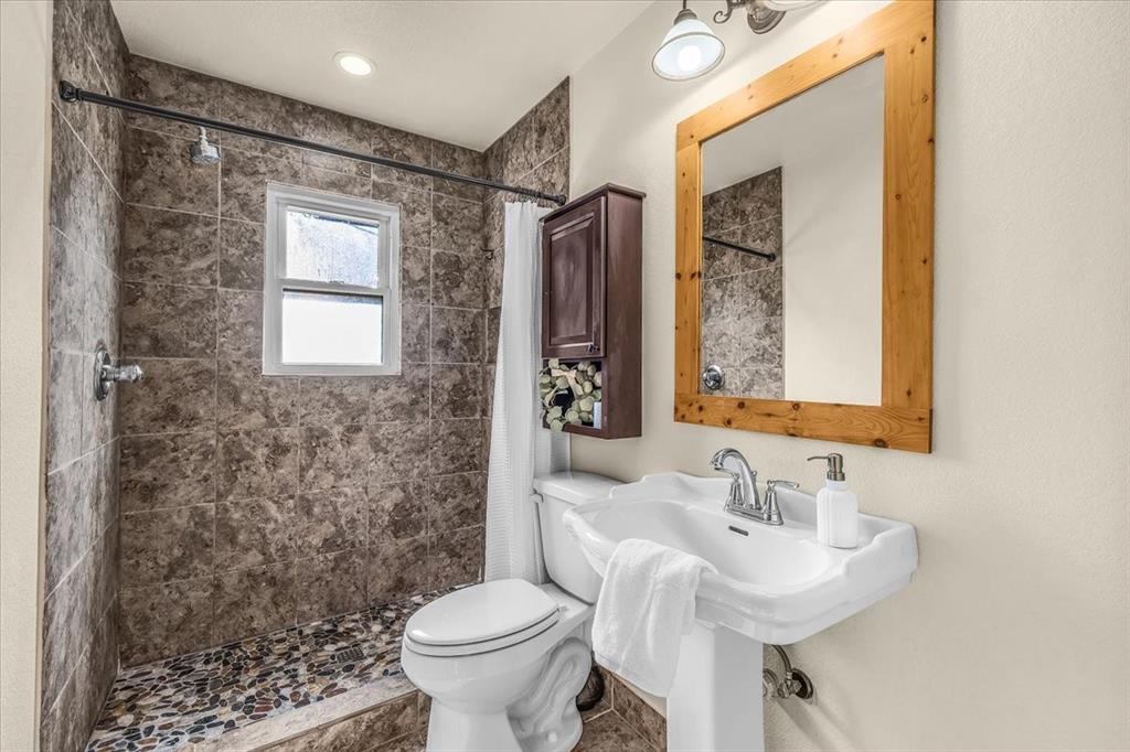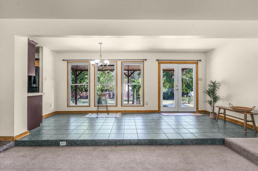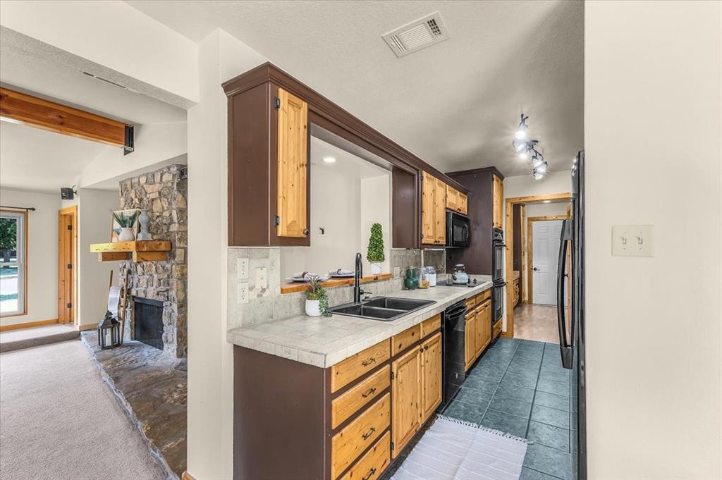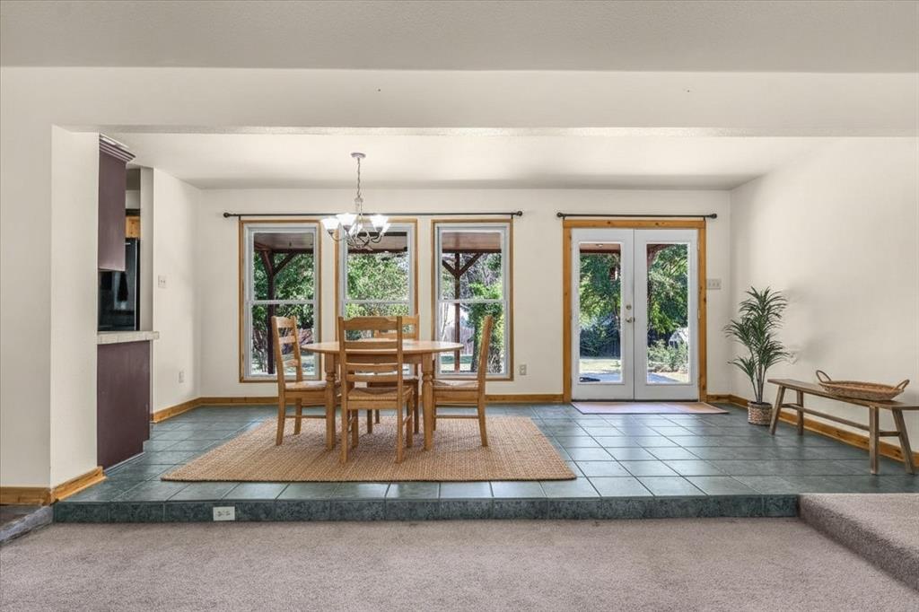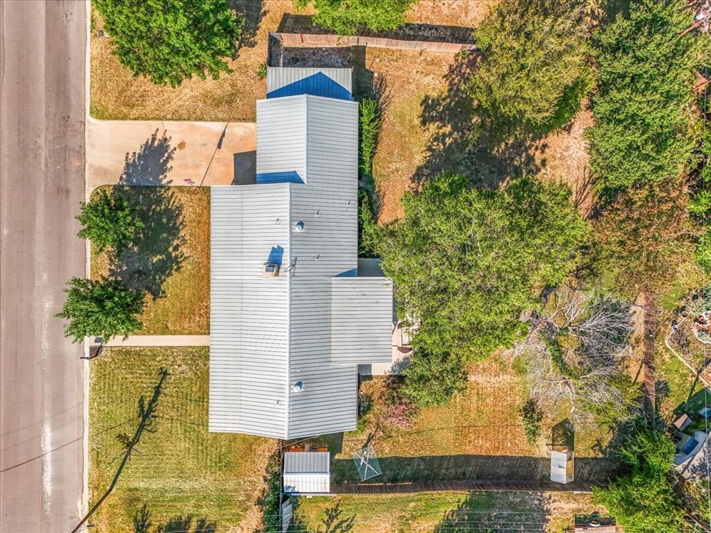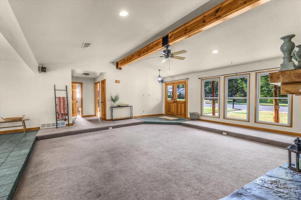 Welcome to this charming stone ranch-style home offering 3 bedrooms, 2 bathrooms, and 1,829 sq. ft. of living space. Nestled on a beautifully landscaped .43-acre lot, this property boasts mature trees, lush greenery, and a sprinkler system in the front and back yard. From the moment you arrive, the timeless stone exterior, metal roof, and inviting front porch set the tone for the warmth inside. Step into the spacious living room featuring rustic wood beams, a cozy floor-to-ceiling stone fireplace, and expansive windows that fill the space with natural light. The open layout flows into a raised dining area with French doors leading to the backyard, making it ideal for entertaining. The backyard is a true retreat, offering a stone patio perfect for outdoor gatherings, a covered structure with storage, and plenty of space shaded by mature trees. Whether you are hosting guests or enjoying a quiet evening, this outdoor space is designed for comfort and relaxation. With its blend of character, modern conveniences, and a generous lot, this home provides the perfect setting for both everyday living and memorable occasions.