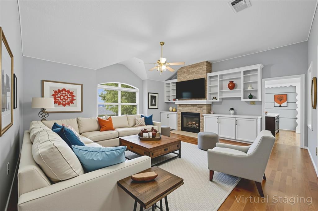 The huge master suite features a sitting area and a cozy private fireplace, while a second fireplace adds warmth to the main living spaces. Practical upgrades include Class IV impact-resistant shingles (2017) and a home warranty included for peace of mind. Enjoy a custom built bar and cabinetry in the den and master suite.