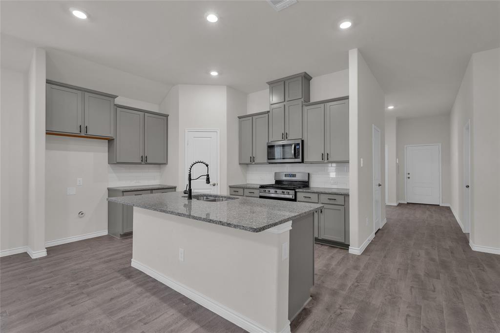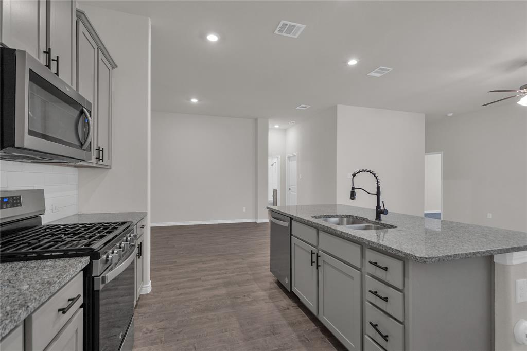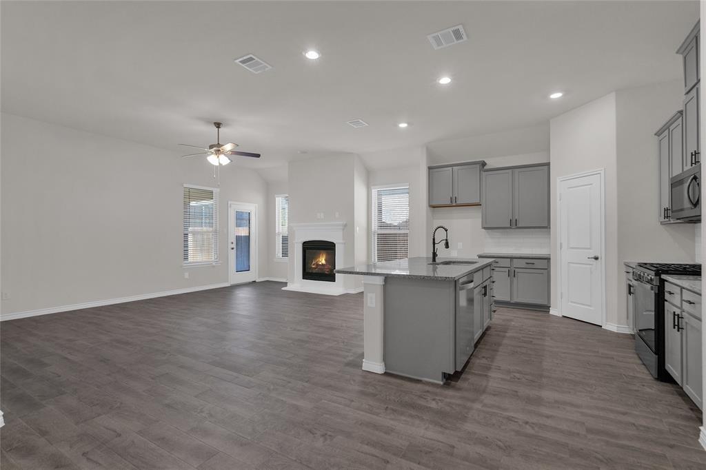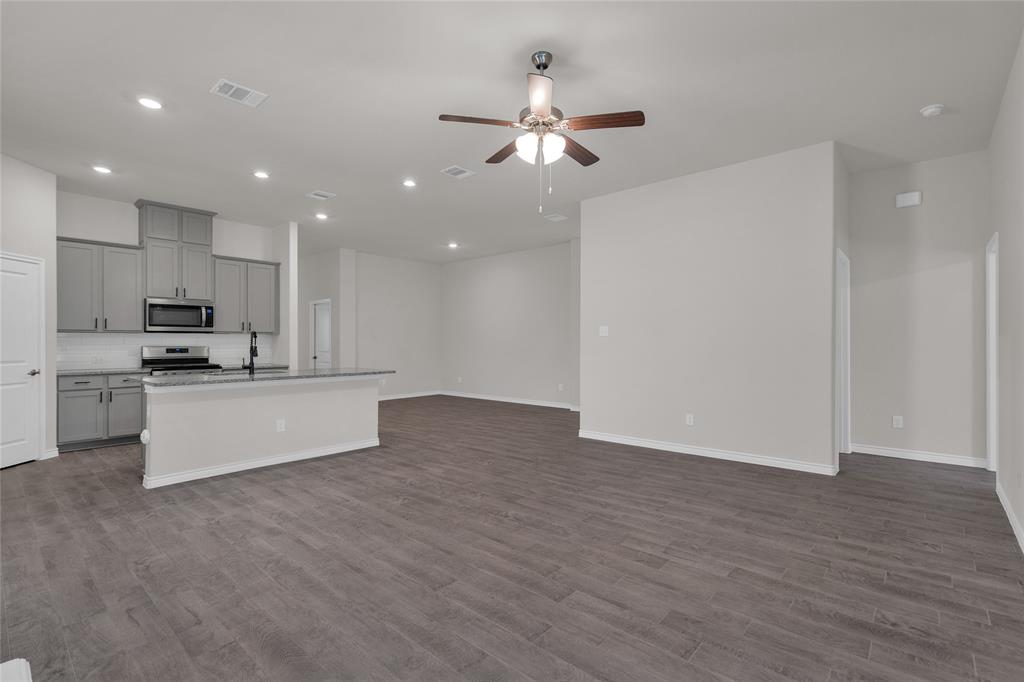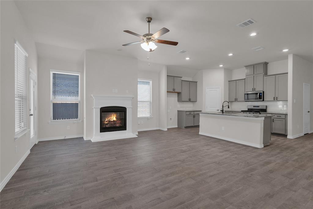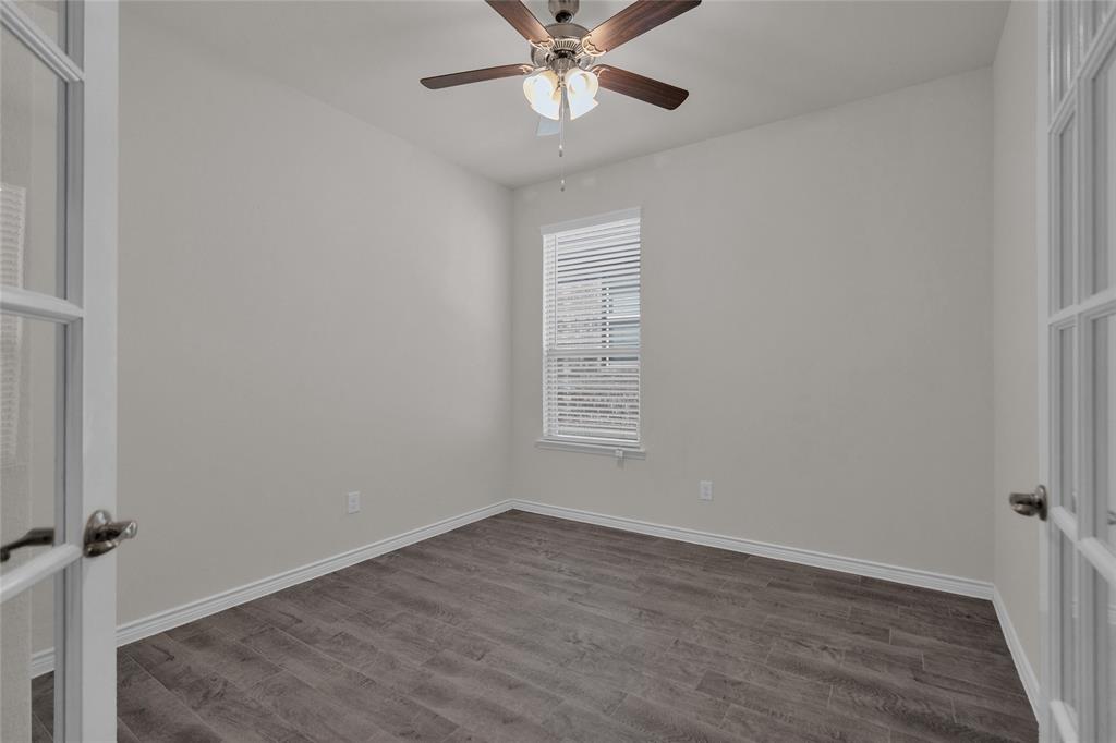 A single-story house with three bedrooms, plus an office that can double as a fourth bedroom since it has French doors and its own closet. It’s got three bathrooms, and it’s a bright, open-concept layout in mind. There’s a big center island in the kitchen great for barstools, stainless steel appliances, a gas burner stove, and granite countertops. The primary bathroom has that spa-like feel, and outside you’ve got a fully fenced backyard with a covered patio. It has a lot of charm and a lot of flexibility for someone looking for a bright and inviting home.
