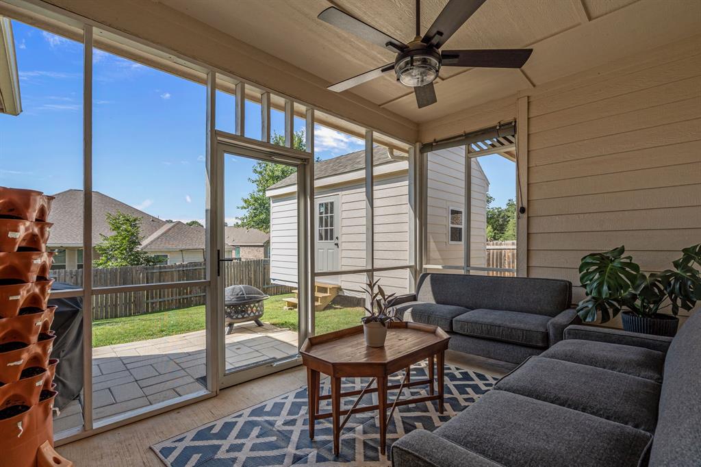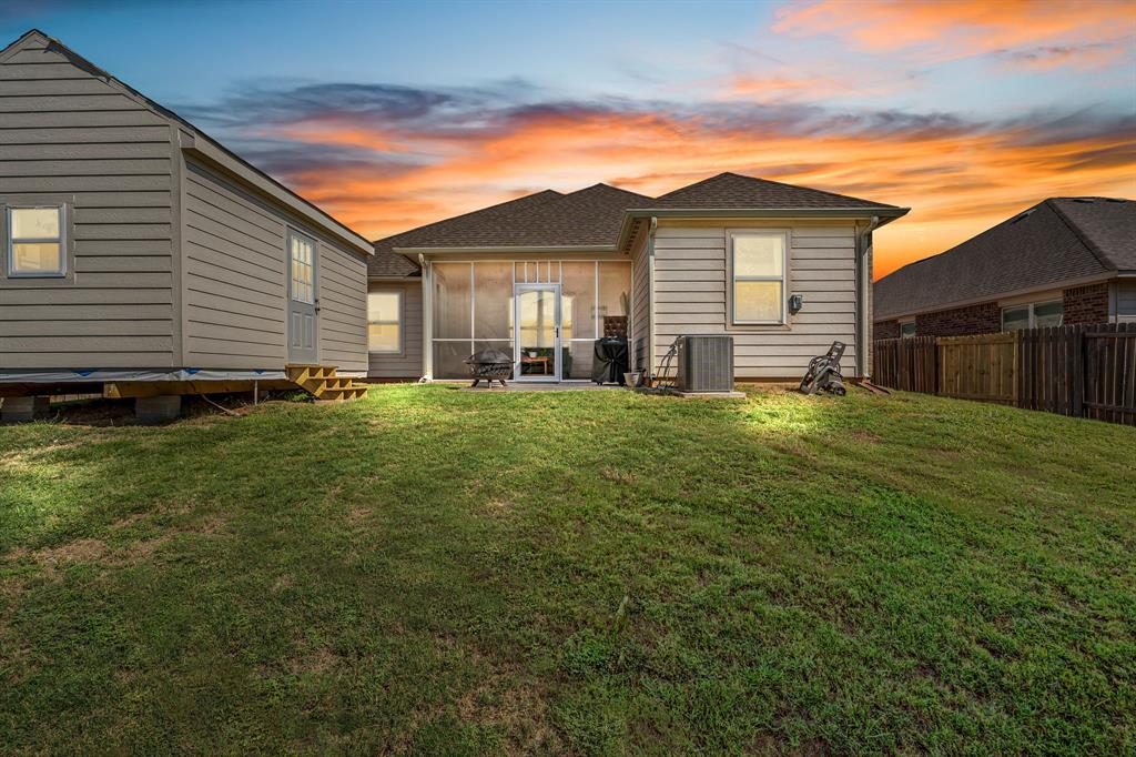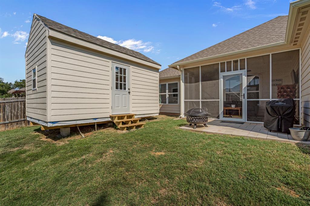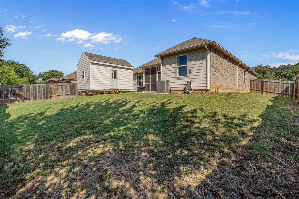 The kitchen is a chef’s dream, boasting granite countertops, stainless steel appliances and a massive walk-in pantry for all your storage needs. The generously sized master suite includes an en-suite bathroom with a soaking tub and separate shower, along with a large walk-in closet. The home’s split-bedroom design ensures privacy for family or guests. Step outside to enjoy a fully enclosed screened-in porch that flows into an extended open patio area — ideal for morning coffee or evening gatherings. The expansive backyard also features a recently added 16X10 shed with electricity, offering even more storage or workspace options. Additional highlights include custom soft-close cabinetry in the utility room, and a decked attic space providing bonus storage. Enjoy no HOA! Close proximity to schools. Easy access to Loop 288 & HWY 380. This home won't last!
