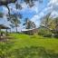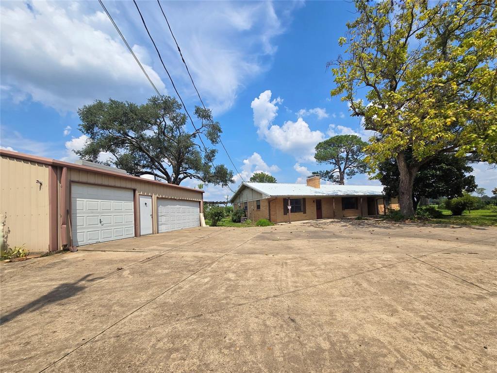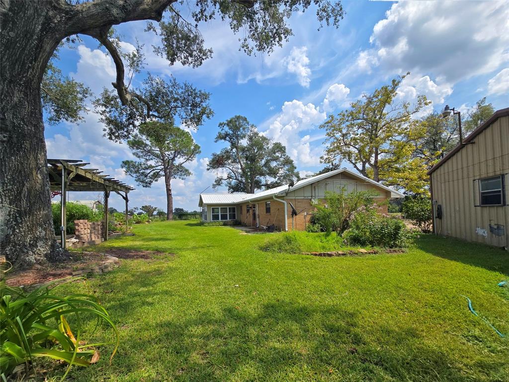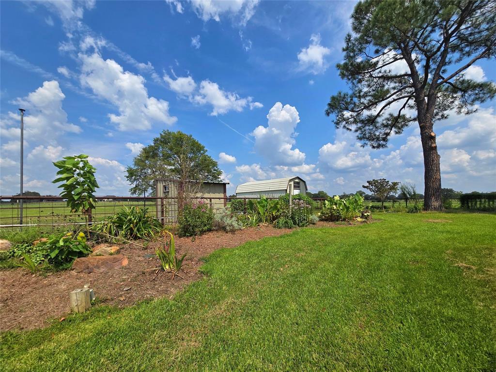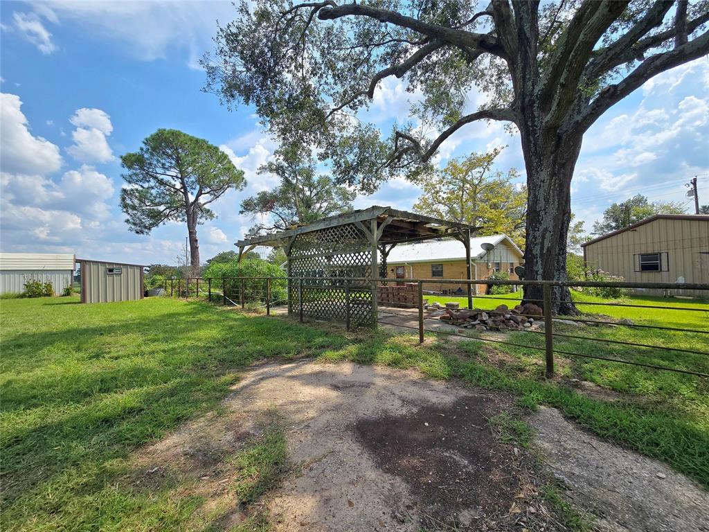 Outdoors, the property includes a detached 3-car garage, a small workshop, and a well house with a working water well dedicated to garden and yard watering. The backyard features several landscaping elements, a greenhouse, and a pergola that provides shade and character, though in need of repair. With pastureland surrounding the home, there are open views, and the property lines extend beyond the current fencing with visible survey stakes in place.