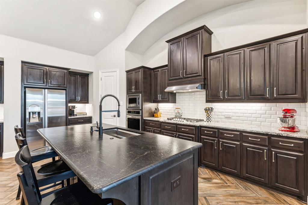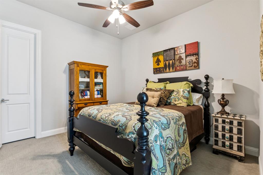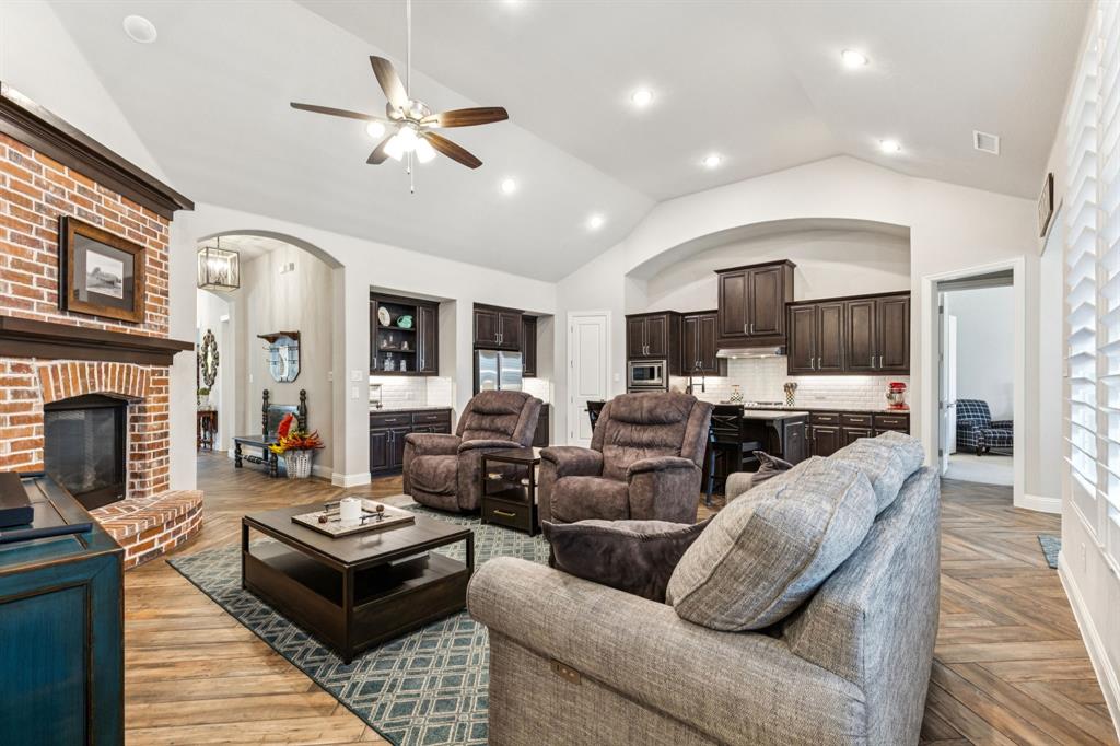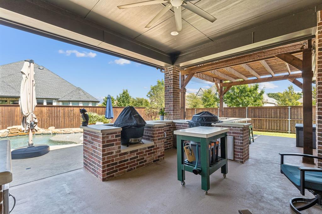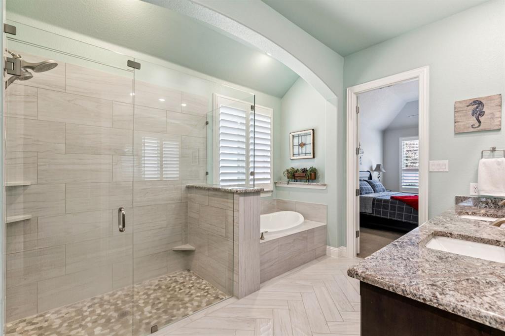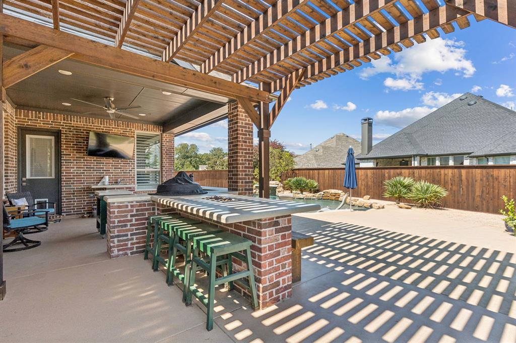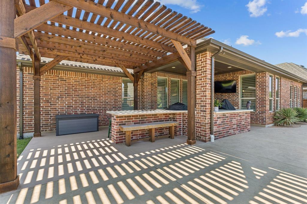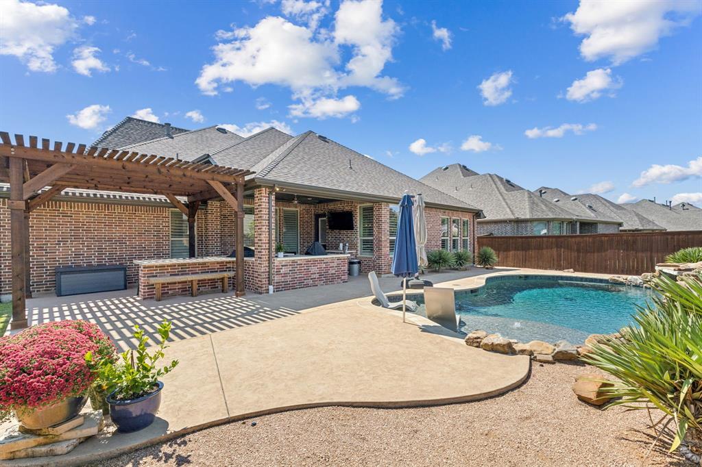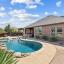 Stunning 2018 Highland Homes Single-Story in Award-Winning Wildridge! Located on a private cul-de-sac, this beautifully updated home combines thoughtful design, timeless finishes, and an impressive list of recent upgrades. Featuring a rare 4-car garage with epoxy floors, built-in custom cabinets, and overhead storage, plus a bonus room, private study, and sprawling open-concept layout, this home is ideal for both entertaining and everyday living. Step inside through the custom 4' x 8' iron front door with transom (2024) to find a light-filled interior with soaring ceilings and a smart floor plan. The kitchen is a showstopper, boasting new granite on the island (2023), stainless steel appliances including a gas cooktop, walk-in pantry, and plenty of storage. New flooring throughout all living areas, the master bath, and laundry (2023). The private primary suite is a true retreat, offering a spa-inspired en-suite with dual sinks, makeup station, soaking tub, frameless glass shower, and a large walk-in closet connected to the laundry room. Every window is dressed with plantation shutters, adding elegance and functionality. Step outside to your backyard oasis, complete with a sparkling pool, epoxy-coated patio floors, outdoor kitchen with EVO cooktop, and a cedar pergola with new slats (2024)—perfect for year-round gatherings. The home’s curb appeal is enhanced by a new roof (2024) and new exterior paint (2024). Additional highlights include a new water heater (2025) and bi-annual HVAC service.