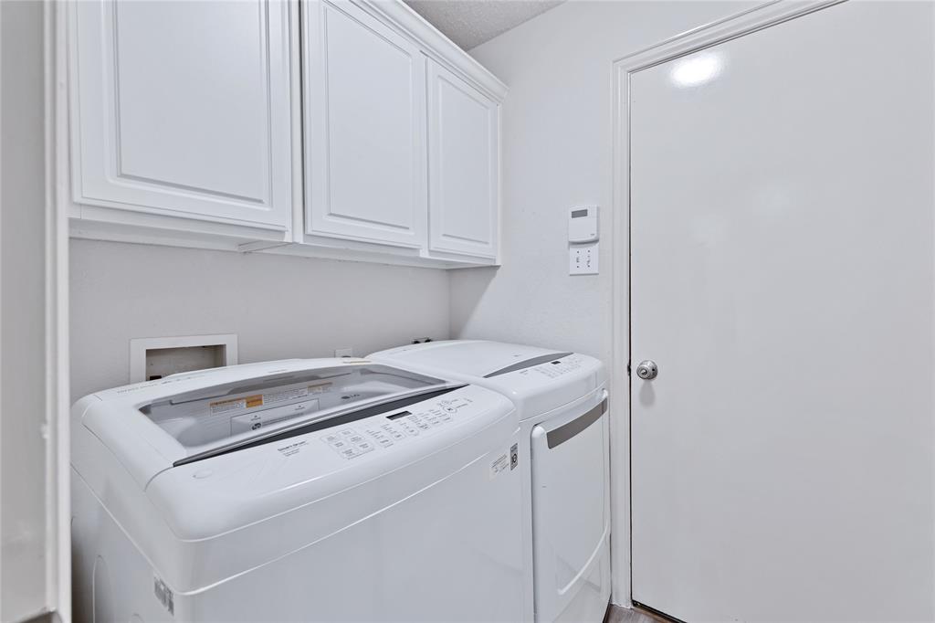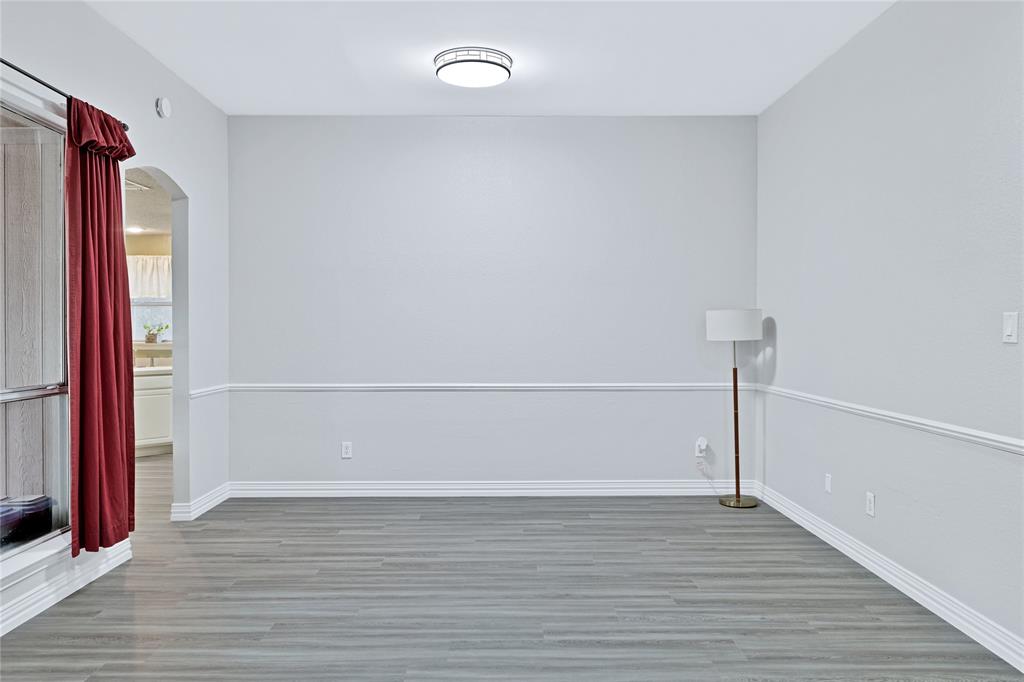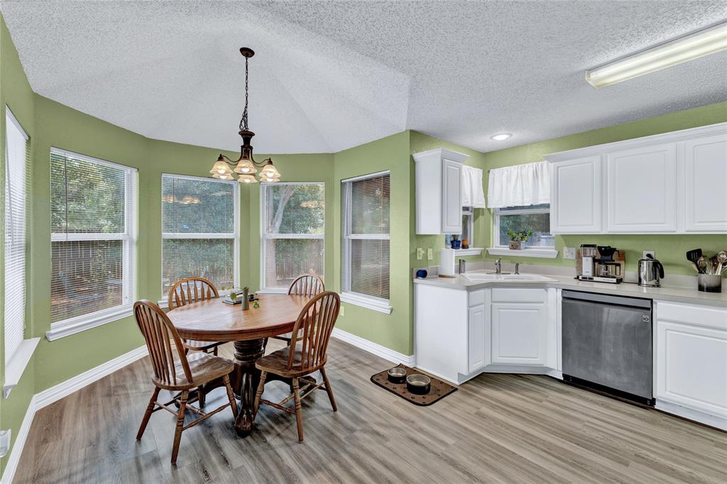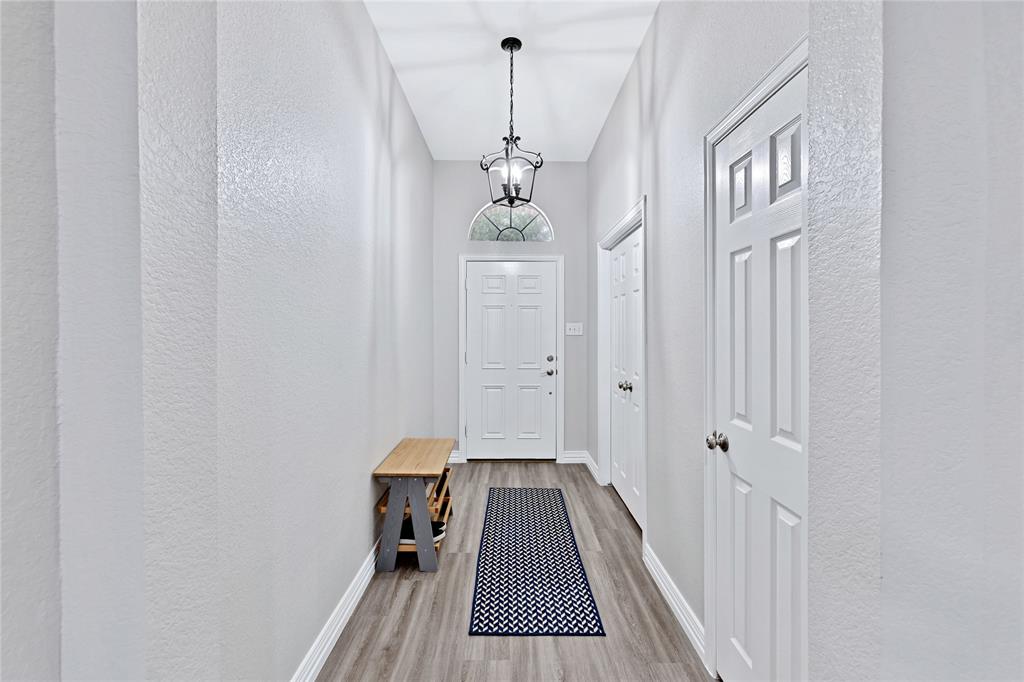 The spacious main living area showcases luxury vinyl plank flooring, recently renovated for a modern, clean look that flows effortlessly throughout. The kitchen features all-white cabinetry and connects to a convenient mess room with full washer-dryer hookups—making household routines a breeze.