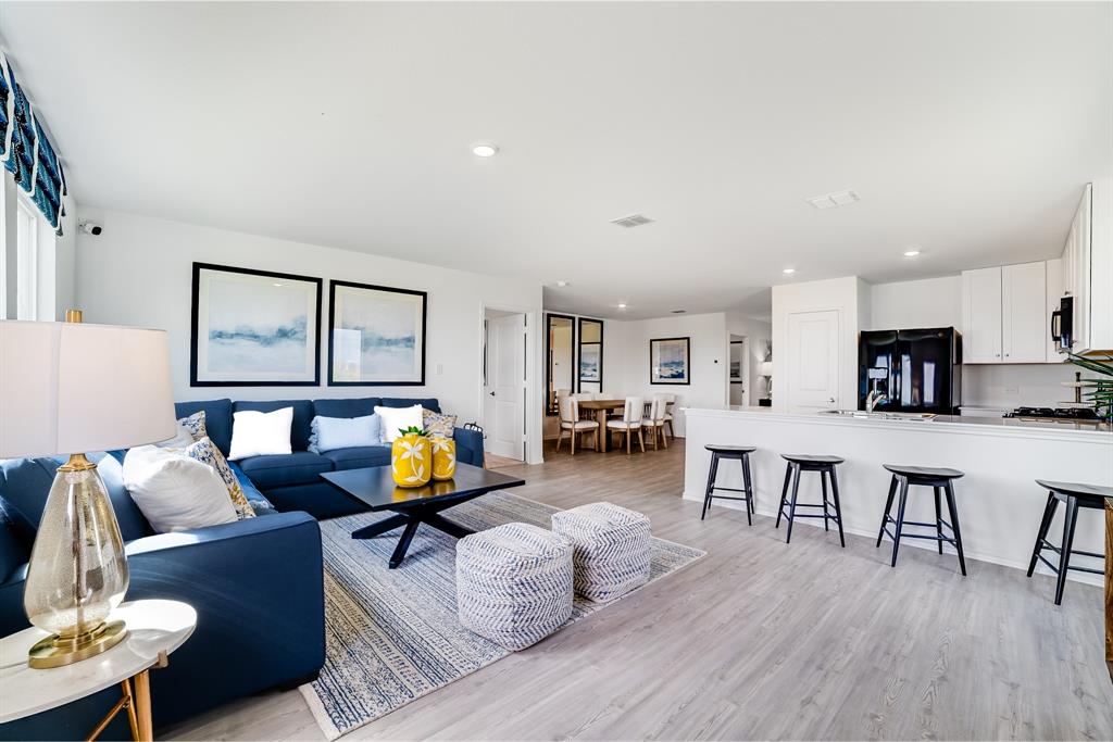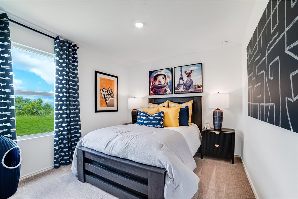 LENNAR - Carrell Hills - Oxford Floorplan - This new single-story design makes smart use of the space available. At the front are all three secondary bedrooms arranged near a convenient full-sized bathroom. Down the foyer is a modern layout connecting a peninsula-style kitchen made for inspired meals, an intimate dining area and a family room ideal for gatherings. Tucked in a quiet corner is the owner’s suite with an attached bathroom and walk-in closet. Prices and features may vary and are subject to change. Photos are for illustrative purposes only.