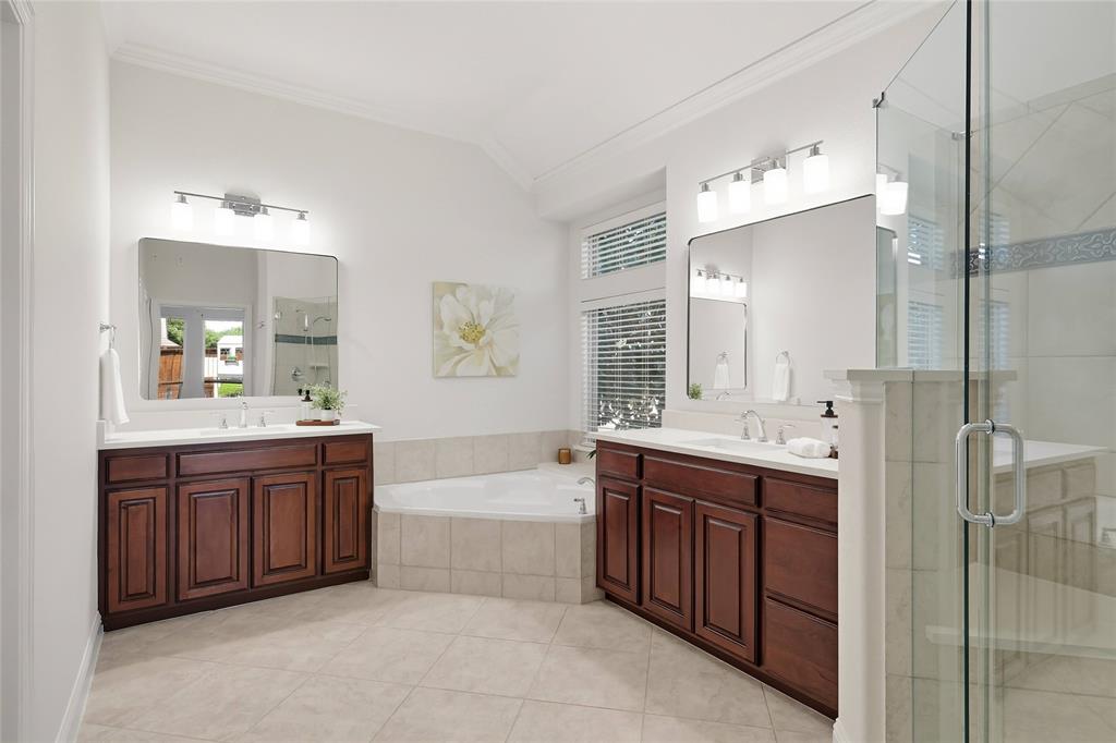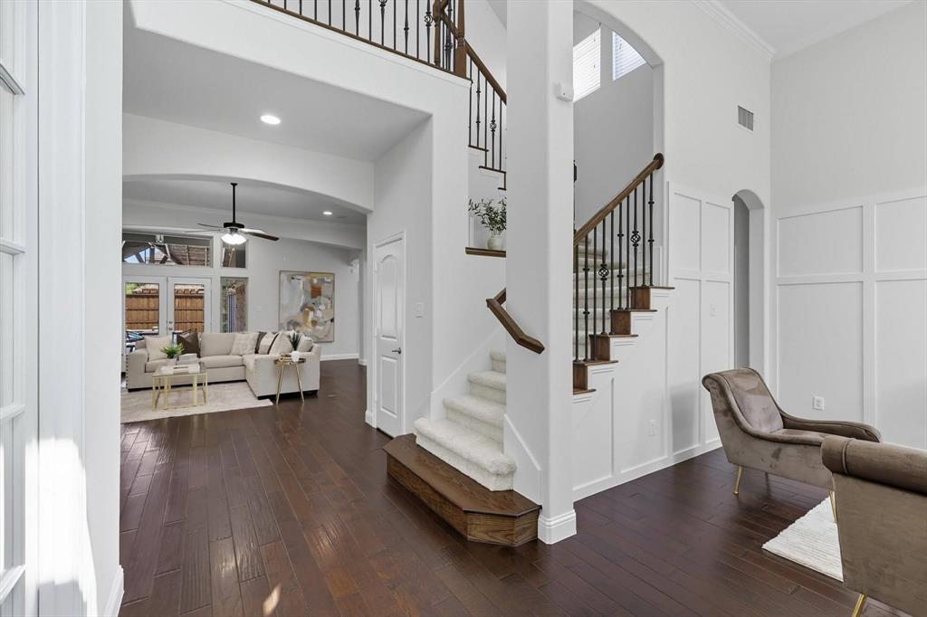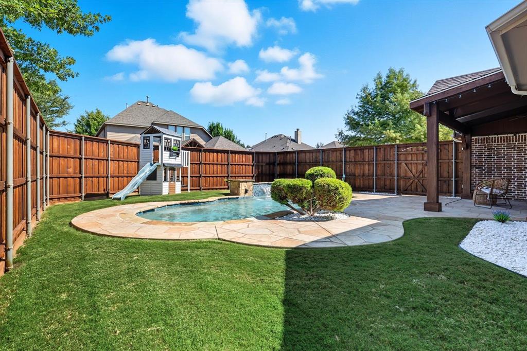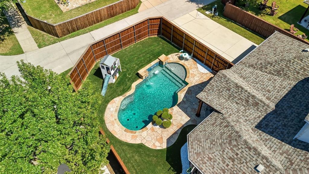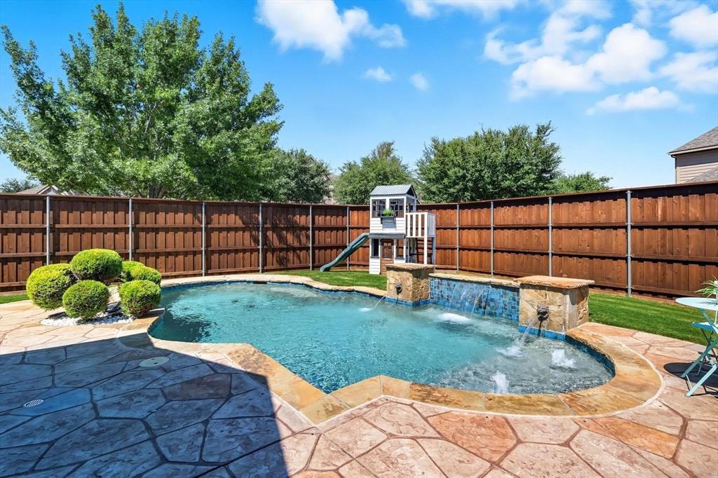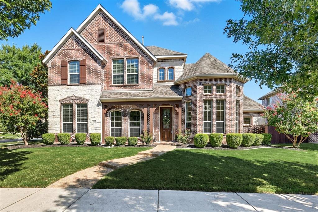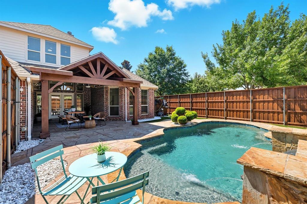 Beautifully Updated Home with Pool & Outdoor Retreat in a Prime Location. This stunning corner-lot home, across from scenic neighborhood trails, offers exceptional upgrades and timeless design throughout. With 4 bedrooms (2 downstairs), a dedicated office, and a charming front room featuring coffered walls and sunlit windows, the layout balances modern updates with family-friendly functionality. Step inside to find fresh interior paint throughout, new carpet, new hardwood floors in primary bedroom and stylishly updated main-floor bathrooms. The beautifully updated kitchen features refaced cabinets with maple doors and drawers, stunning new quartz countertops, a modern tile backsplash, and stylish new stainless-steel appliances - perfect for cooking and entertaining! The spacious living room, anchored by a stone fireplace, opens to the back patio and separates the primary suite from the rest of the home. The primary retreat offers a sitting area with pool views, and the master bath upgrades include new quartz countertops, sinks, faucets, lighting, mirrors, and frameless shower door. A second downstairs bedroom with an adjacent updated full bath provides flexibility for guests or multi generational living. Upstairs, a large game room connects to two generous bedrooms with great storage and a J&J bath. The private backyard is designed for relaxing or entertaining. Double glass doors lead to a cedar-covered patio, sparkling pool with water features, a sun shelf, and a manicured lawn for play. A removable patio safety fence adds peace of mind. Additional upgrades include whole home air purification systems (Aerus Air Scrubber), recent AC unit replacement (2022 and 2024), garage storage, whole-home surge protection and L2 EV charger outlet. Located in a welcoming neighborhood, you’ll enjoy community charm with unbeatable convenience. Just minutes from top-rated Frisco ISD schools, Whole Foods, Costco, HEB, dining, and more.